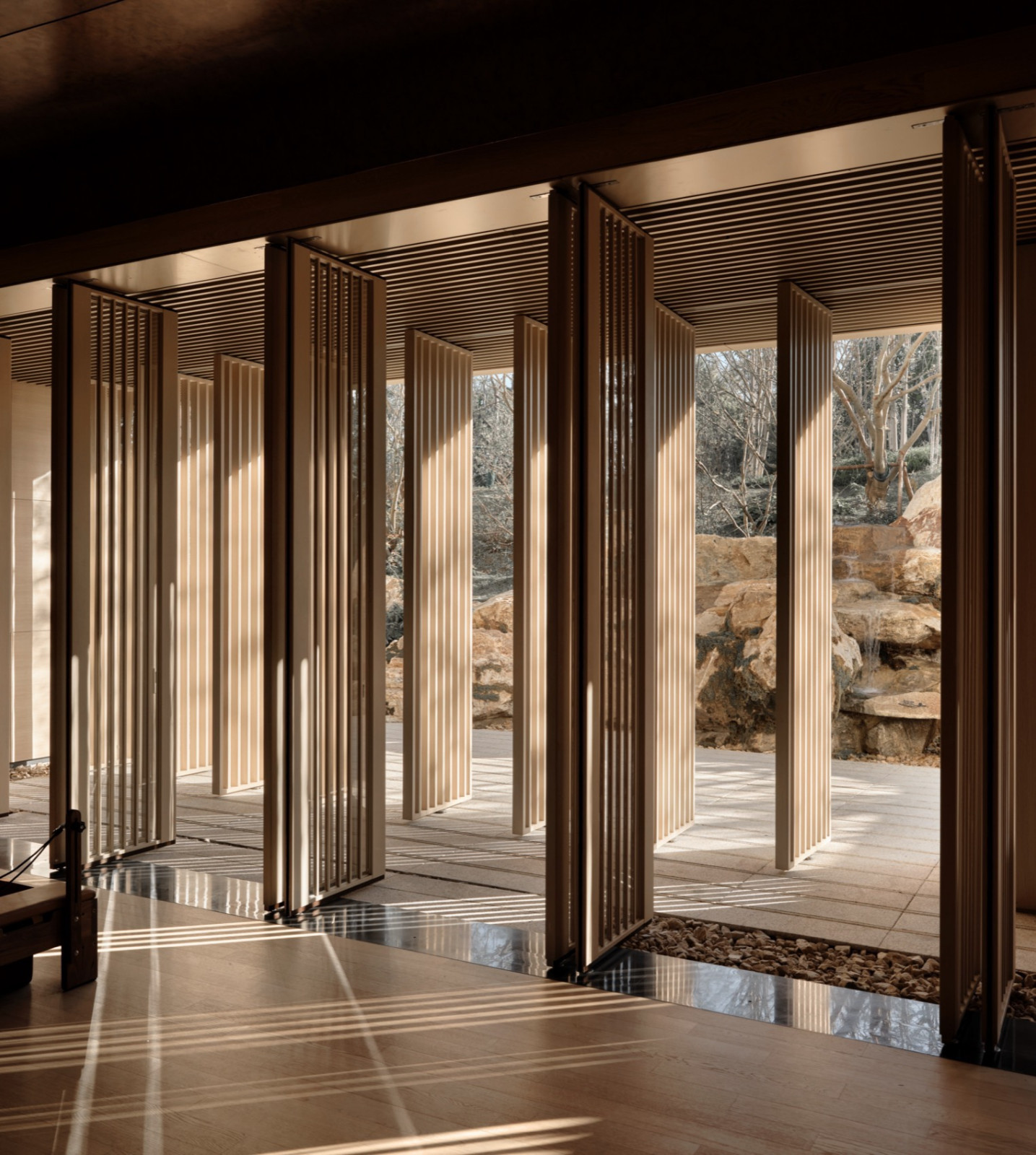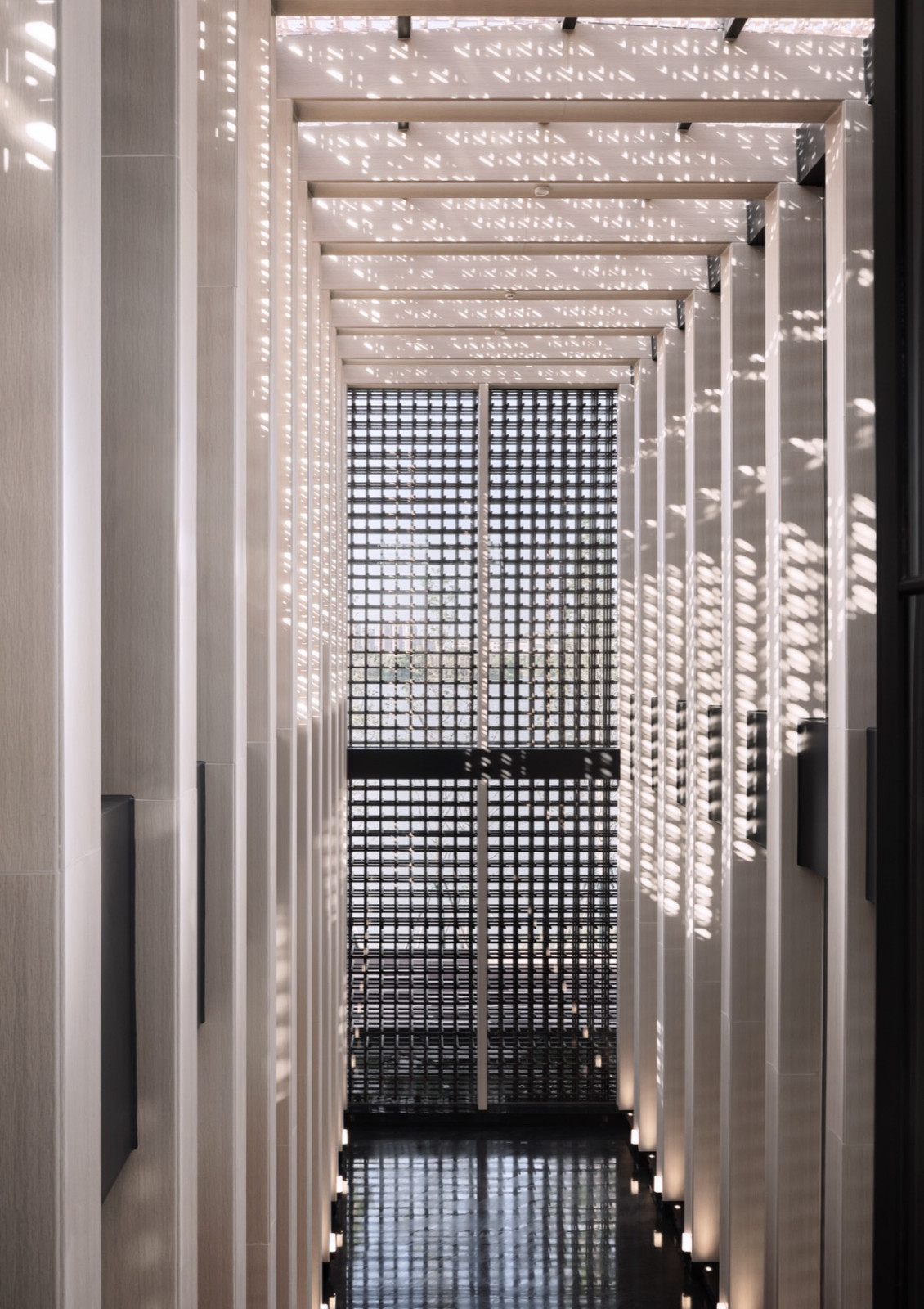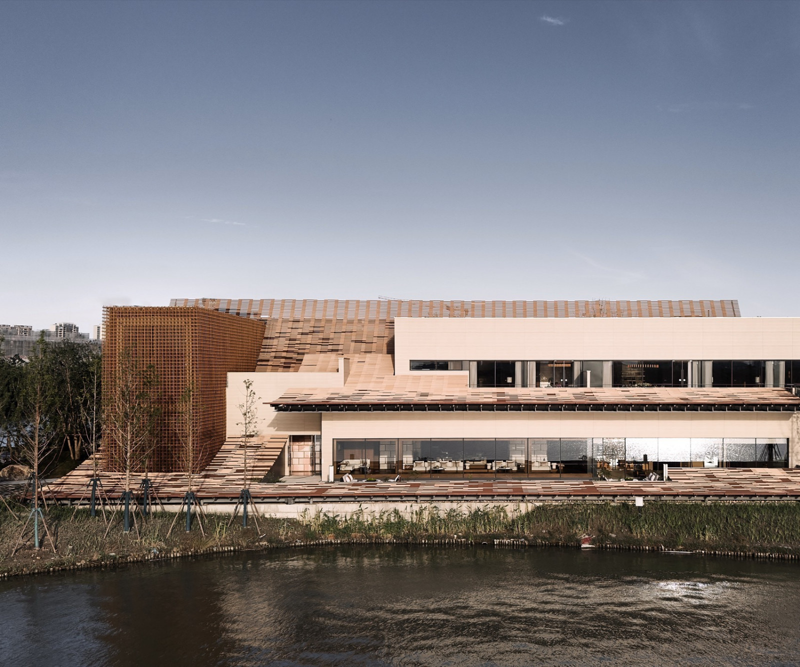 驿站将“紫藤”这一文化符号转化为可感知的空间形态,建筑在面向紫琅新天地一侧,以紫藤花架为原型,采用耐候重组竹材以方格模块搭建了一个矩形通高的精神空间,契合紫藤藤蔓攀援的态势,呼应紫藤“向上而生”的姿态。方格模块组合形成精细轻盈的表皮,阳光穿过网格间隙,洒下流动的光影,观者仿佛漫步于百年紫藤花下,实现自然与文化体验的双重共鸣。竹材特有的自然纹理、温润质感与坚韧属性,与紫藤的 “自然之美”、“坚韧之性” 形成呼应,成为南通企业家精神的纪念性空间与传播载体...
