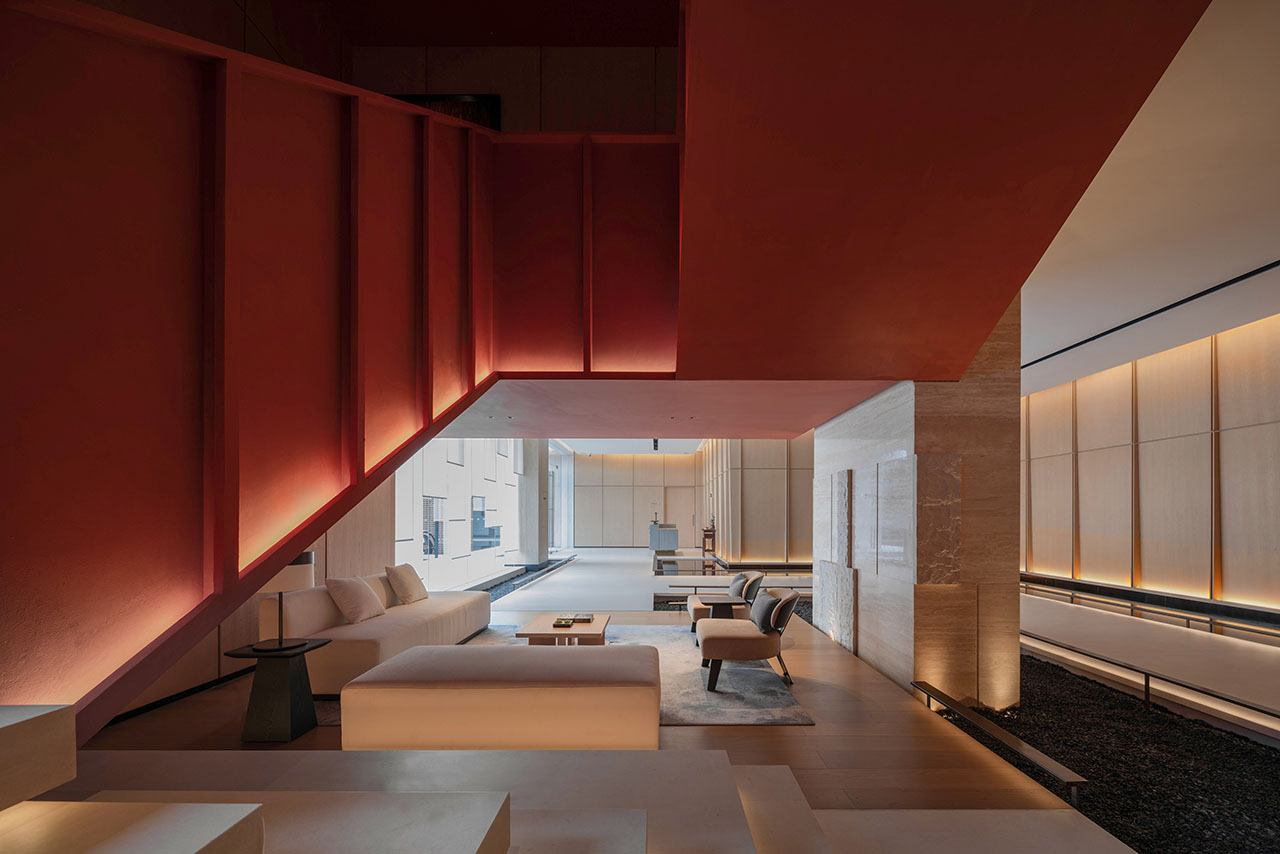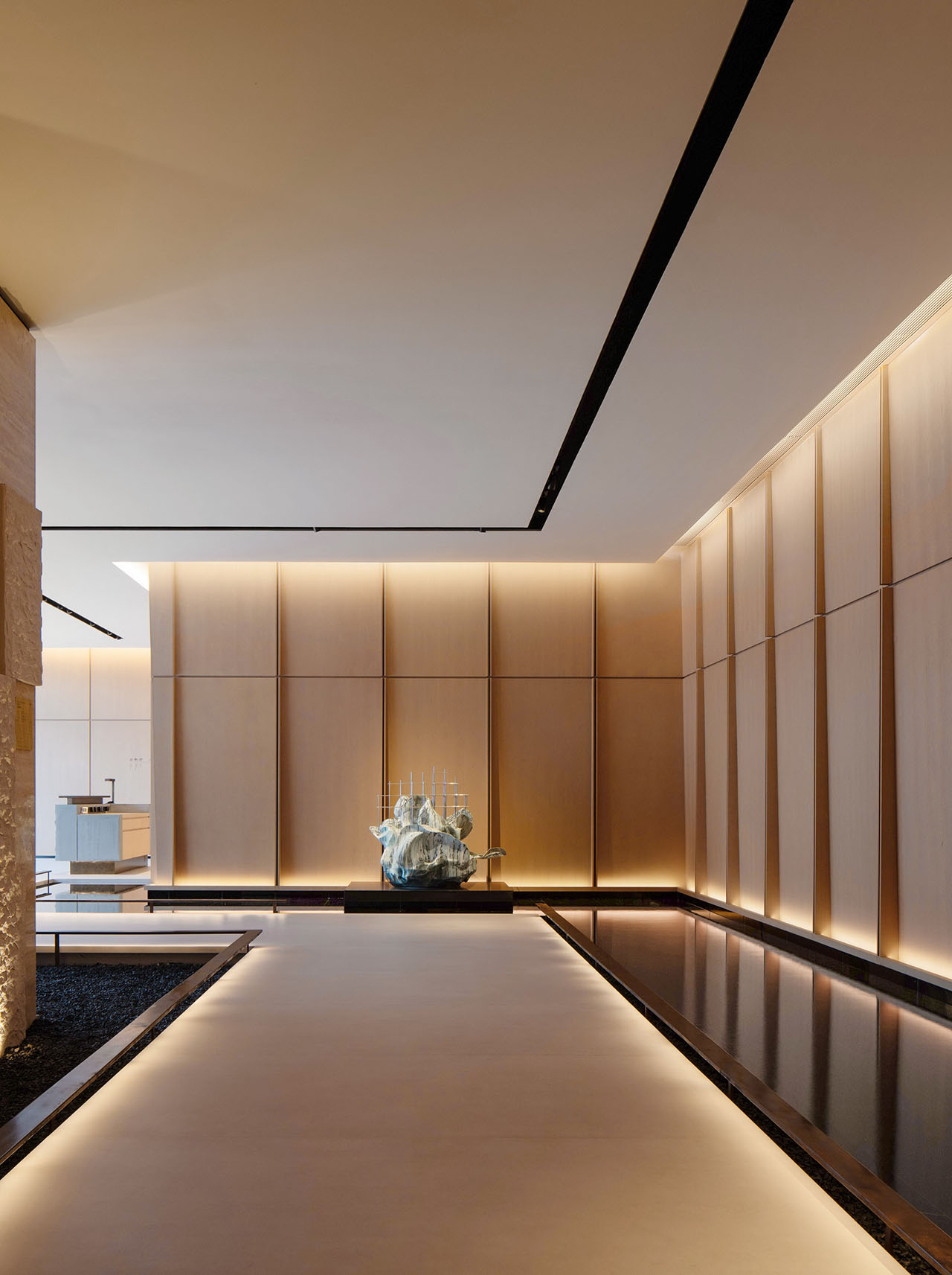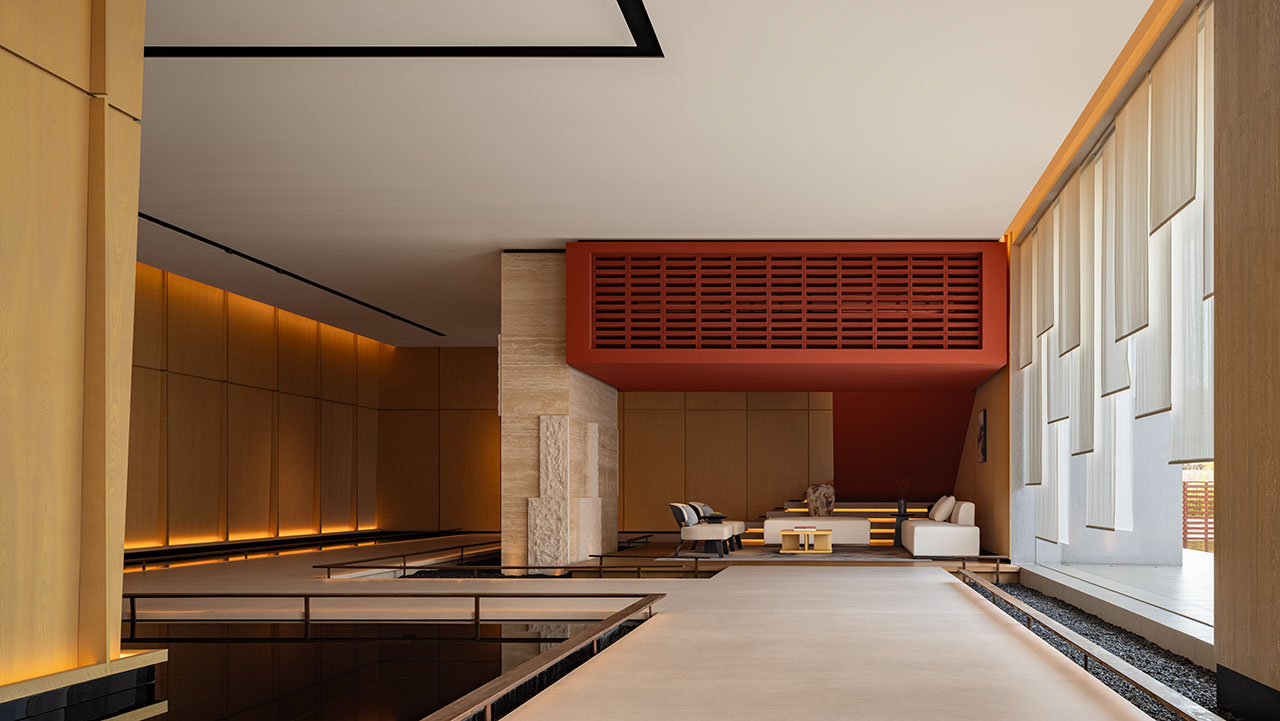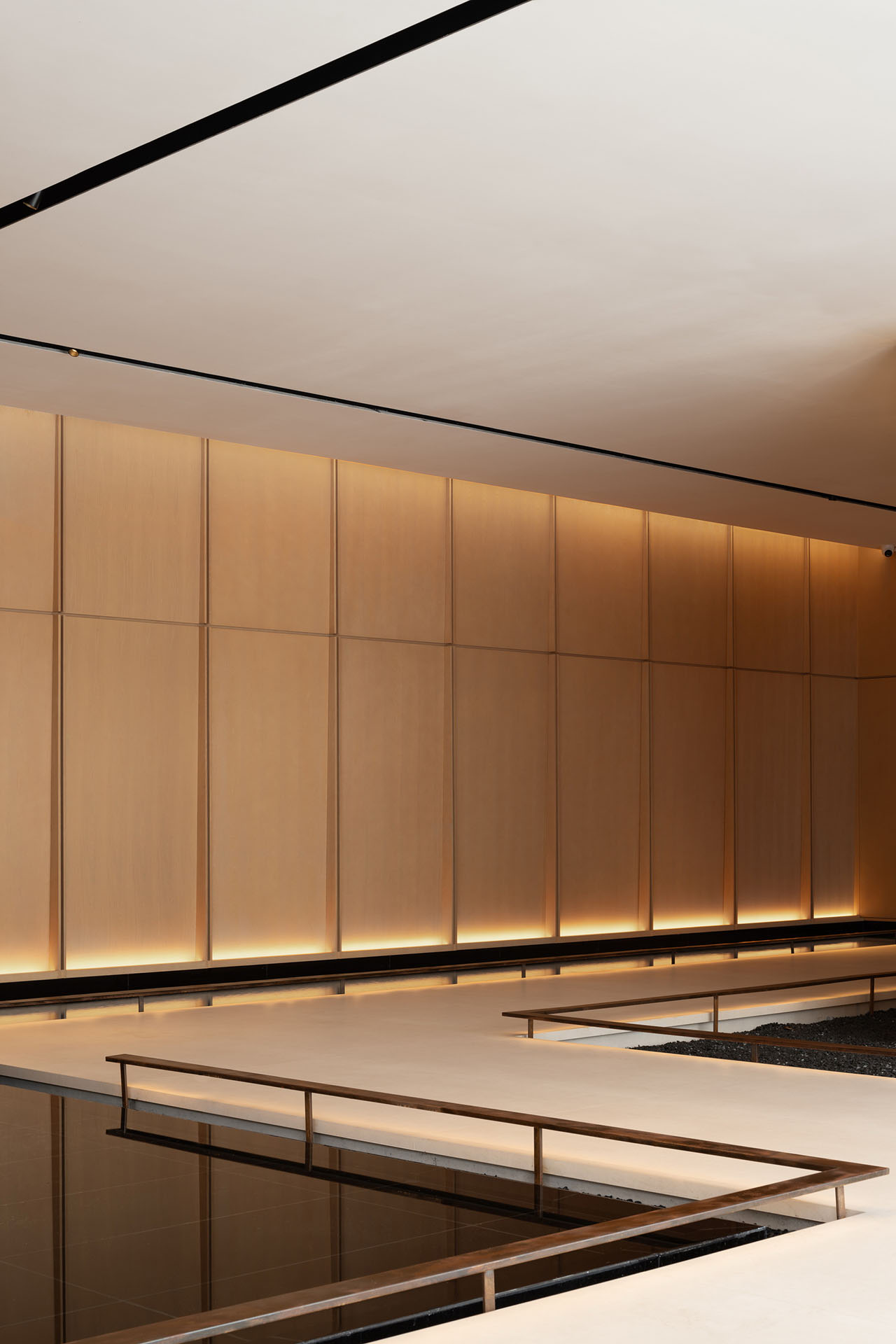 通过红墙的限定,趟过水上的栈道进入室内接待大厅,庭院的水景连接到室内,成为一个无界的整体,微微倾斜的木饰面墙体随着曲折蜿蜒的步道倒影在水中。灯光从水下向上漫射,照亮木饰面的纹理,让墙体仿佛 “悬浮于水面”,进一步强化了空间的轻盈感。低矮的凭栏照亮了漂浮水上的栈道,引导着人们追随着灯光继续探索游园。