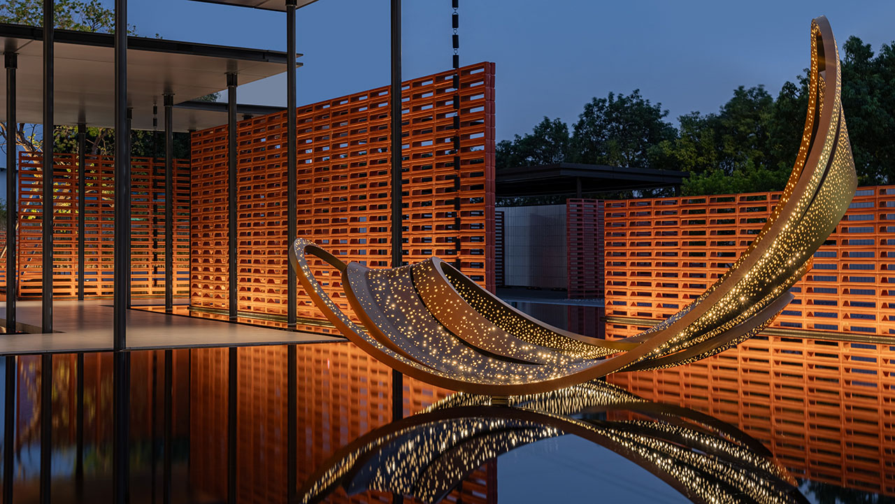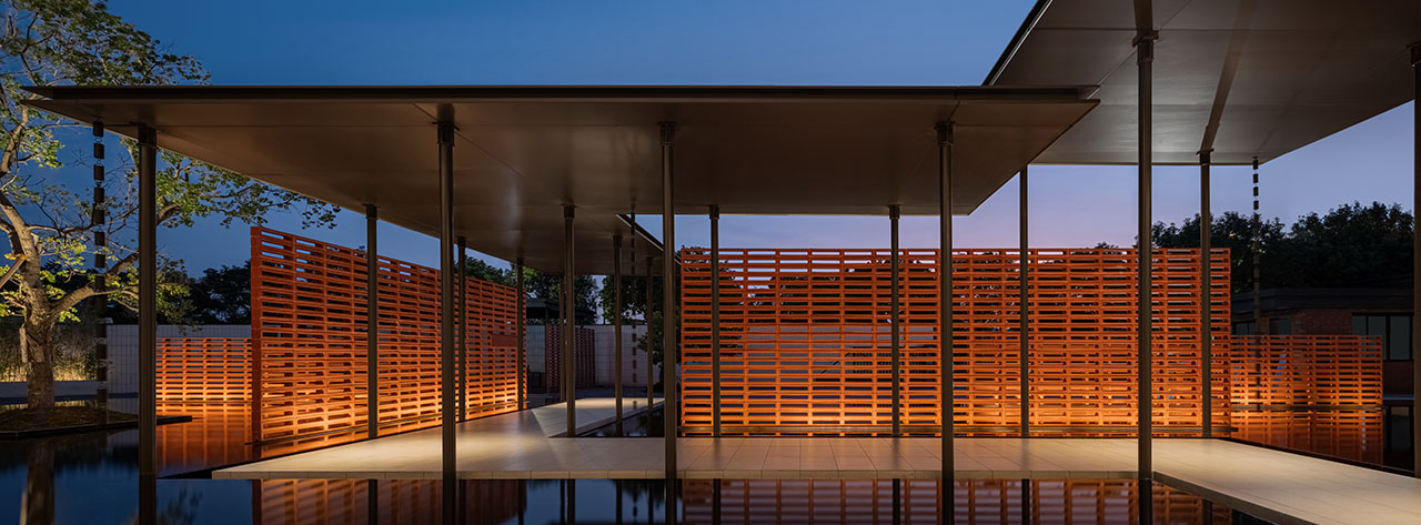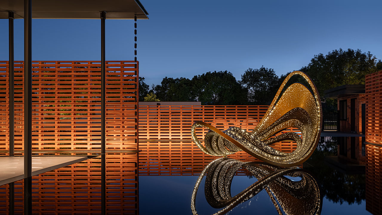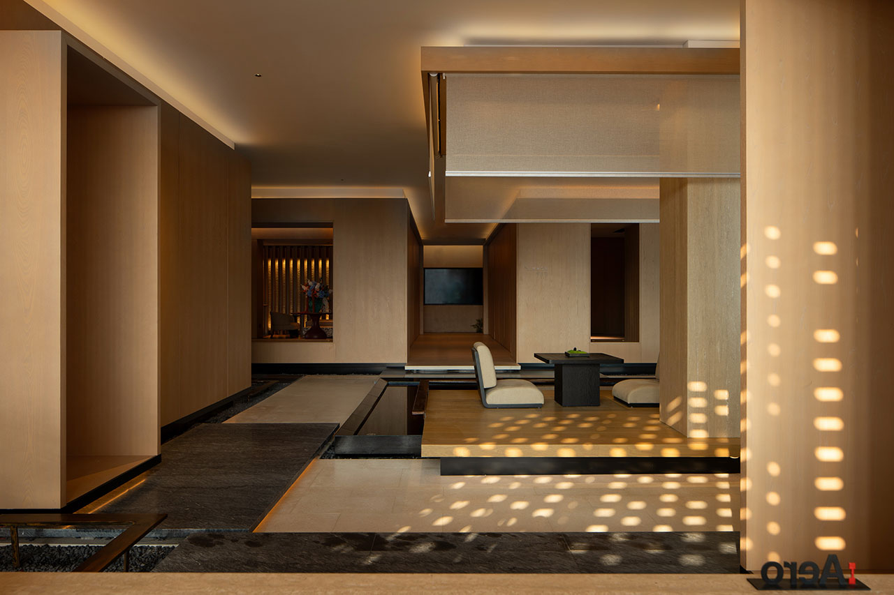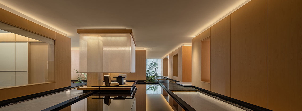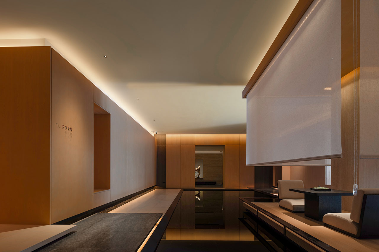 通过红墙的限定,趟过水上的栈道进入室内接待大厅,庭院的水景连接到室内,成为一个无界的整体,微微倾斜的木饰面墙体随着曲折蜿蜒的步道倒影在水中。灯光从水下向上漫射,照亮木饰面的纹理,让墙体仿佛 “悬浮于水面”,进一步强化了空间的轻盈感。低矮的凭栏照亮了漂浮水上的栈道,引导着人们追随着灯光继续探索游园。