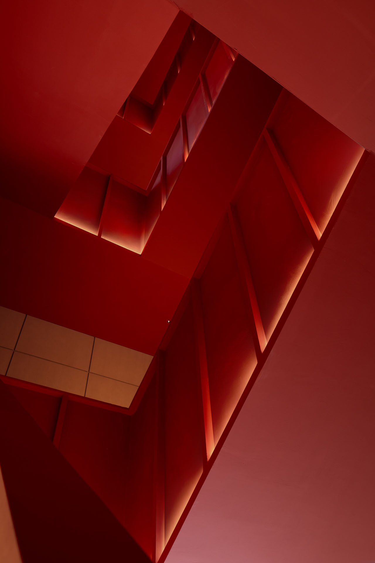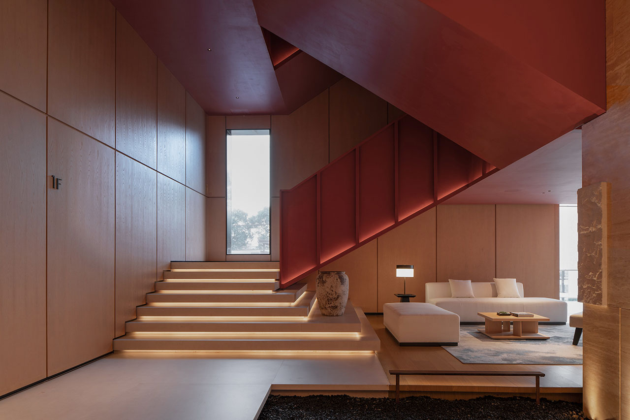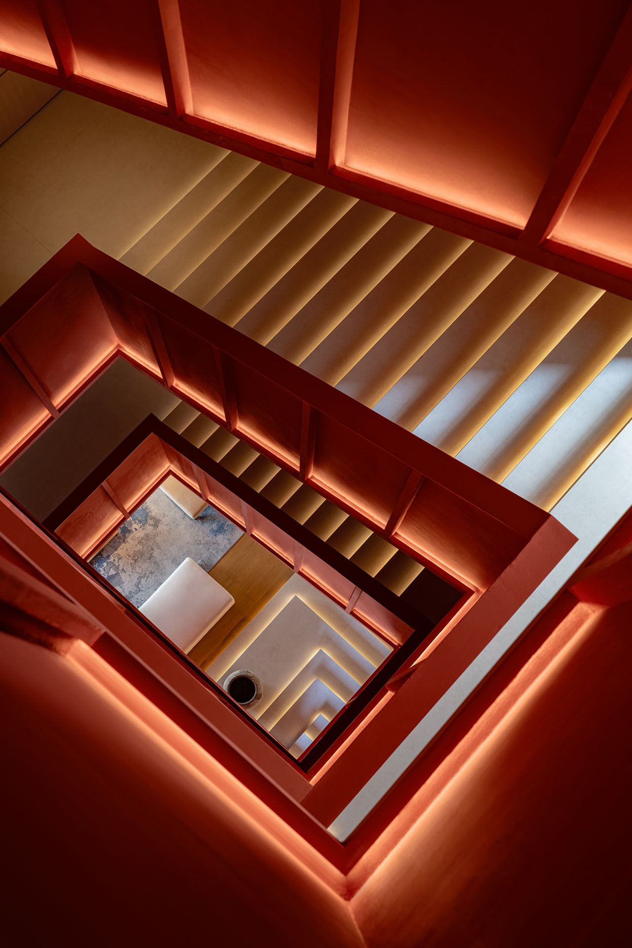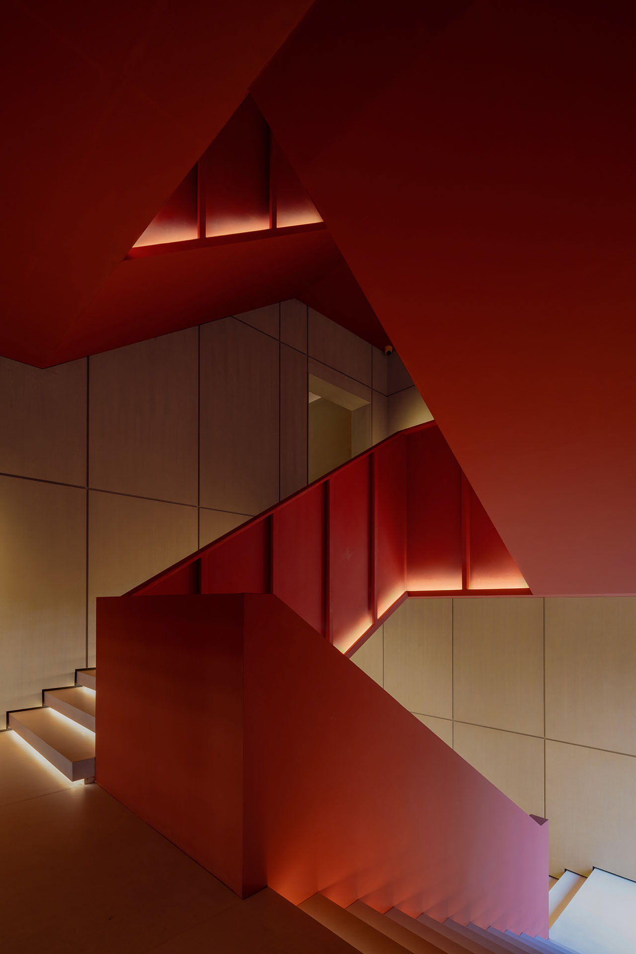 当动线行至庭院深处,一条极具雕塑感的红色楼梯成为空间叙事的 “转折点”—— 螺旋上升的形态不仅强化了垂直交通的引导性,色彩上也对艾罗主题品牌色调产生了强烈的呼应。