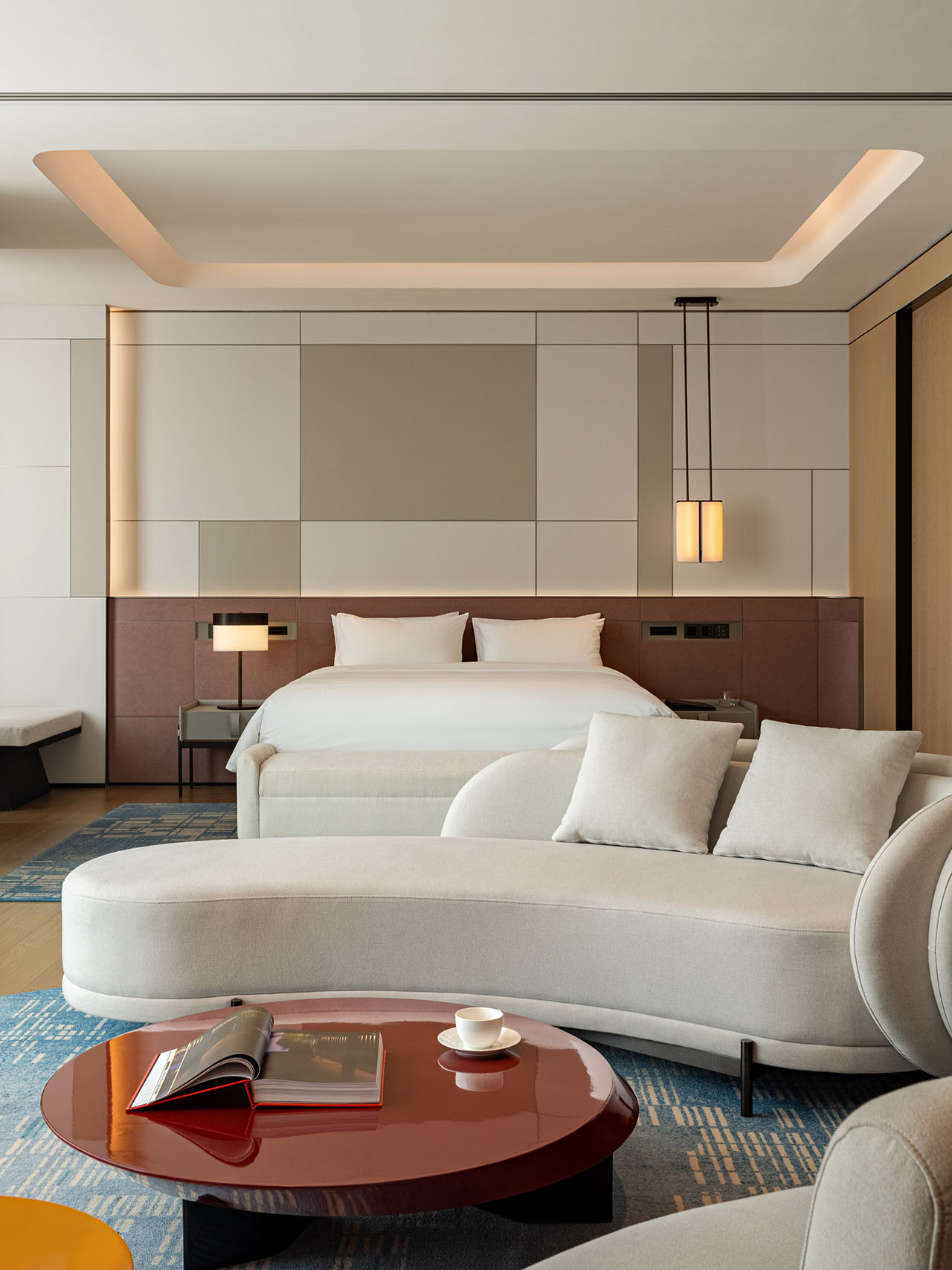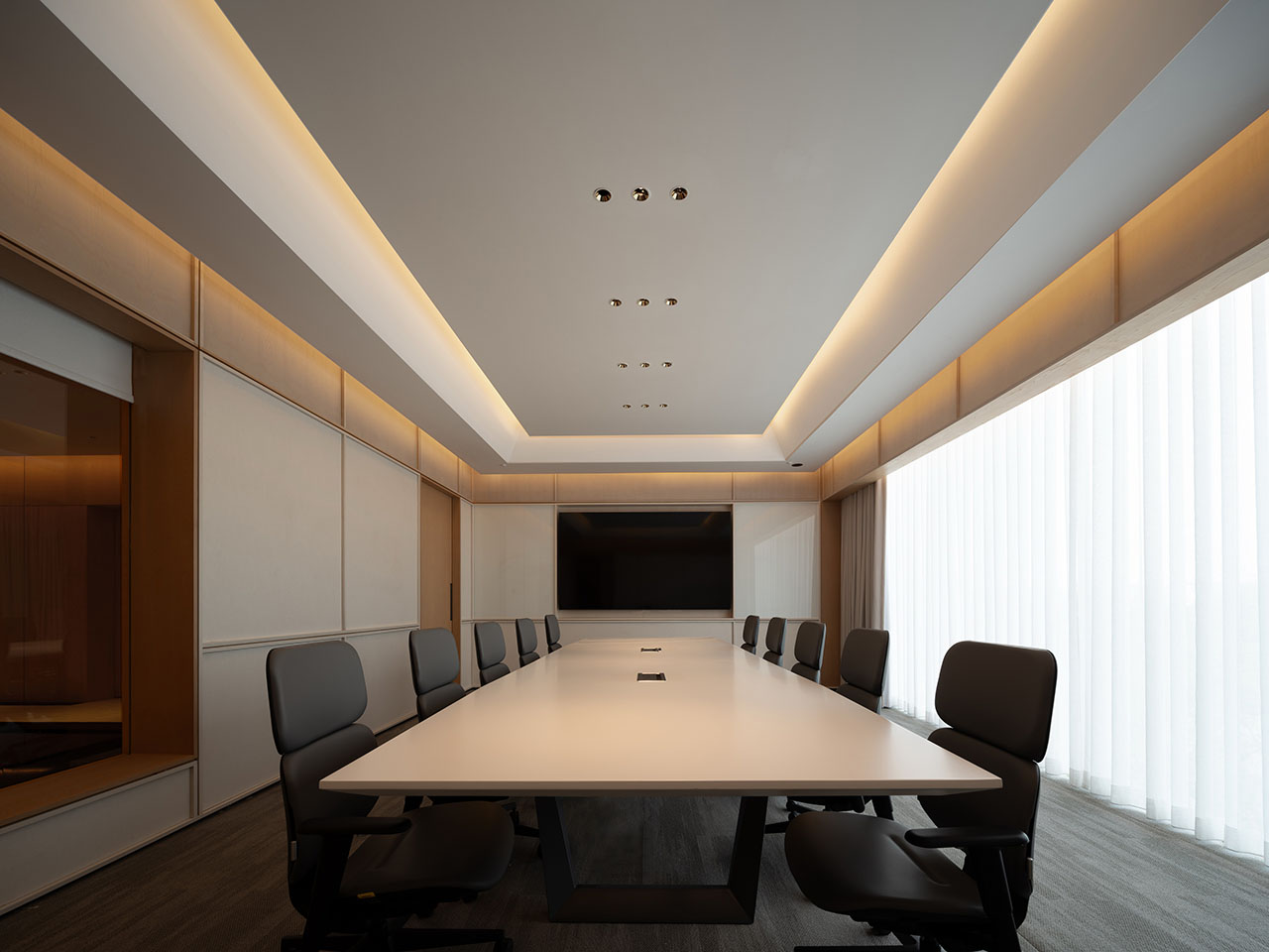 围绕水院,我们布局了以五星级酒店核心功能区为原型的 “微缩光影剧场”,包括商务会议、行政酒廊、度假客房、商务宴会等功能空间。这些空间并非孤立的展示区,而是与办公功能深度融合 —— 行政酒廊同时承担客户洽谈功能,会议室搭载与酒店宴会厅同源的智能照明系统,办公区散落在水院周边,让员工与客户都能在 “酒店式场景” 中工作、沟通。我们希望通过这种布局,传递一种松弛感,让商务活动在写意自在的氛围中自然发生。