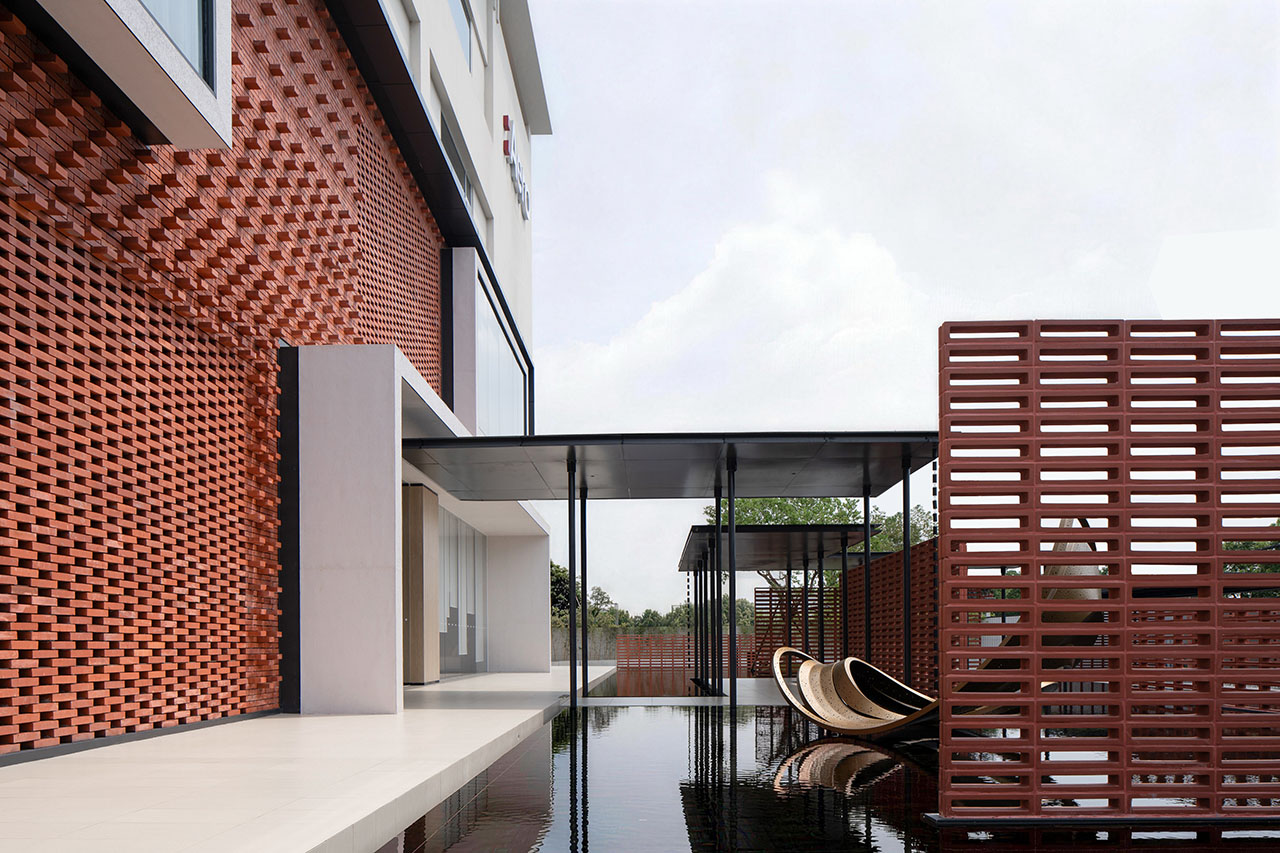 “木盒” 之间,围合出静谧的水院 —— 外立面的侧墙透过红砖的缝隙,光影从室外渗入室内,地面与墙面投射出 “星点光斑”,这些光斑随太阳高度角变化而移动,形成 “光的步道”。