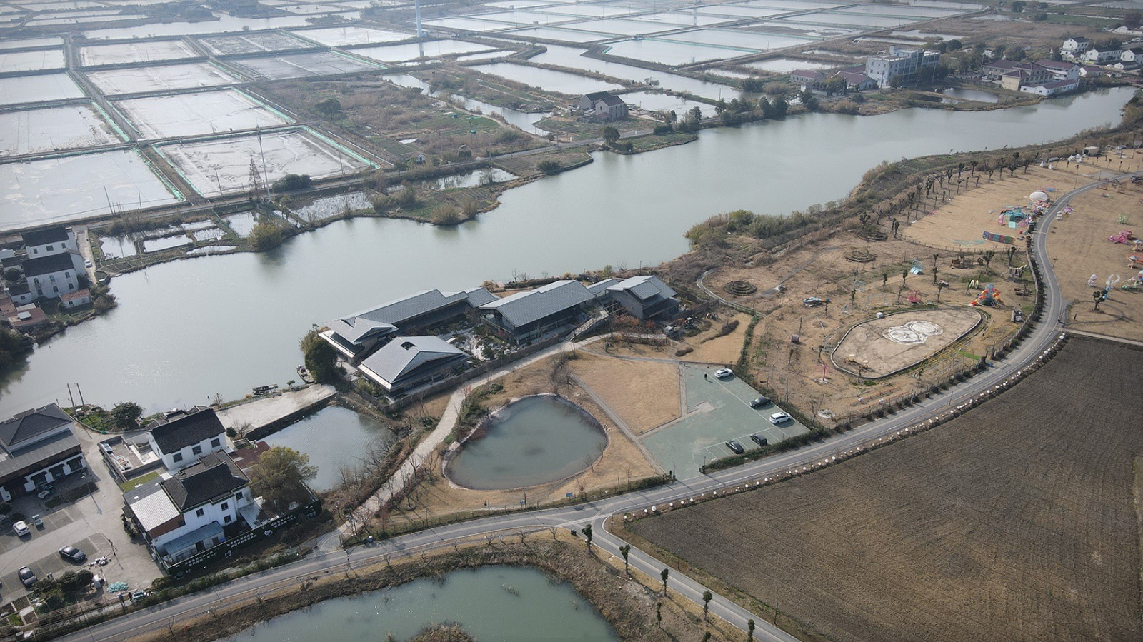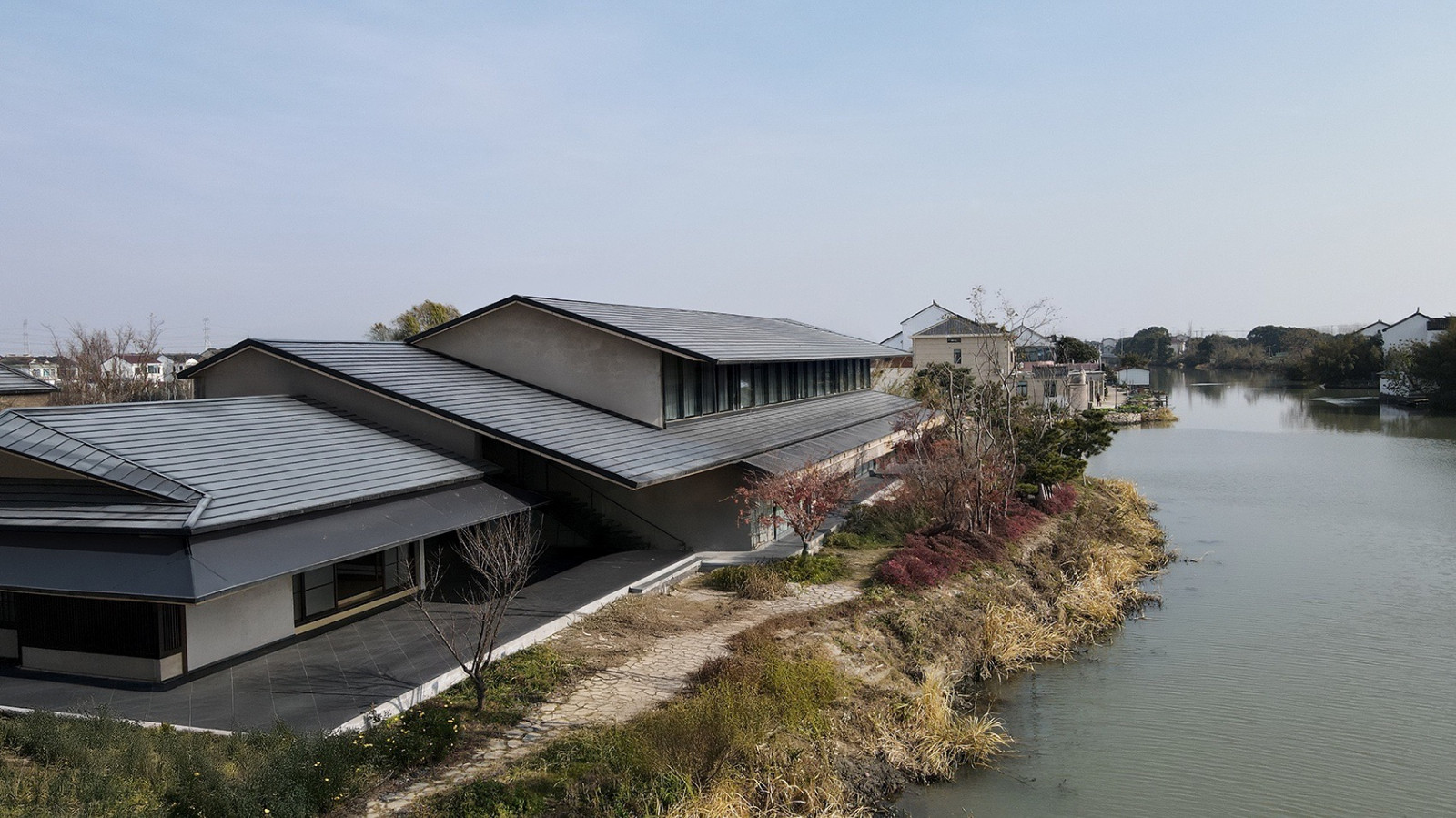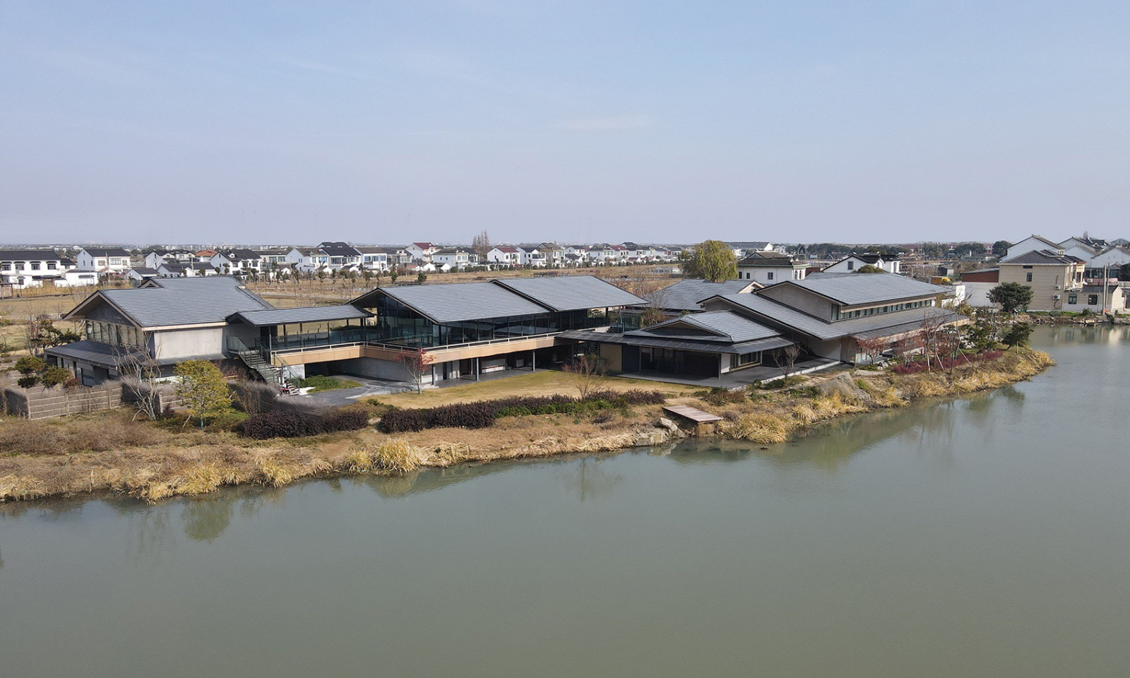 阳澄湖北岸,消泾村静卧于蟹池环绕的洼地。建筑沿河平行展开,平缓屋顶与深檐引导湖风穿堂入室,水面波光经檐下折射,在室内泛起粼粼光影。