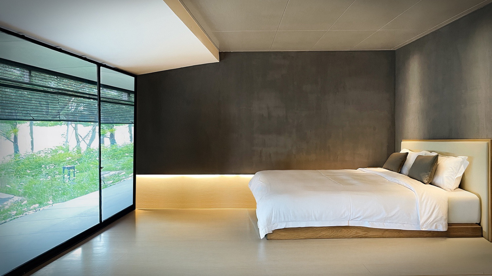 外墙以当地土壤烧制硅藻泥,随岁月沉淀色泽,默默调节着湖畔的湿度。18间客房通过雁行式回廊相连,如一座座独立小院错落布局。回廊环绕两座水池庭院,每走一步,视线都在变化——借景、框景,将南侧小河与自然风貌纳入其中。