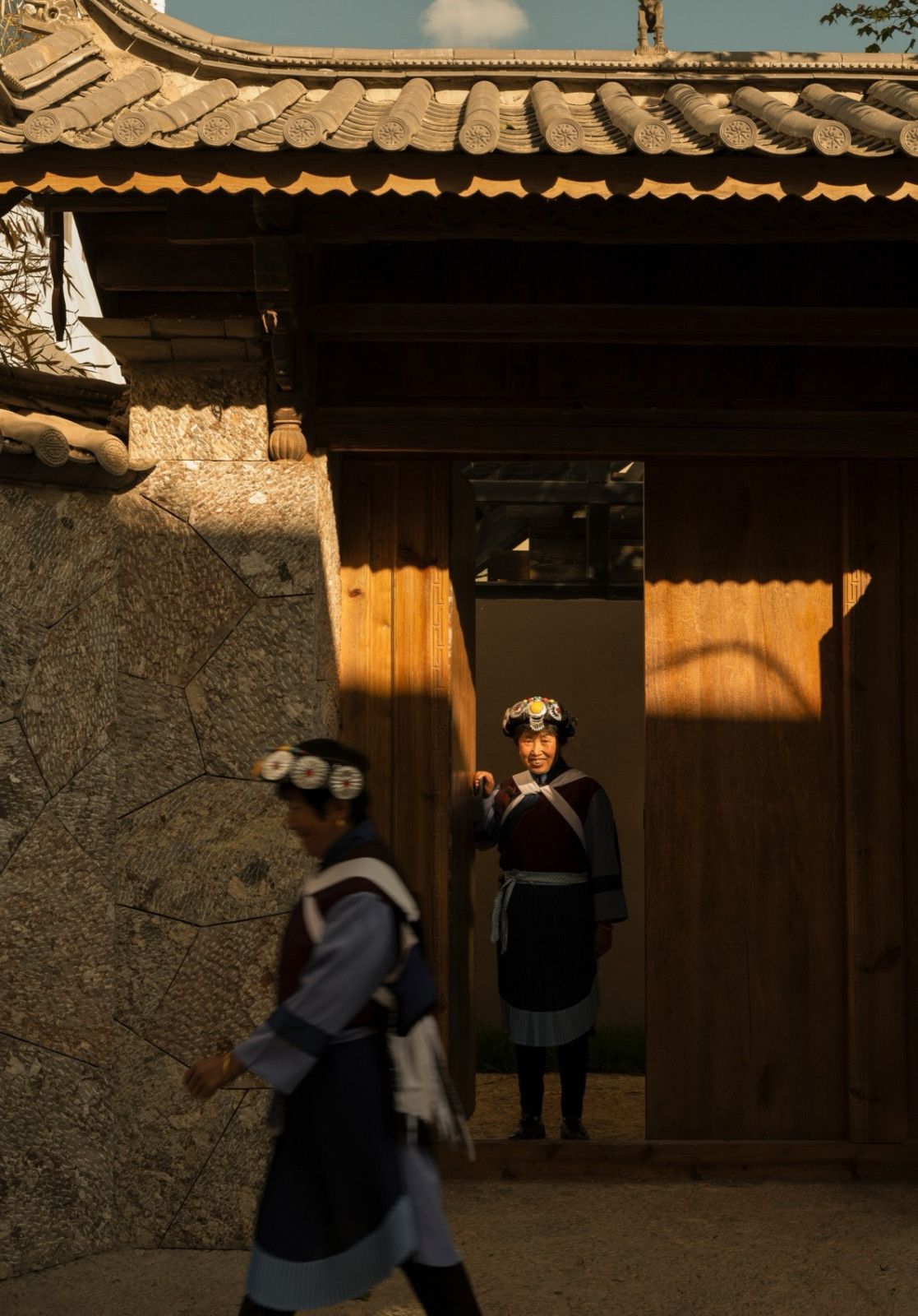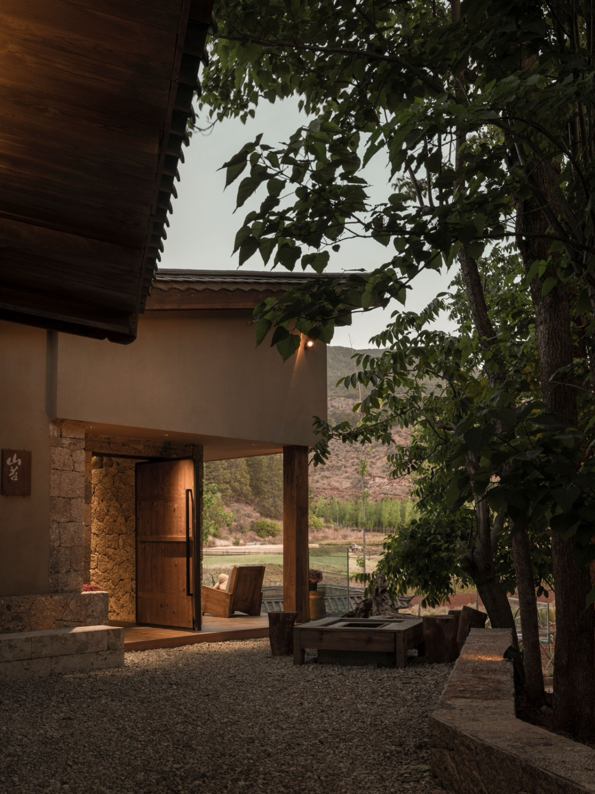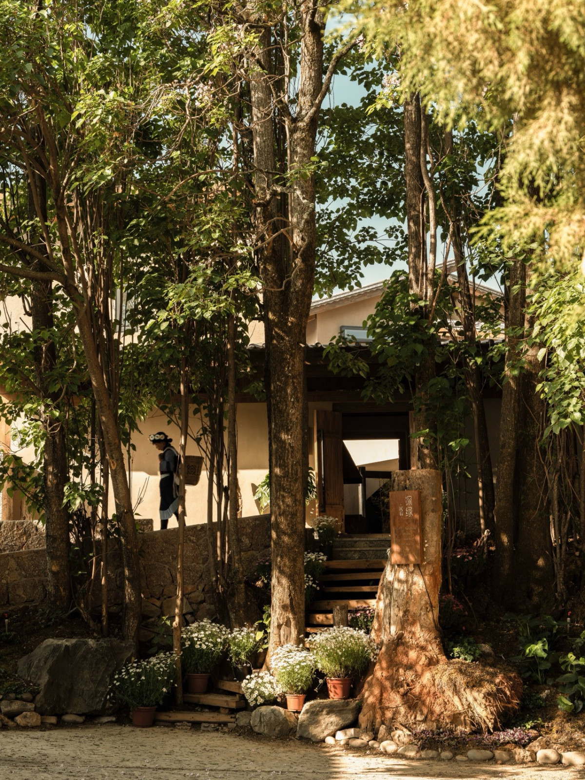 丽江束河古镇,一片楸树林环抱着由纳西族民居改建的深绿民宿。当地五花石手工垒砌的墙面温润亲和,错落的建筑由石板路相连,隐于绿荫。