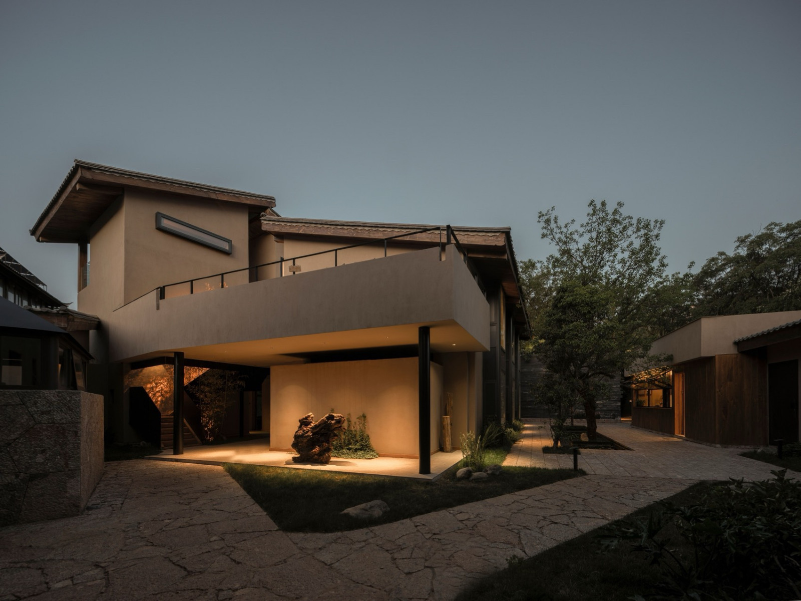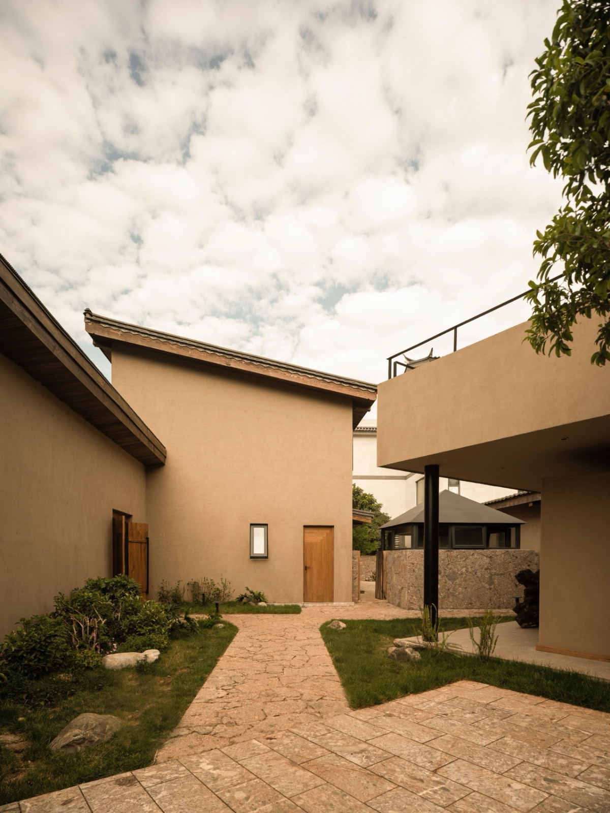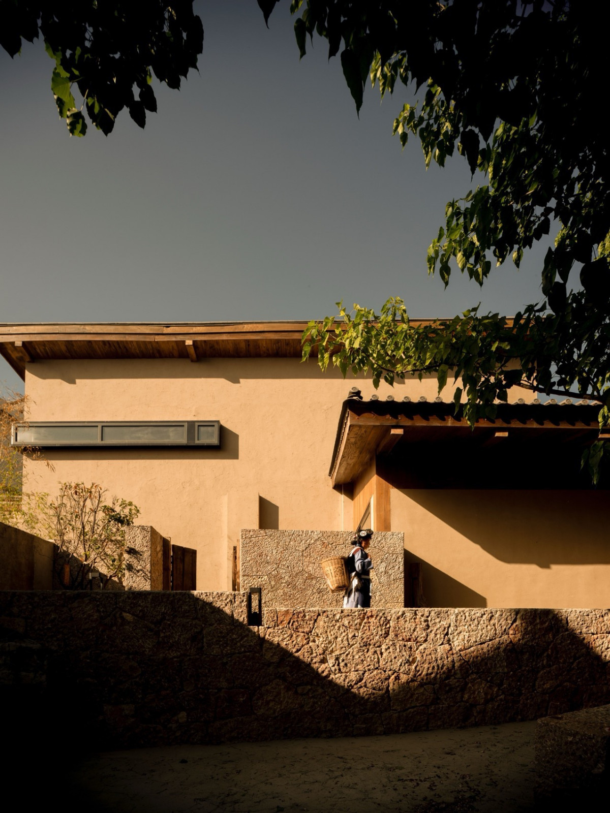 丽江束河古镇,一片楸树林环抱着由纳西族民居改建的深绿民宿。当地五花石手工垒砌的墙面温润亲和,错落的建筑由石板路相连,隐于绿荫。