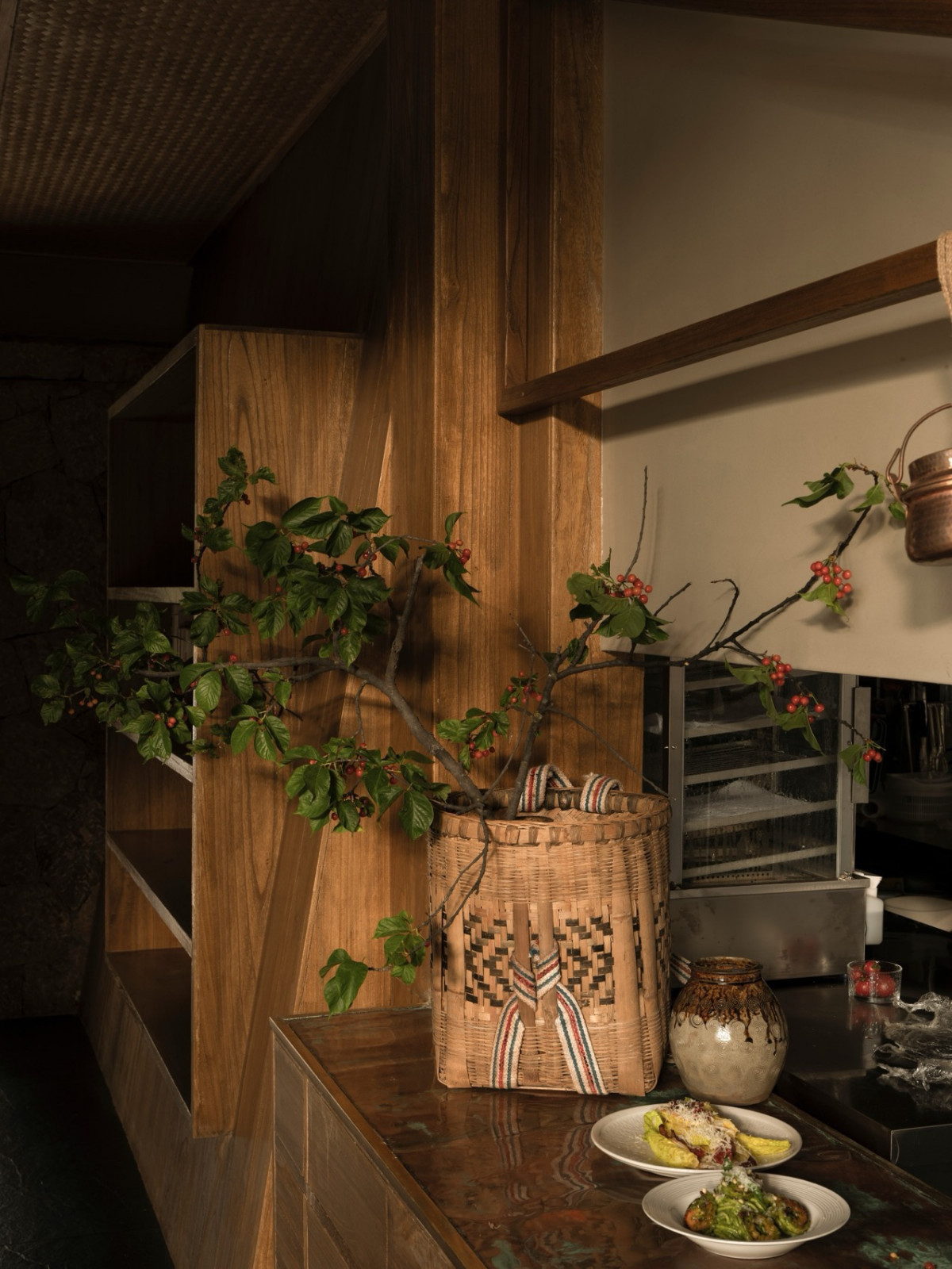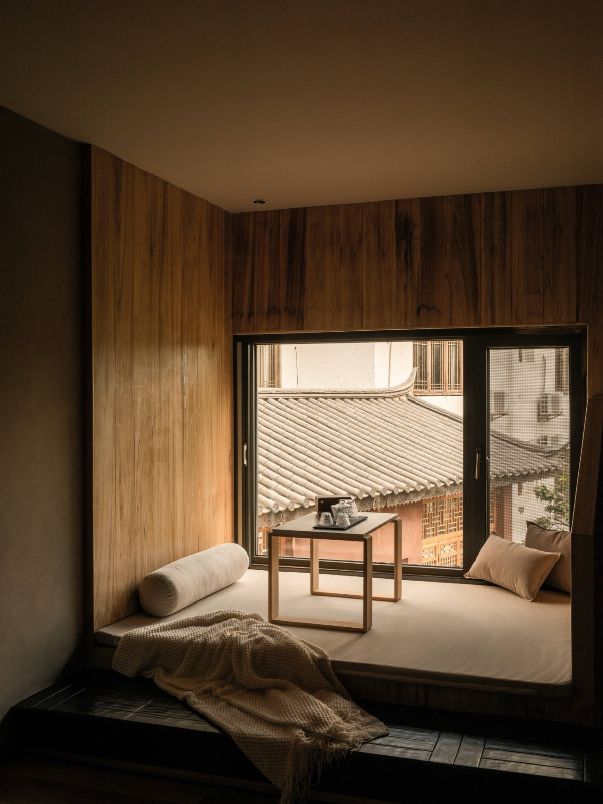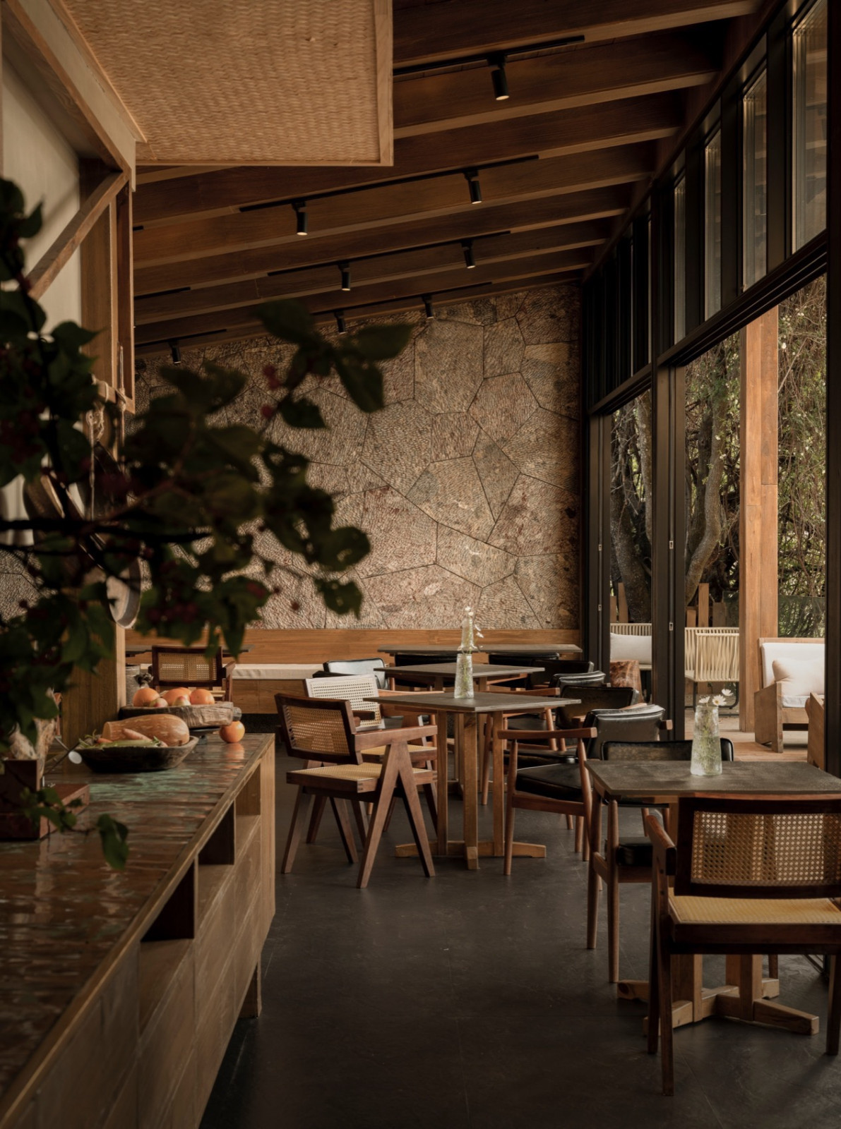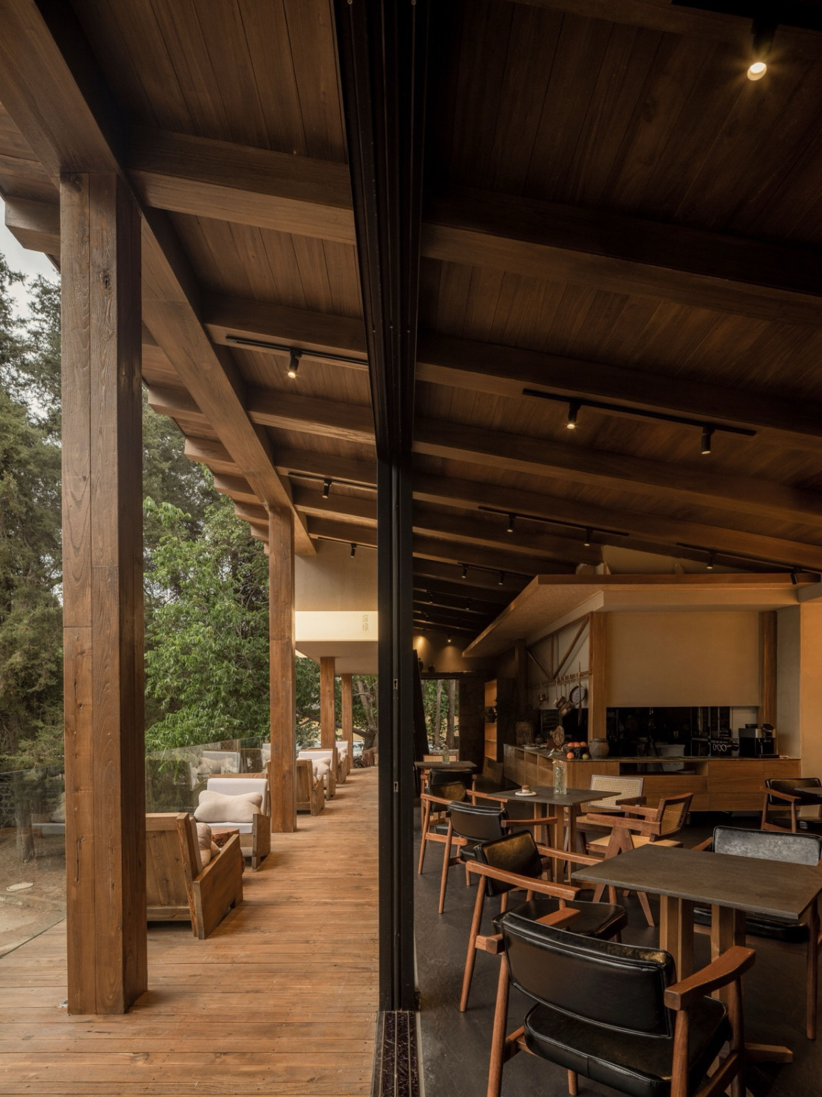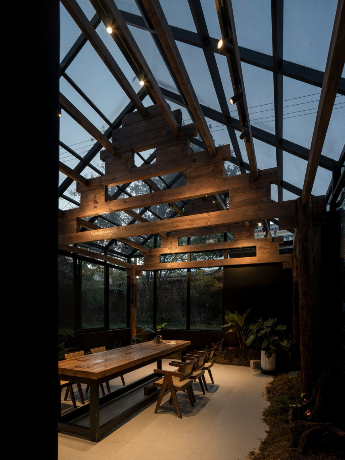 后院茶室“溪竹”取自肆意生长的竹子,清风拂过,溪水环绕。老房梁被完整保留,玻璃屋顶护着它,雨季时内在安静,阳光时植物舒展——主理人谓之“植愈”,有生命的物件,需要被看见、聆听。
