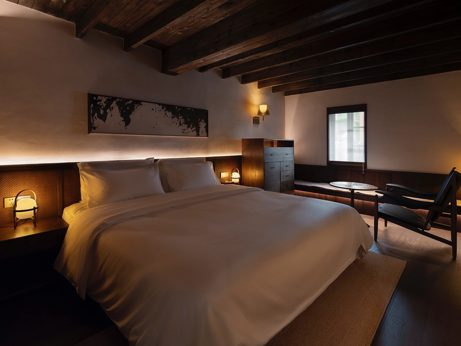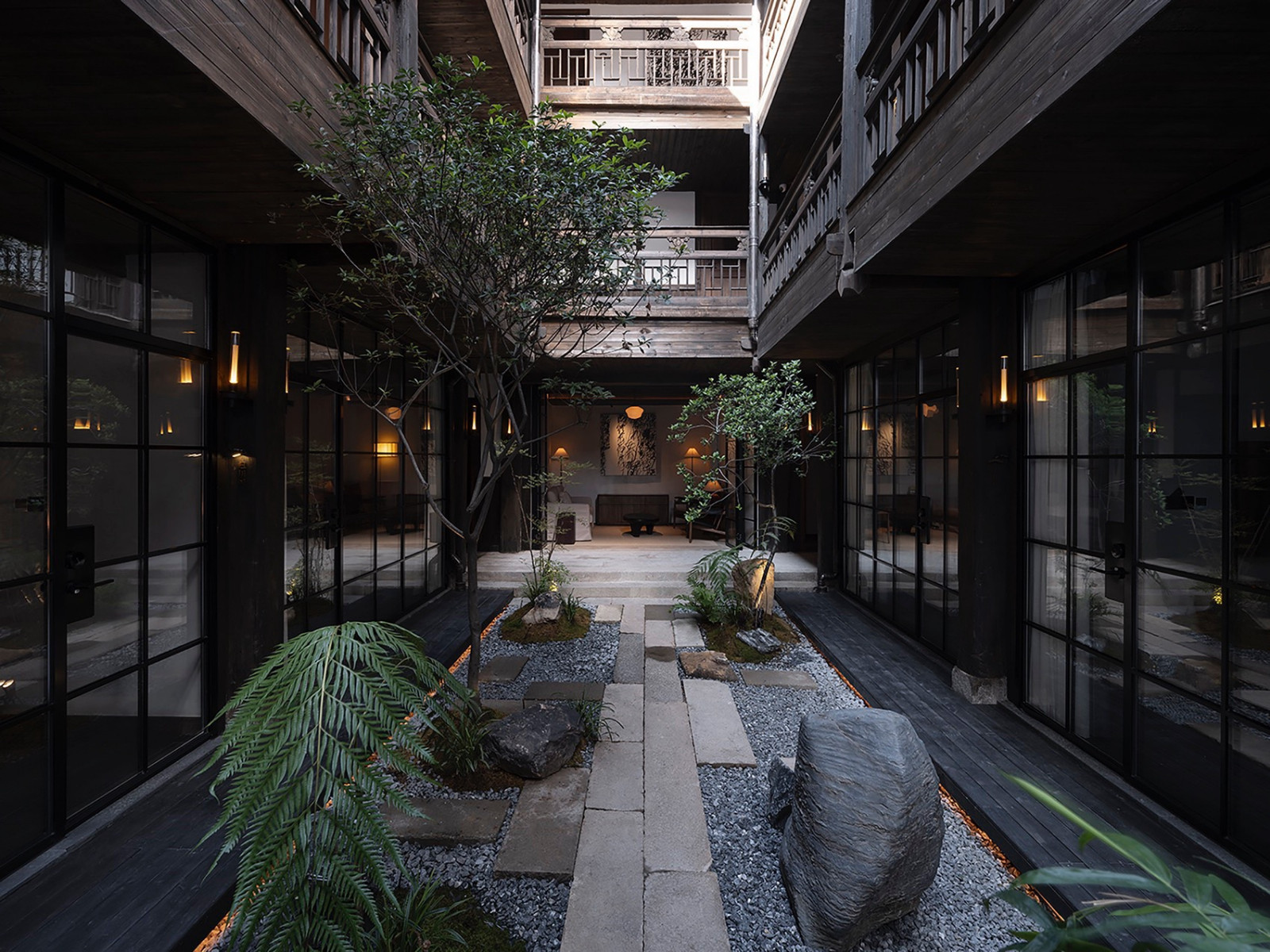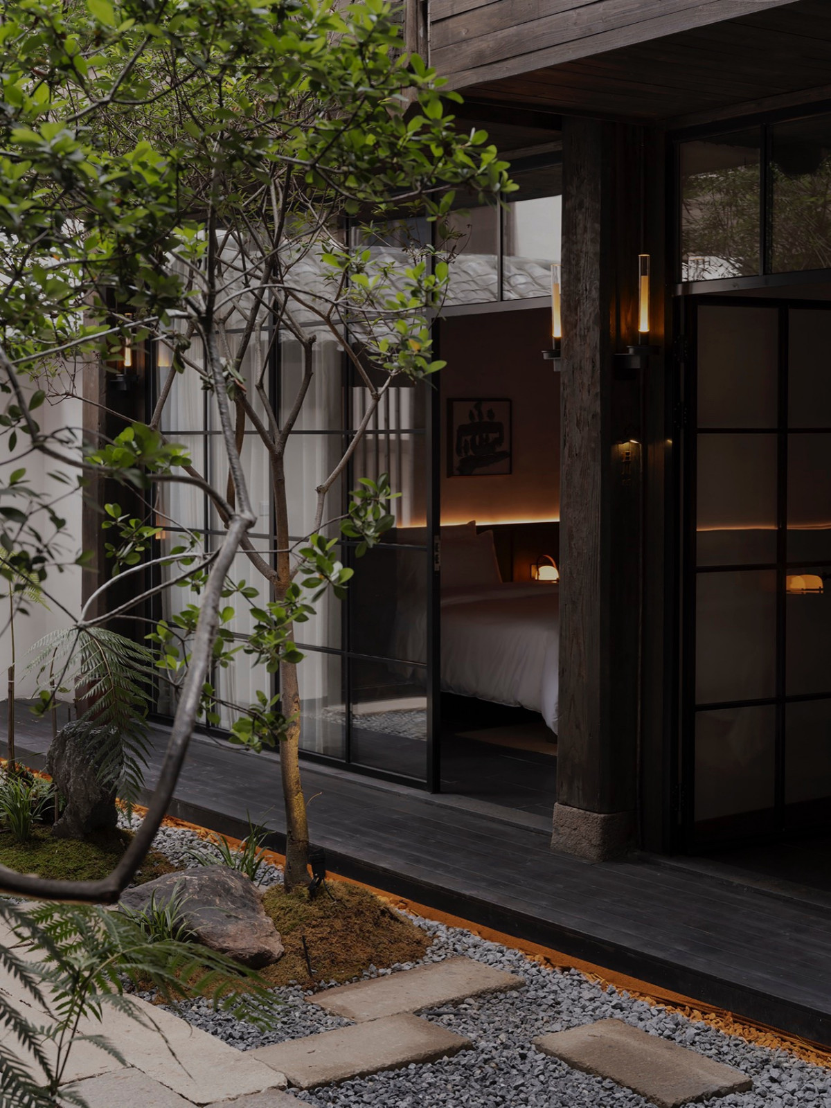 跨入酒店,喧嚣悄然褪去。登记前台空间安静,木质气息萦绕,视线从纷杂归于聚焦,脚步不自觉放缓。穿过斑驳钢板移门,外界彻底隔绝——客房围绕庭院铺展,静谧扑面而来。