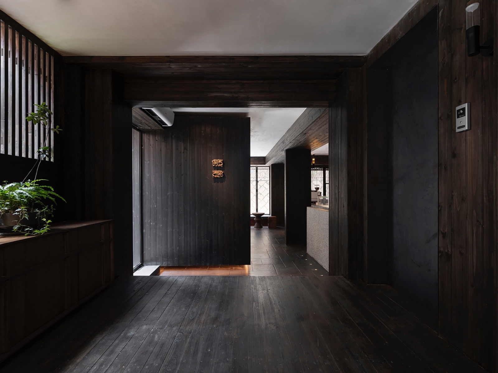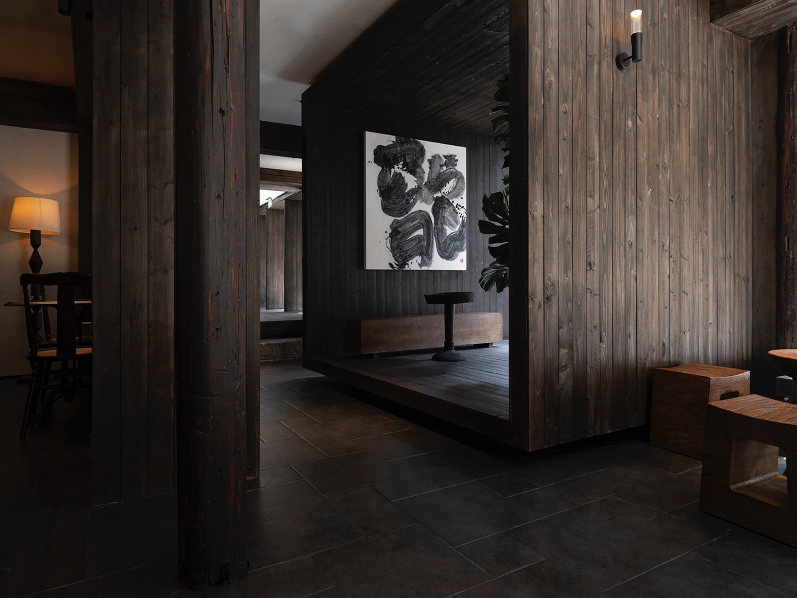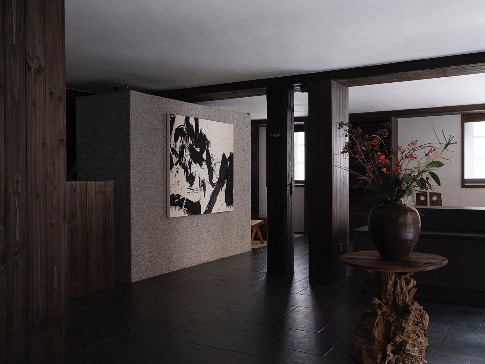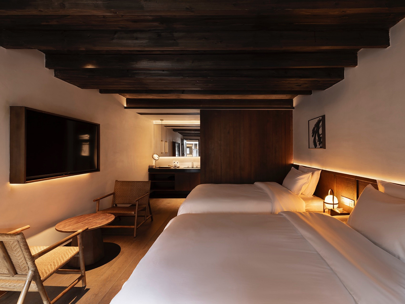 跨入酒店,喧嚣悄然褪去。登记前台空间安静,木质气息萦绕,视线从纷杂归于聚焦,脚步不自觉放缓。穿过斑驳钢板移门,外界彻底隔绝——客房围绕庭院铺展,静谧扑面而来。