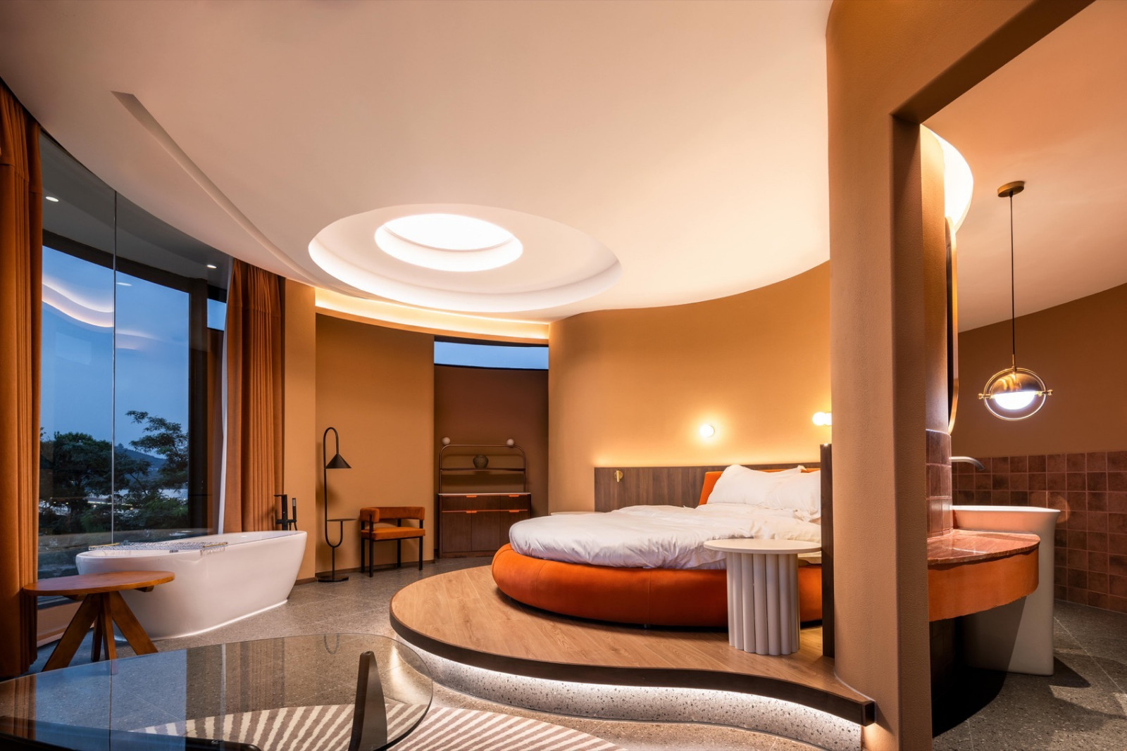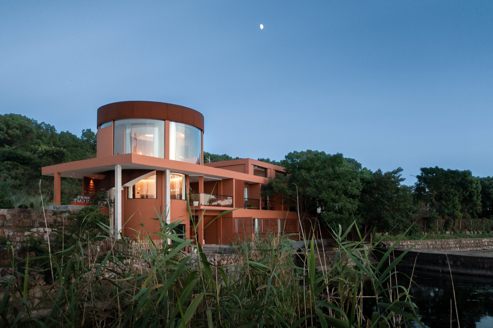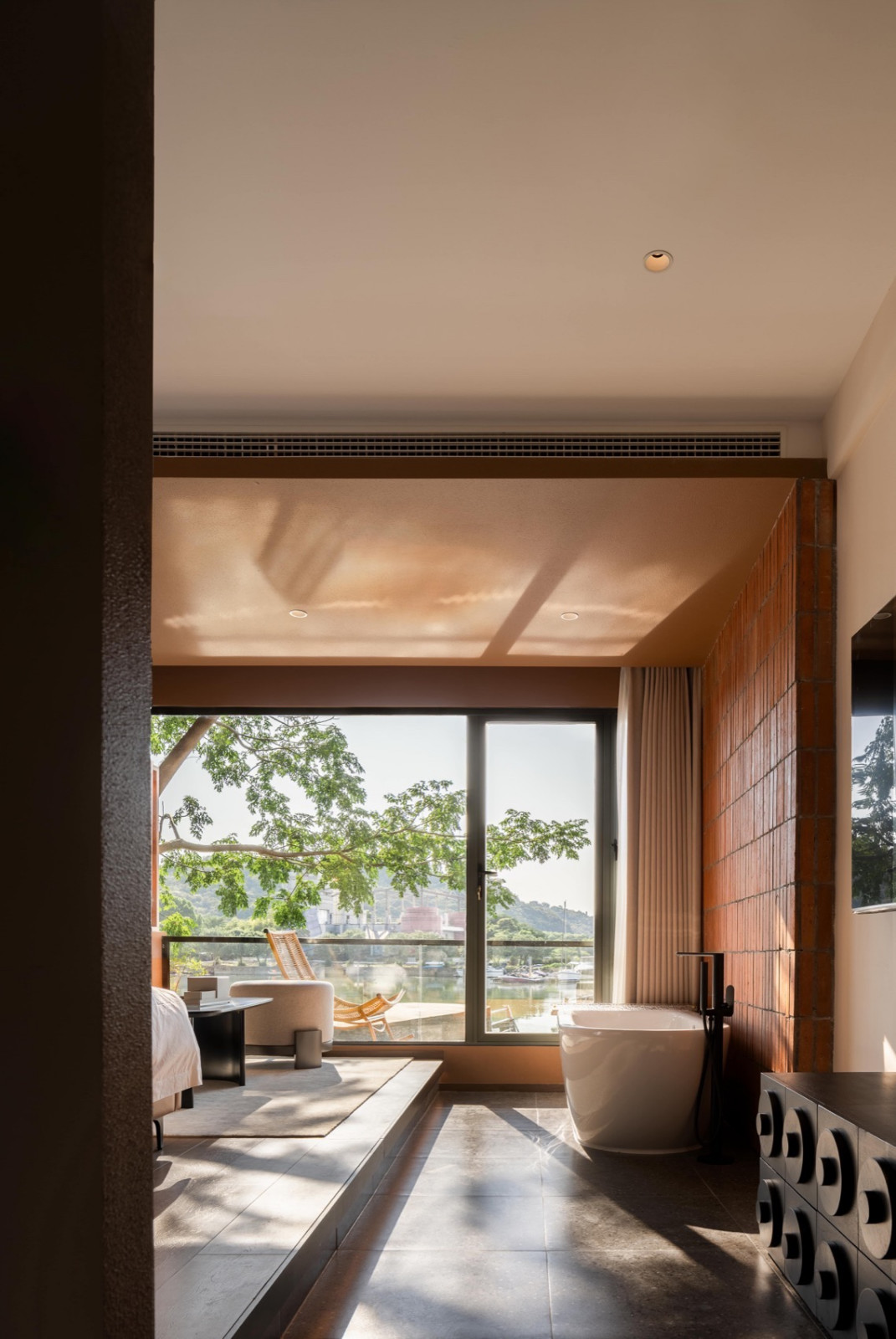 空间整体以陶土砖红为底色,灵感来自望向太湖的落日。粗糙质感涂料与陶砖贴面相互衬托,同色系不同材质让立面丰富而克制。夕阳西下时,建筑既是框景的画框,也是被晚霞浸染的视觉主体。