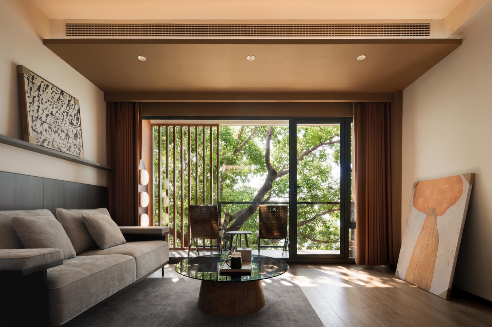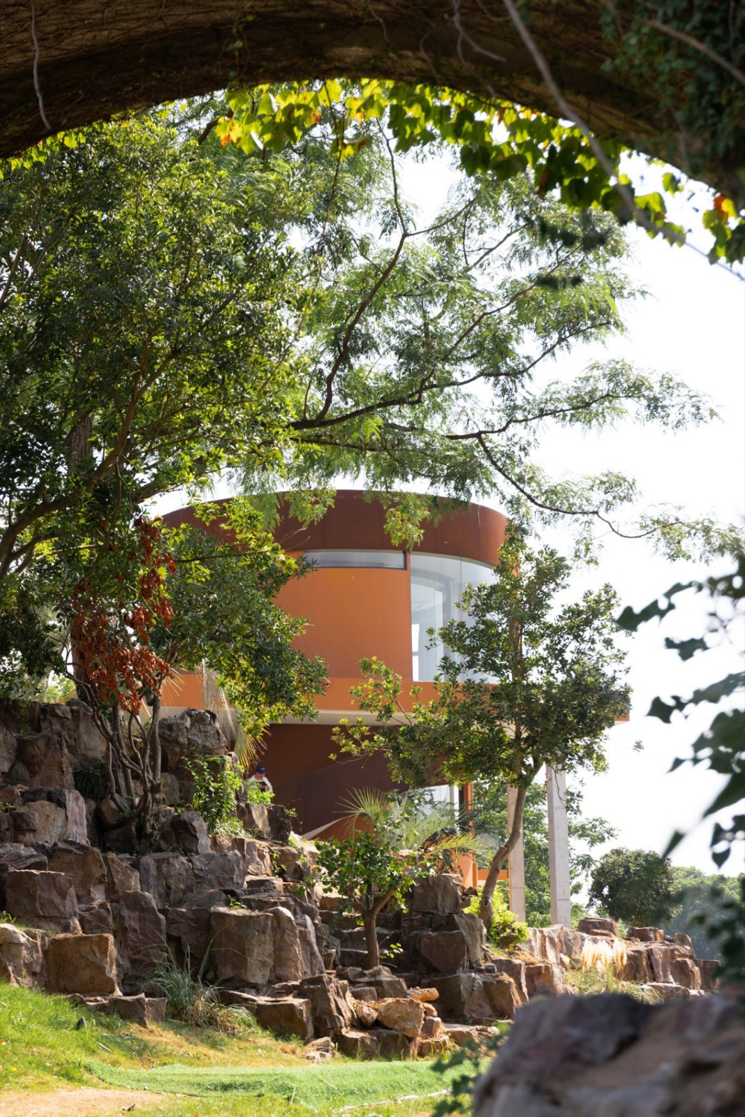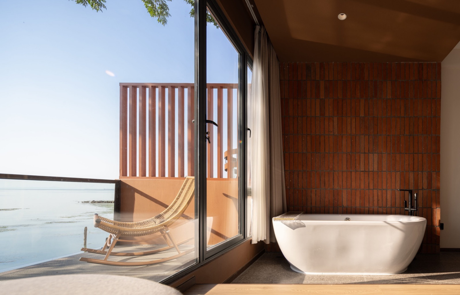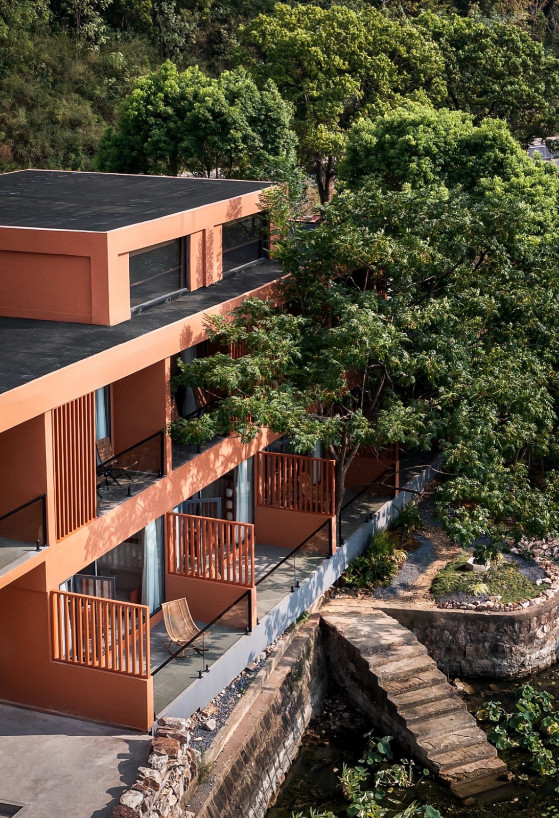 空间整体以陶土砖红为底色,灵感来自望向太湖的落日。粗糙质感涂料与陶砖贴面相互衬托,同色系不同材质让立面丰富而克制。夕阳西下时,建筑既是框景的画框,也是被晚霞浸染的视觉主体。