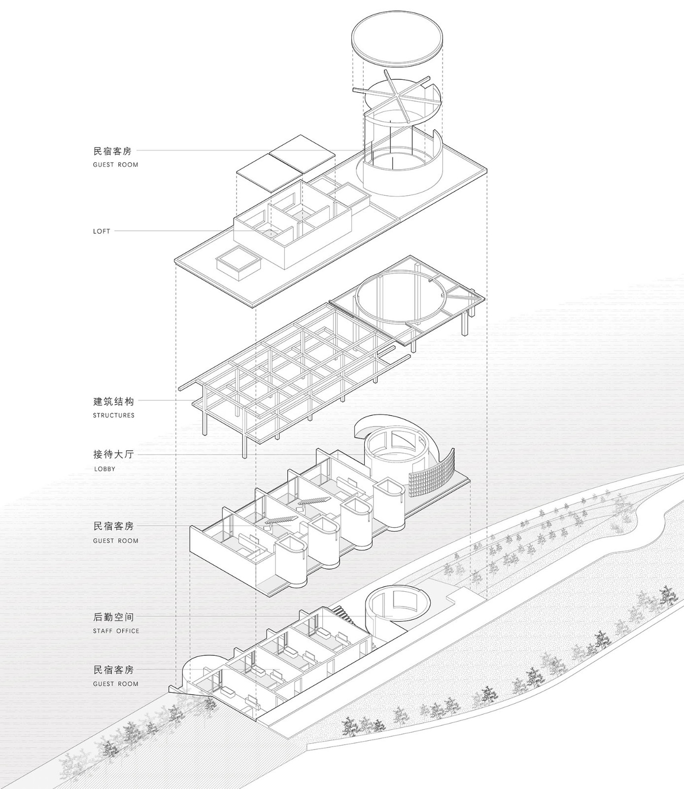 圆筒改造后,一层为接待空间,落地窗面向湖面敞开。长方体主体均匀分布八间客房,LOFT与天窗房型穿插其间。顶部开敞的入户圆柱呼应着存量圆筒,随天气变化漏下不同的光影雨雪——踏入此处,外界的喧嚣便悄然隔绝。