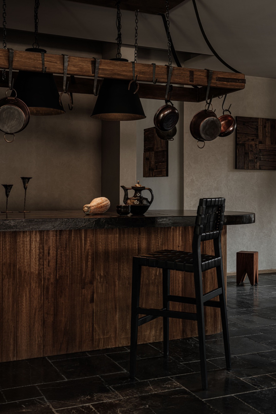大厅内,老藏民房横梁改造成的烛台木雕悬挂着召唤牦牛的铜铃。当地老石匠垒起的火塘烟墙,石头接缝里透出万物有灵的原始力量。开放吧台挂满日常炊具,贴近藏族牧民的烟火日常。