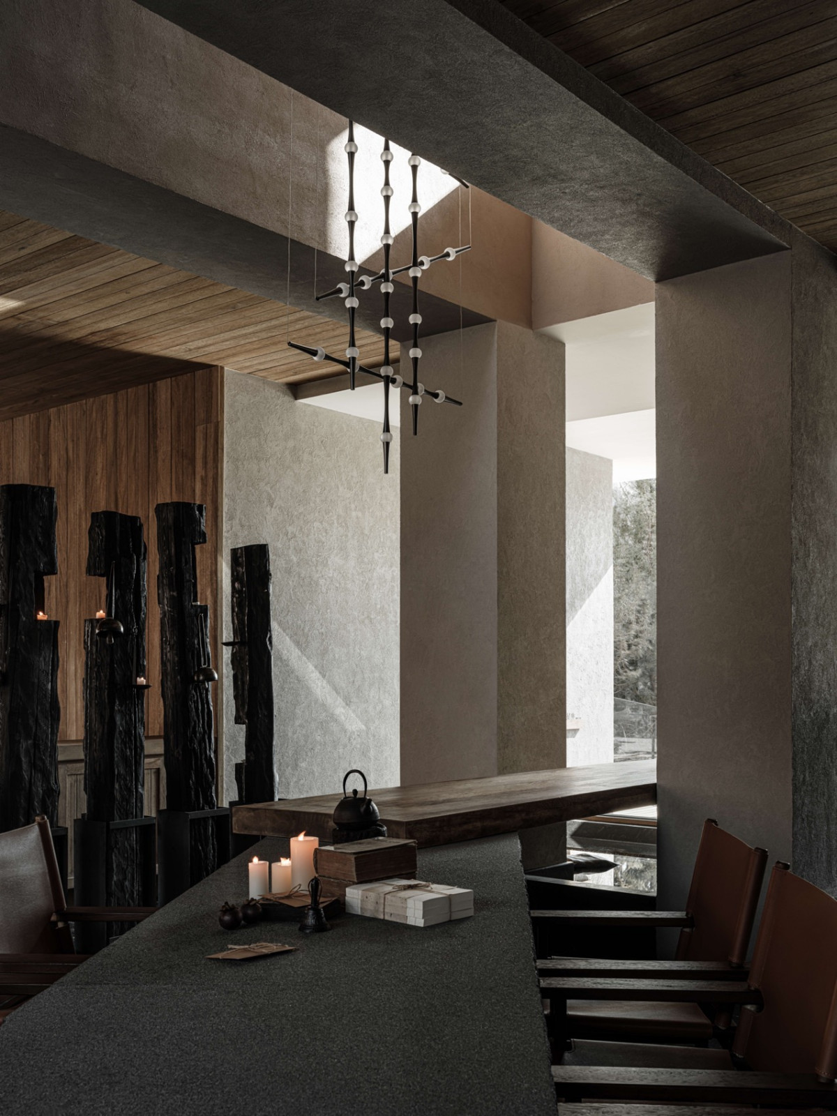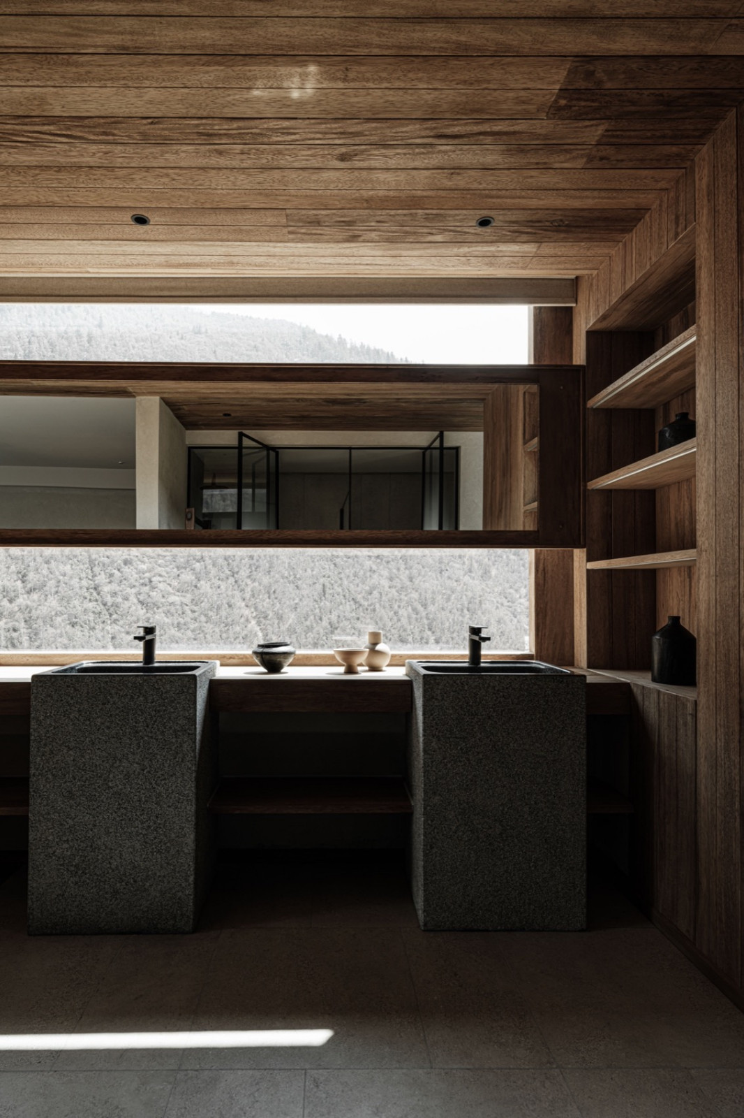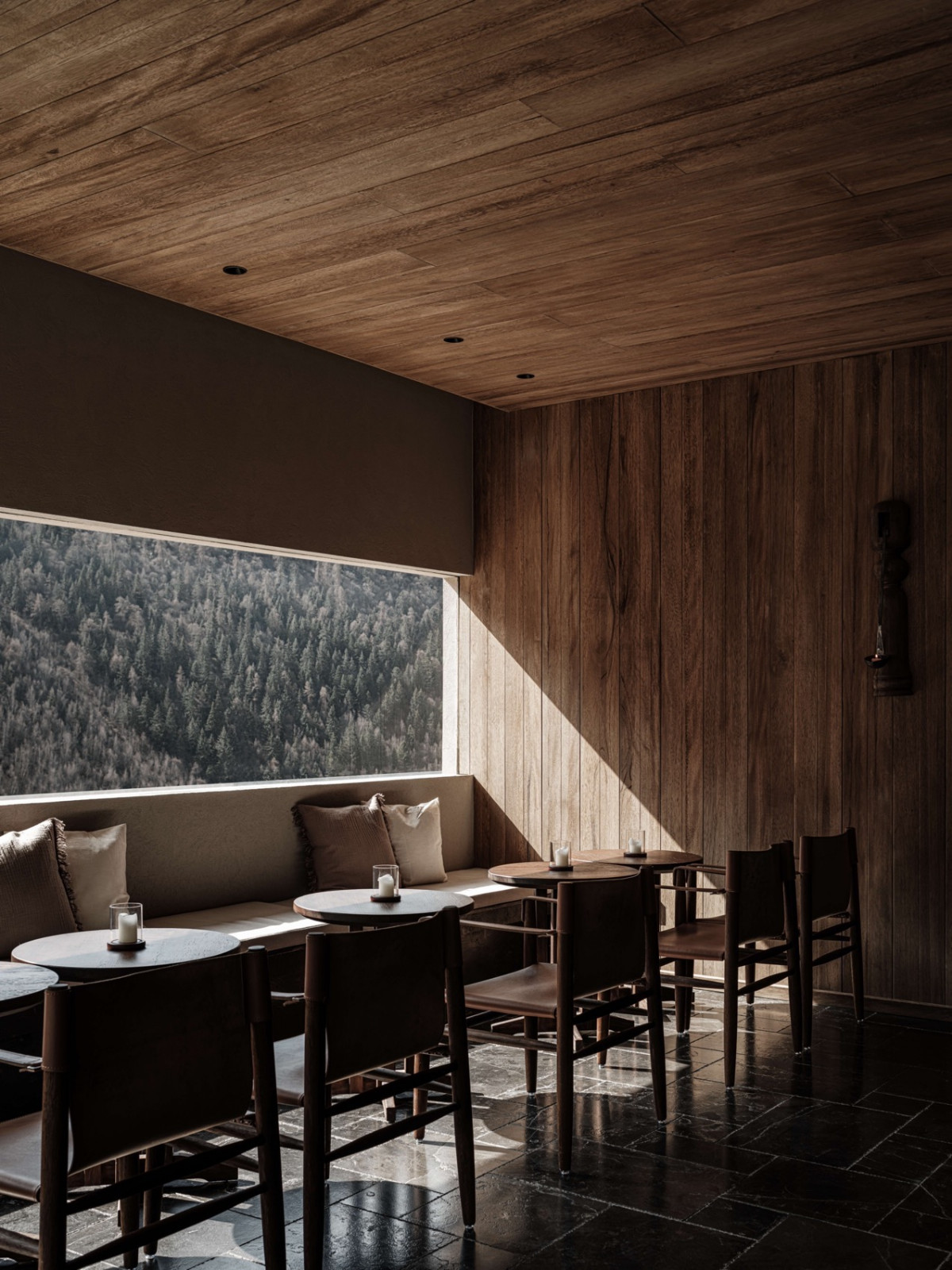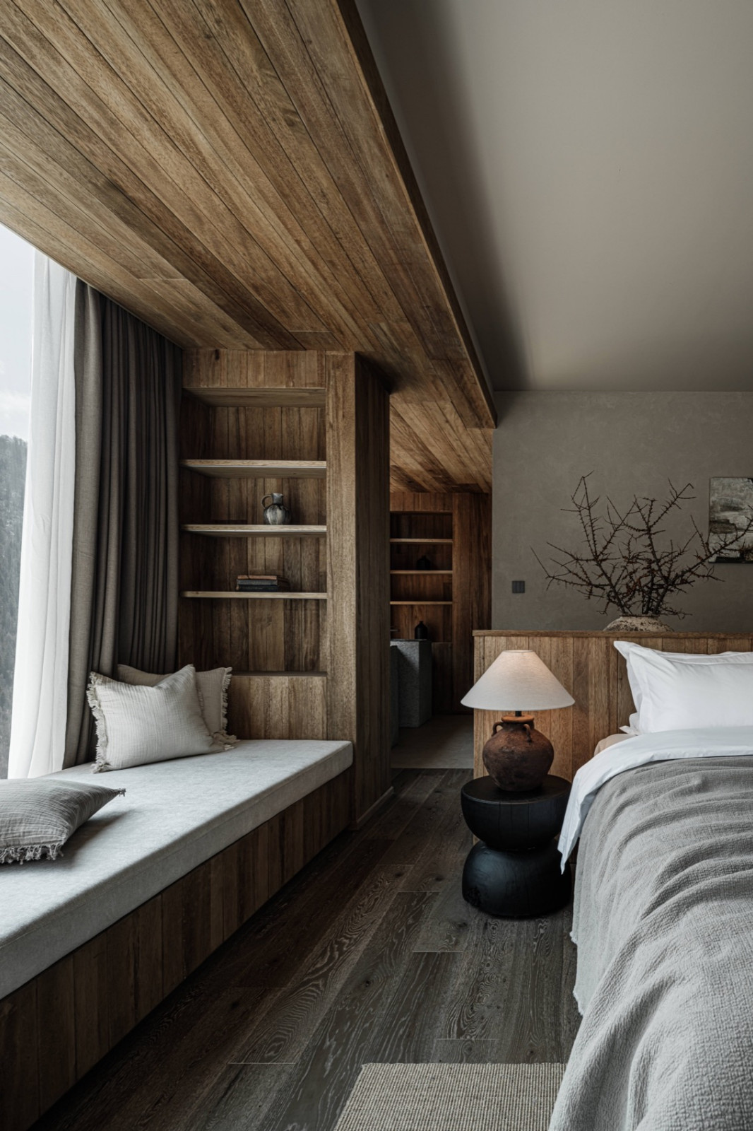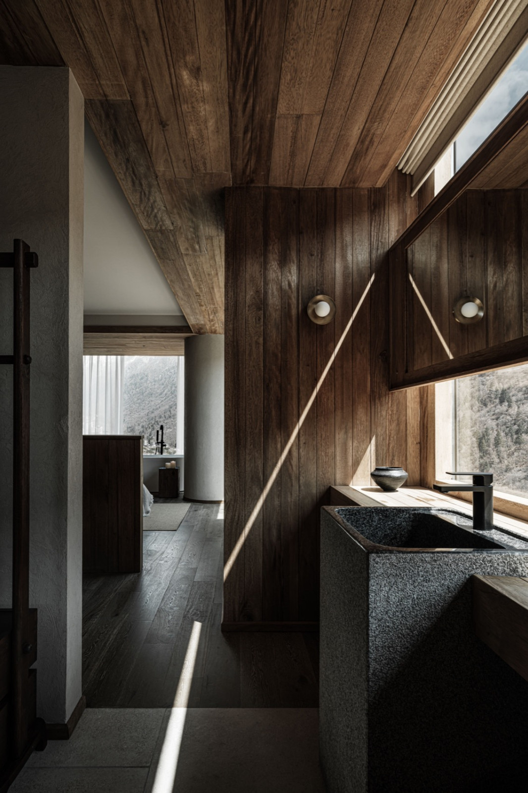 火塘边落地窗外,四季更迭的落叶林一直延伸到积雪的幺妹峰。楼梯折线般雕塑感向上,走廊光影再次浮现。客房内实木温润,光影柔和,时间的流逝有迹可循。