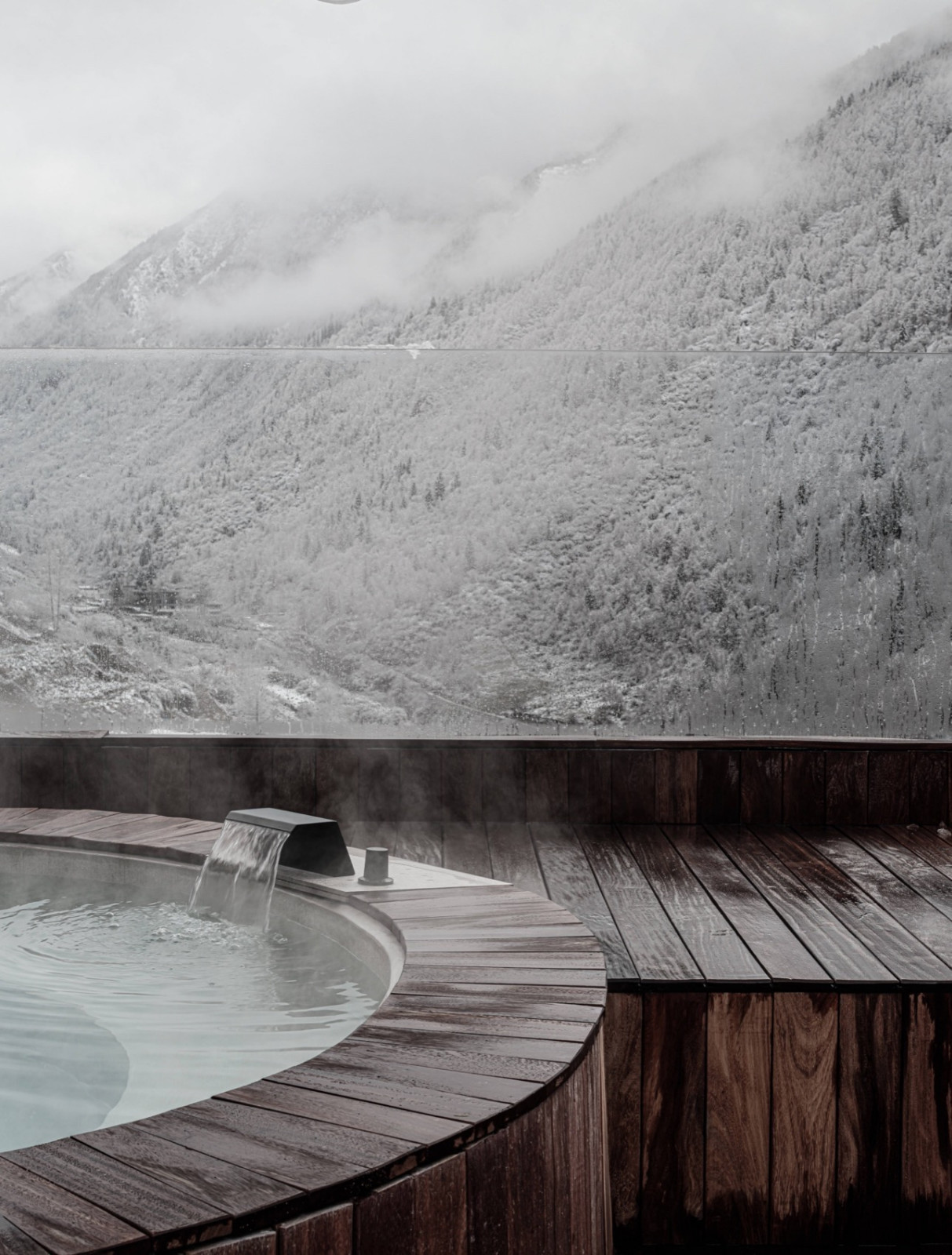 顶楼露台彻底敞开,毕剥作响的火塘与露天浴场,看日照金山,观隆冬飘雪。人置身其中,被催化、被感知——最终成为眼前美好景象的一部分。