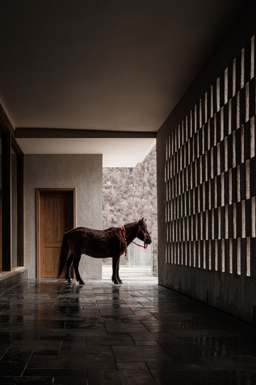 四姑娘山脚下,星山月影静卧于斯古拉神山的褶皱里。入口透光片墙引导着步伐,高原阳光洒落,在墙面投下富有节奏的阴影。行至尽头,半阙山水以“请”的姿态安置——那是精神的缩影。