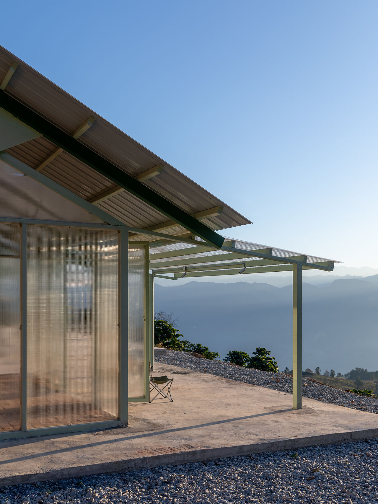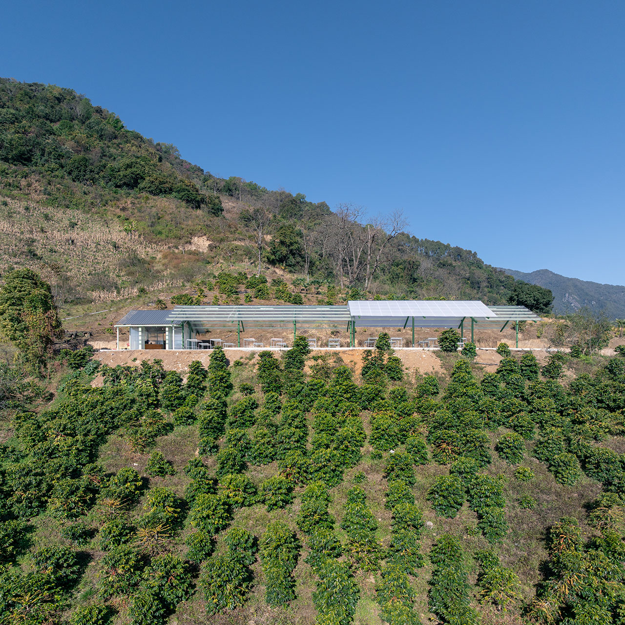 为弱化棚架的体量感更加接近于周边的小体量传统建筑,将晒场整体构架分为四大段,相互进退形成有秩序的错落状,作为咖啡豆采摘生产的一个工作环节使用的空间场所,让晒场棚架更像高山上的咖啡驿站或车站。