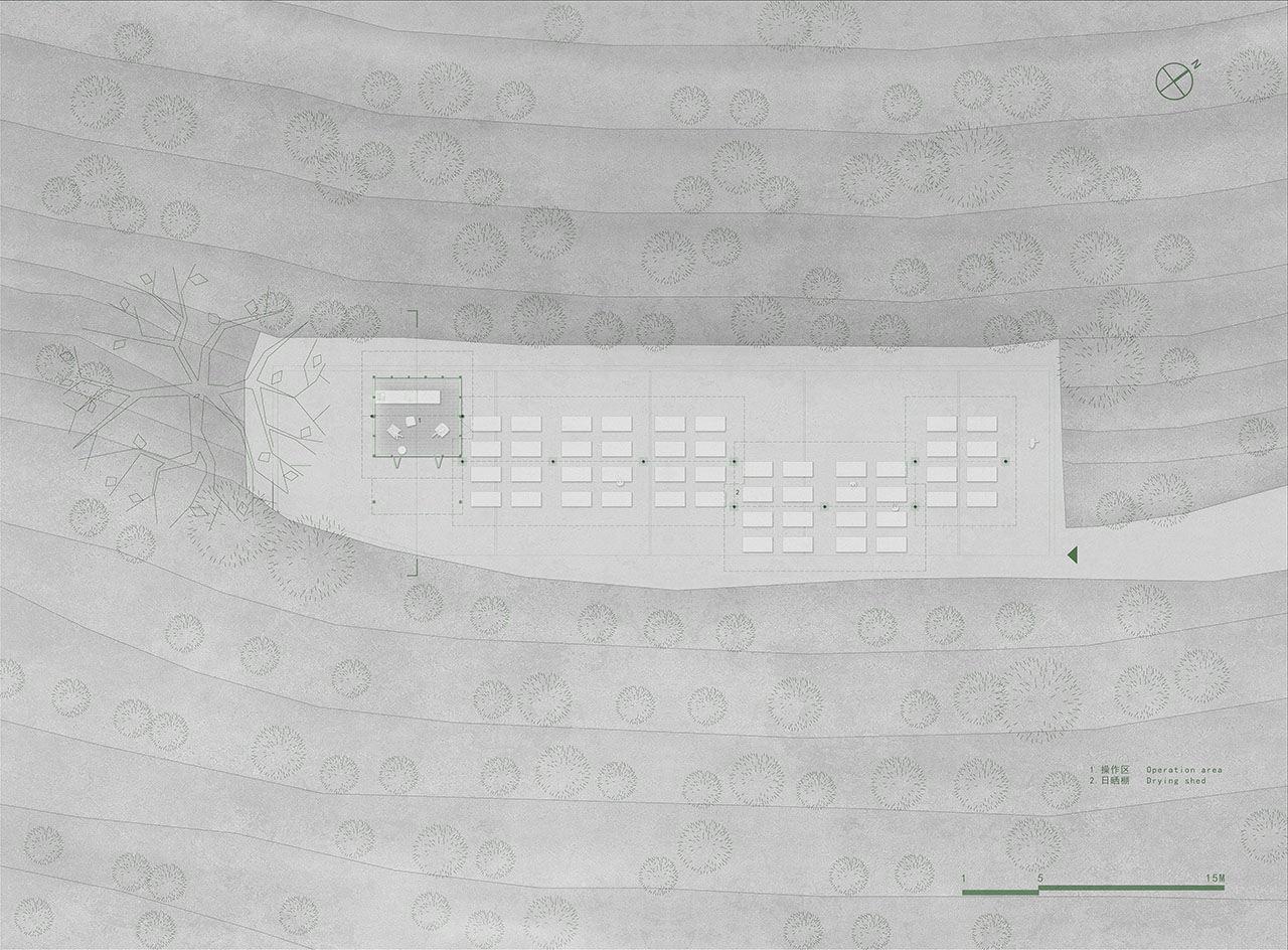高黎贡山树木繁茂,为更好的融入其中,结构形态上选择了类树形的伞状结构来撑起棚架,简化了传统的晒场棚架,错动的多品伞构架并置创造出了一种林下的空间感。
