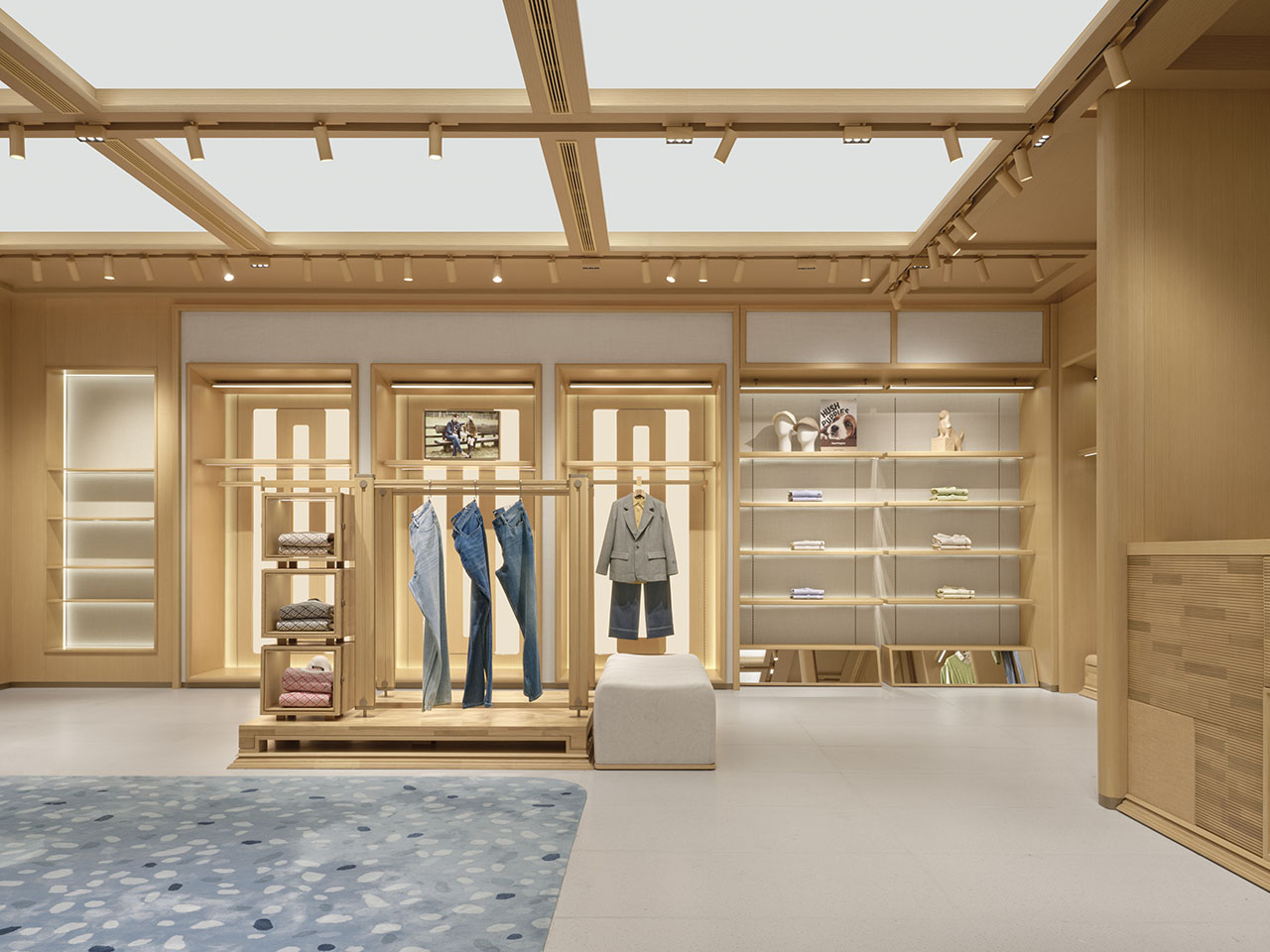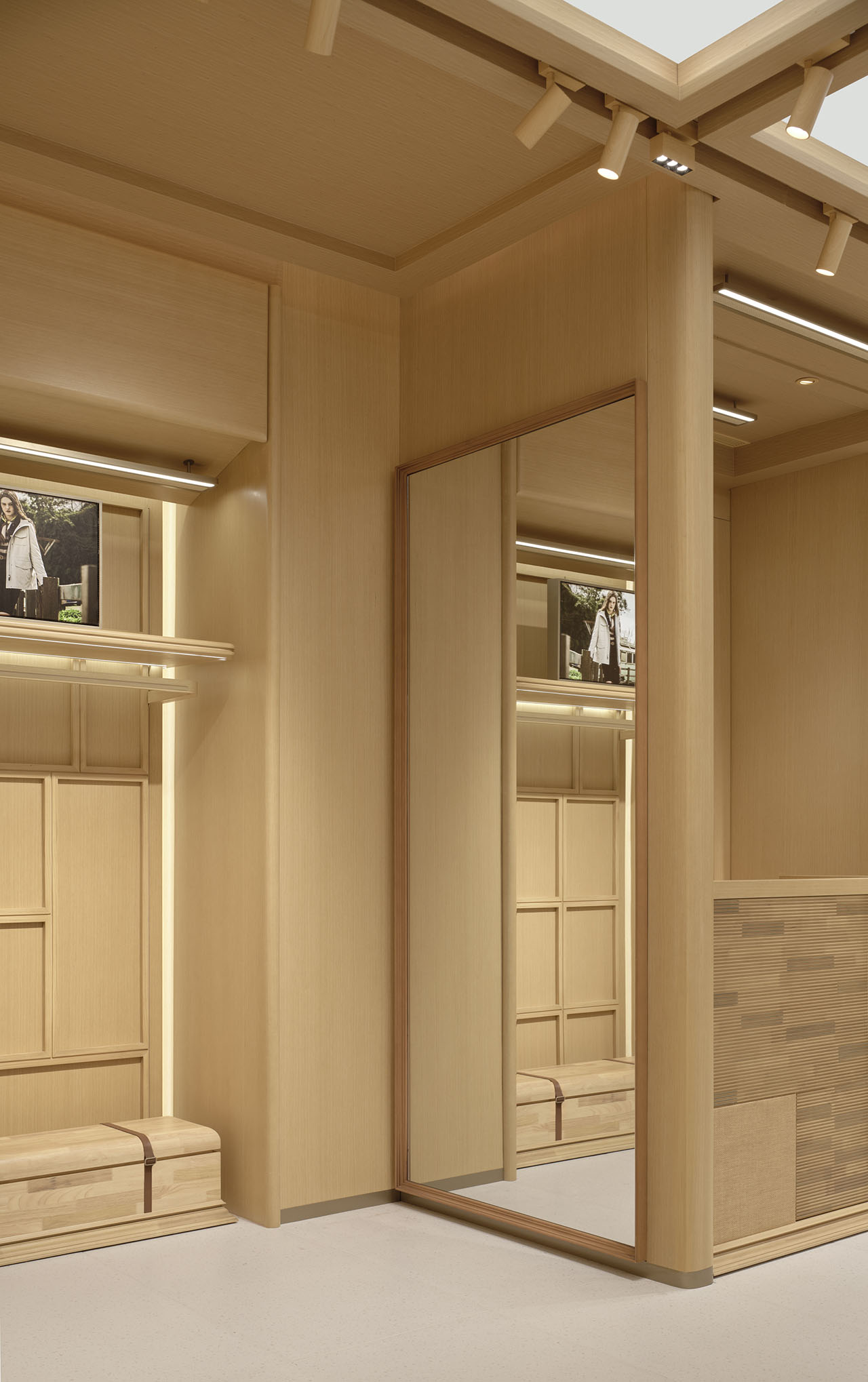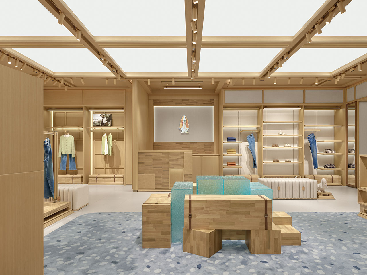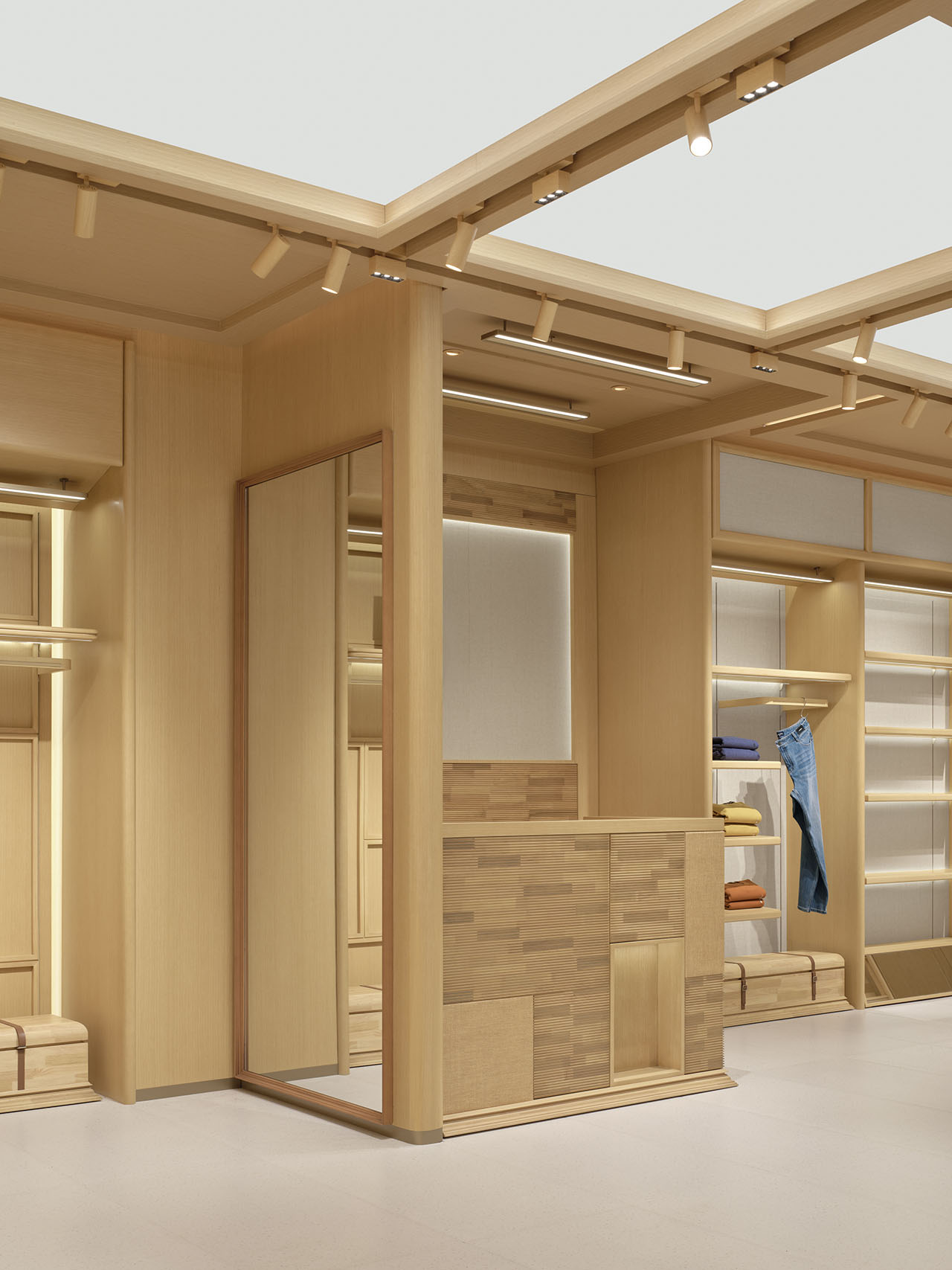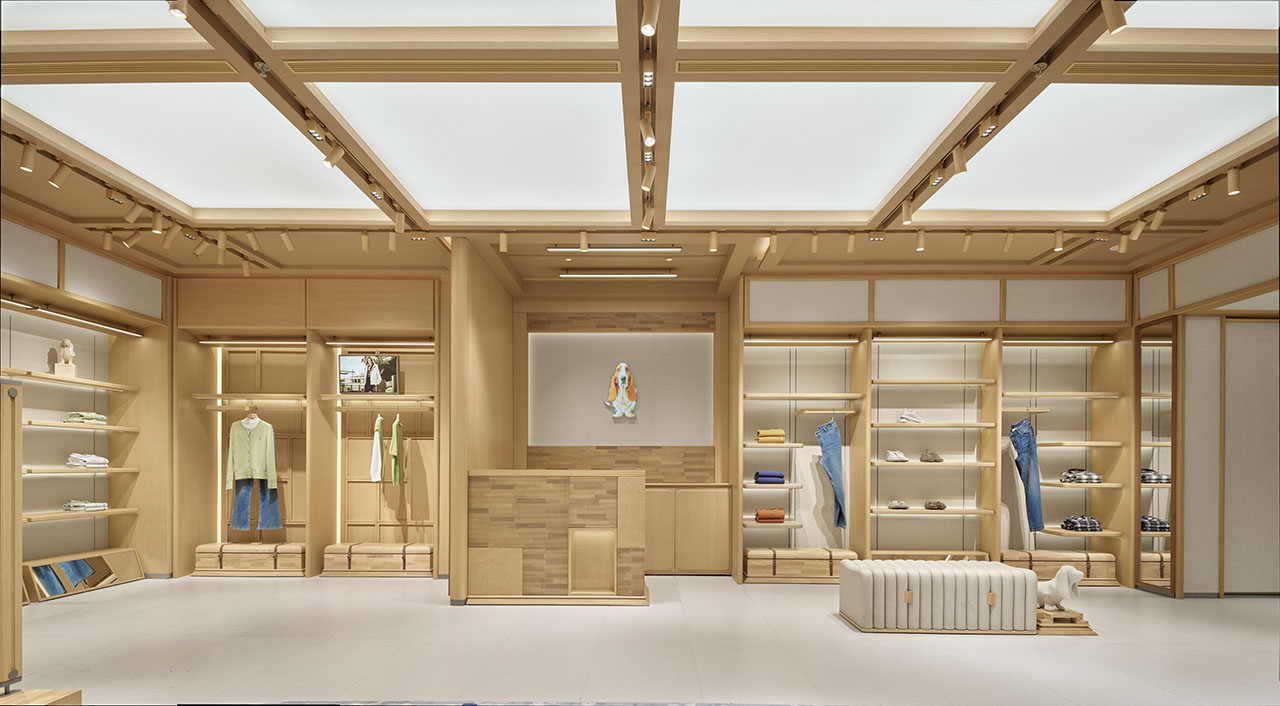 店铺内部在统一的木质架构下,通过模拟自然天光,创造空间的呼吸感,铺陈情感基调。均匀柔和的光线给予氛围感同时,更消隐了边界感,向外延展至休闲度假、舒适居家的从容安定。