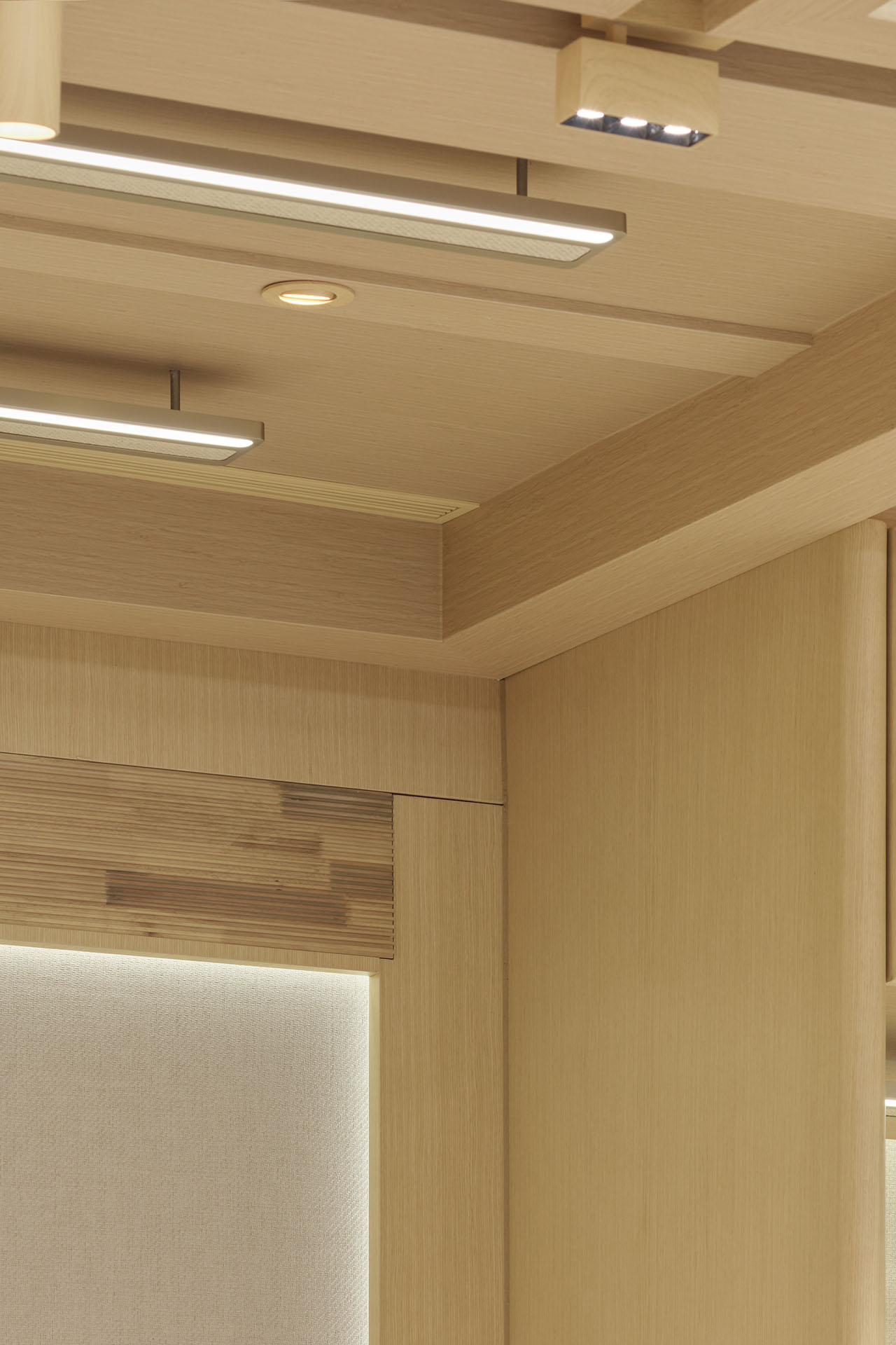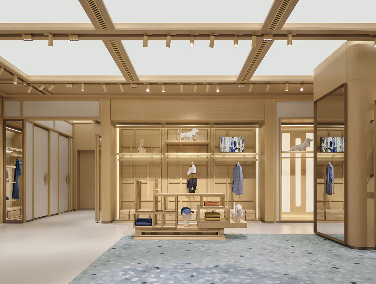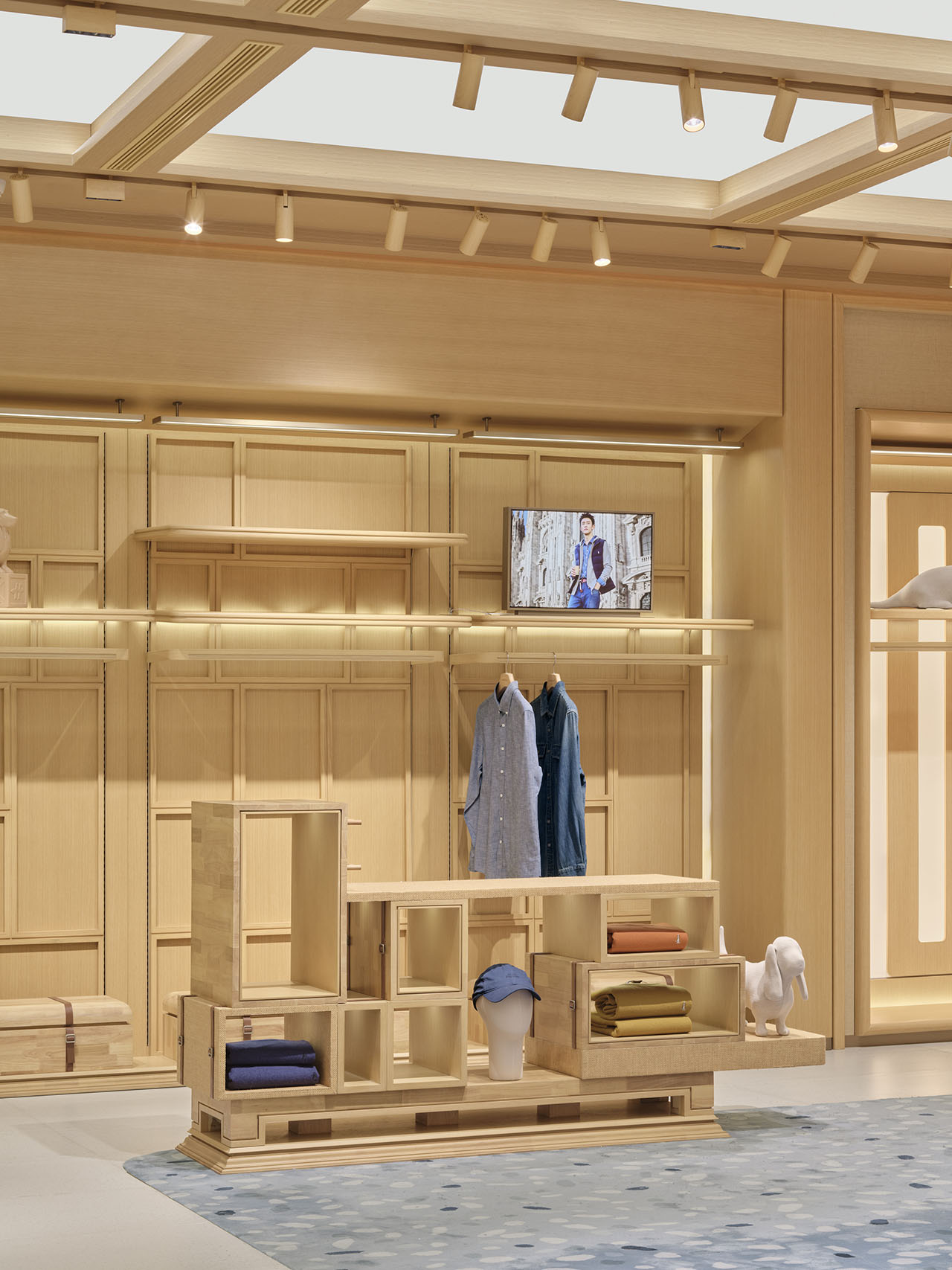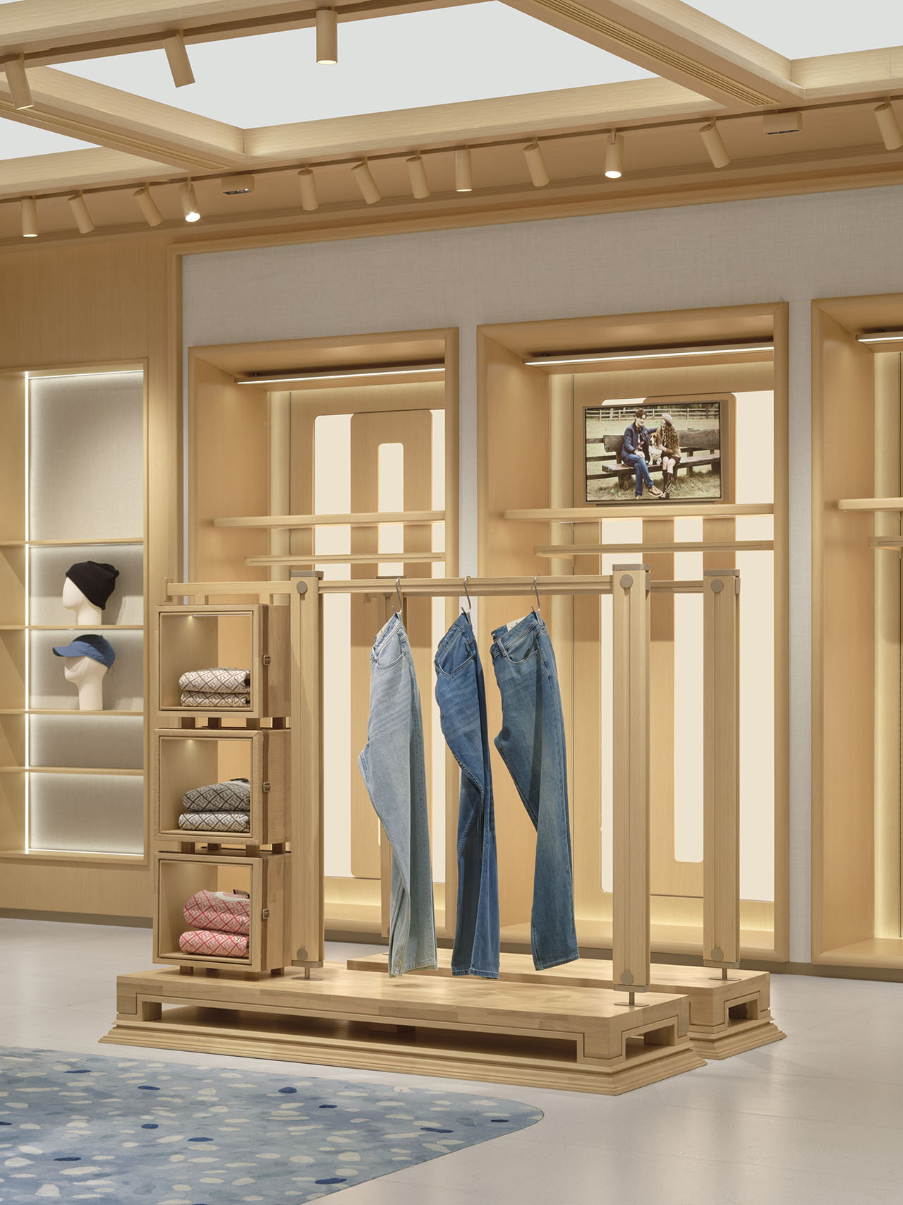 店铺内部在统一的木质架构下,通过模拟自然天光,创造空间的呼吸感,铺陈情感基调。均匀柔和的光线给予氛围感同时,更消隐了边界感,向外延展至休闲度假、舒适居家的从容安定。