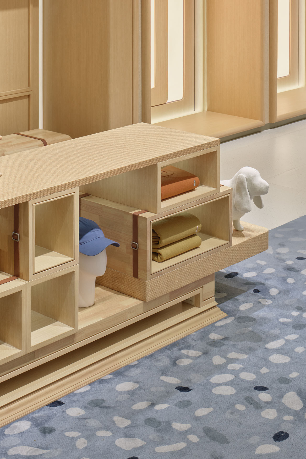 空间中自由搭配的方形体块,构筑整体设计骨架与视觉秩序,统一而蕴含变化的韵律释放出沉静安定的力量。每一处商品陈列都被转化为日常生活的诗意投影,可个性组合的构架组件,让零售场景能够持续焕新。