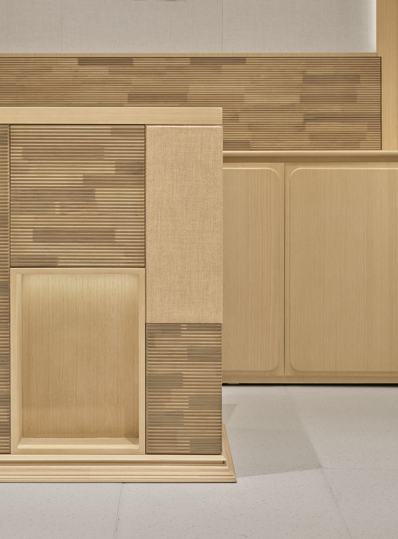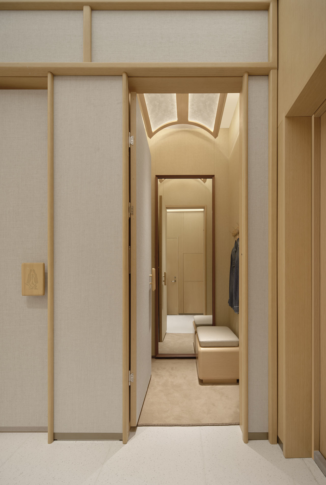 在保持统一色彩与材质下,设计为不同分区赋予独特细节诠释。通过背景板墙的纹理与结构变化,隐喻家的不同场所气质——从玄关的归属感、书房的端庄、客厅的闲适到卧室的安然,在转换间引发情感共鸣,营造沉浸漫游体验。
