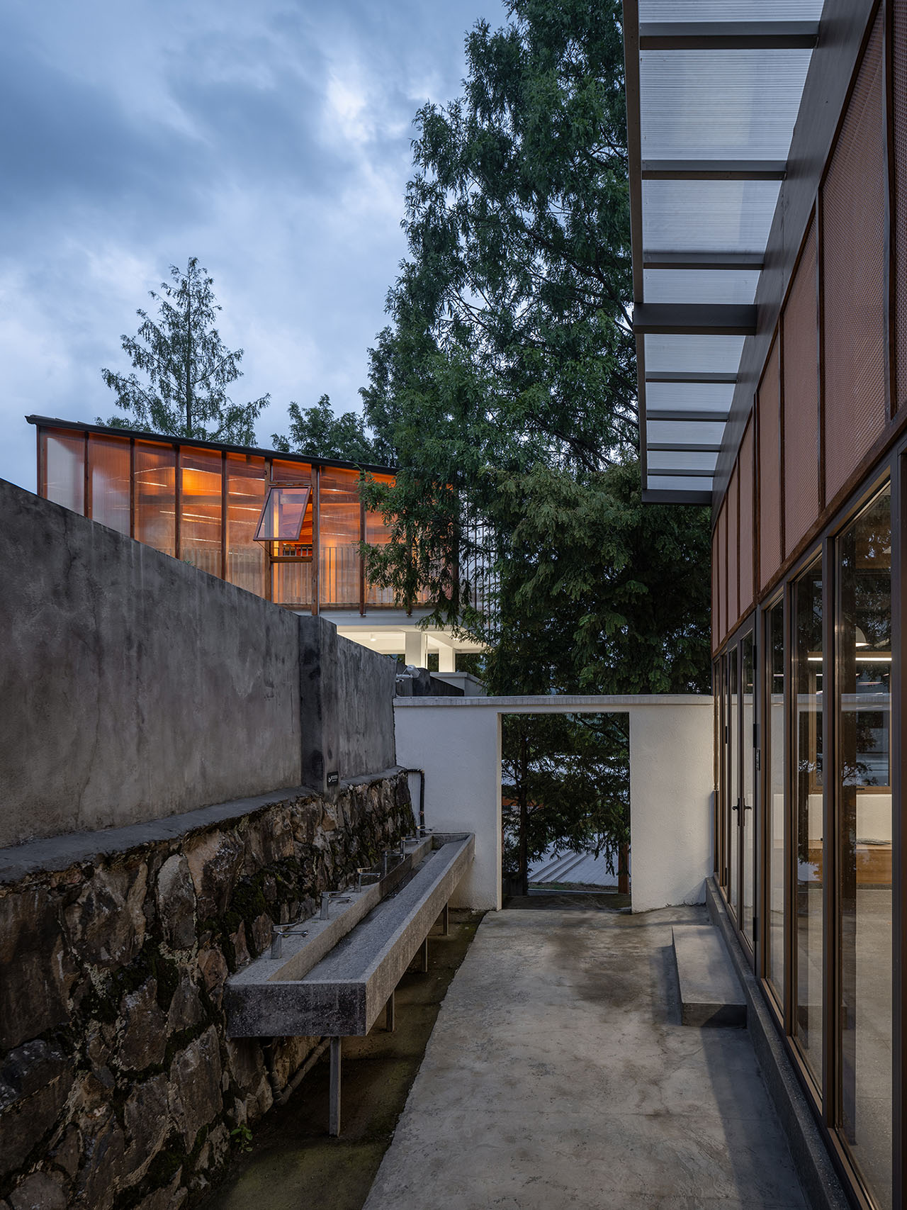 这个营地位于山林中,地势复杂多变。岗亭场地在两个台地过渡处,原本是一间学校办公室,入口位于低层台地,屋顶作为露台,与上一级台地对齐标高。层高随两阶台地高差自然确定,约有4米。