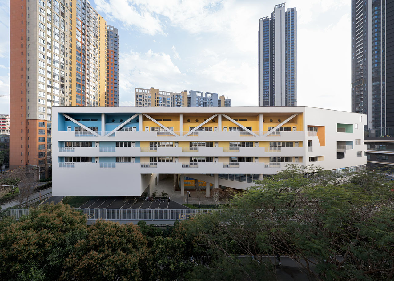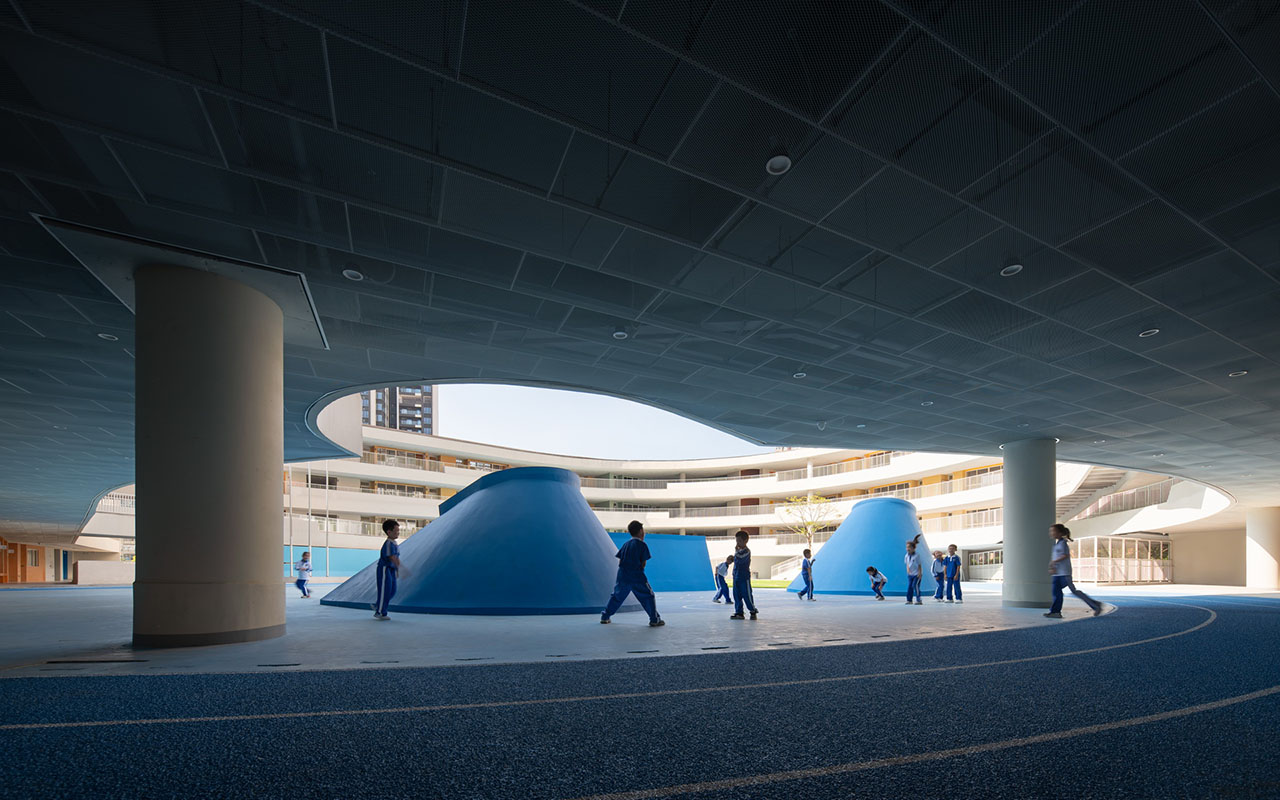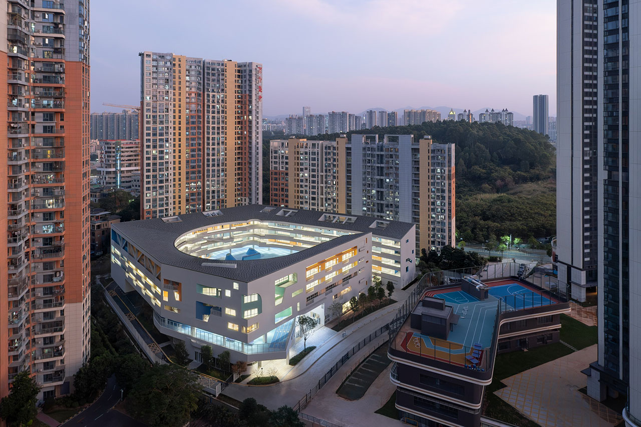 围屋学社场地形状不规则且周边高楼环伺,外折内圆的平面形态将基地使用最大化,设计策略回应高密度环境的同时,力图缝合碎片化的空间肌理并重新植入社区的文化与精神性内核。在强调上部围合的同时,将学校与社区可共享的文体功能置于底层。中心大面积的运动场可为社区提供大型活动的舞台空间,增强社区凝聚力。建筑语言从客家民居中汲取灵感,结合本地气候与学校的功能需求,多元的立面语汇回应了高密度校舍在遮阳、通风以及私密性与开放性等方面的问题。