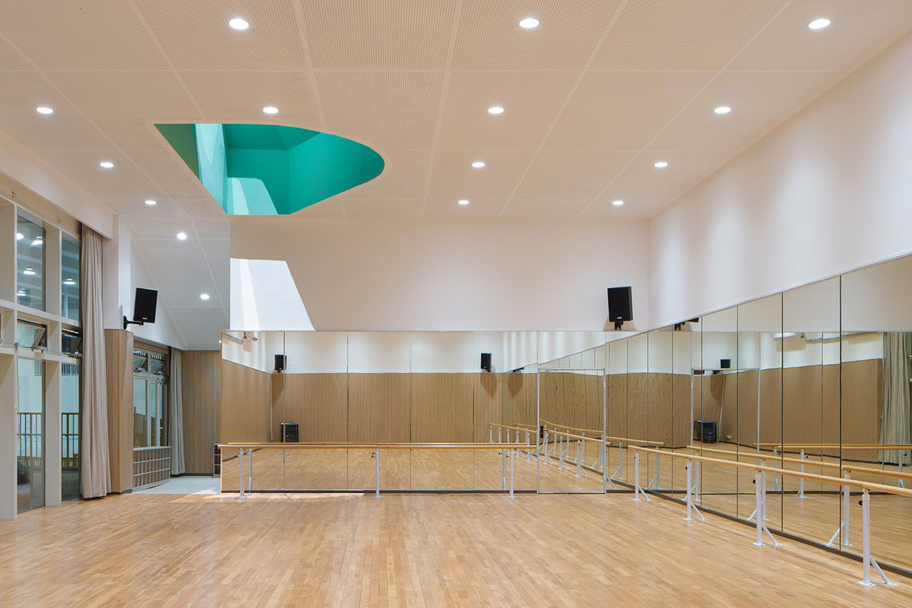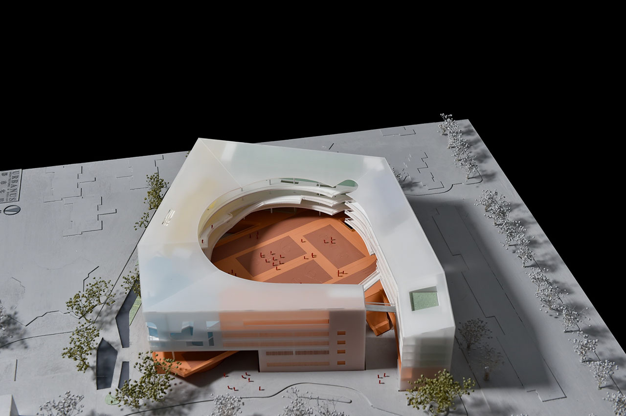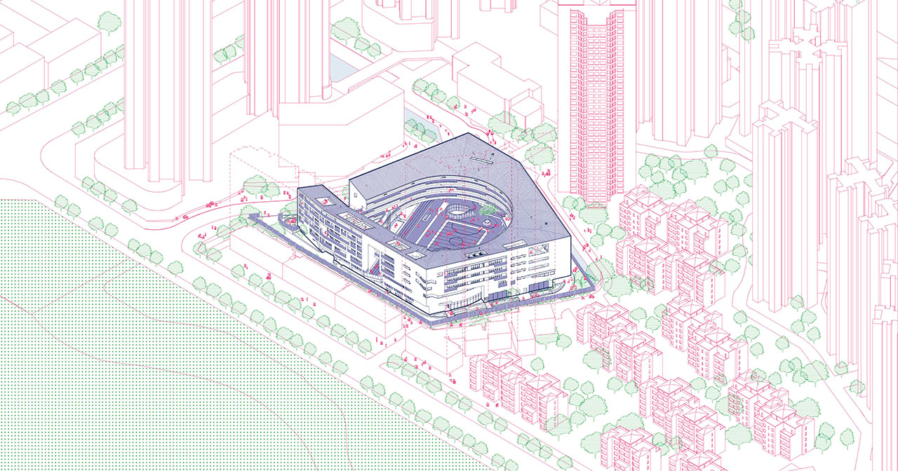 围屋学社场地形状不规则且周边高楼环伺,外折内圆的平面形态将基地使用最大化,设计策略回应高密度环境的同时,力图缝合碎片化的空间肌理并重新植入社区的文化与精神性内核。在强调上部围合的同时,将学校与社区可共享的文体功能置于底层。中心大面积的运动场可为社区提供大型活动的舞台空间,增强社区凝聚力。建筑语言从客家民居中汲取灵感,结合本地气候与学校的功能需求,多元的立面语汇回应了高密度校舍在遮阳、通风以及私密性与开放性等方面的问题。