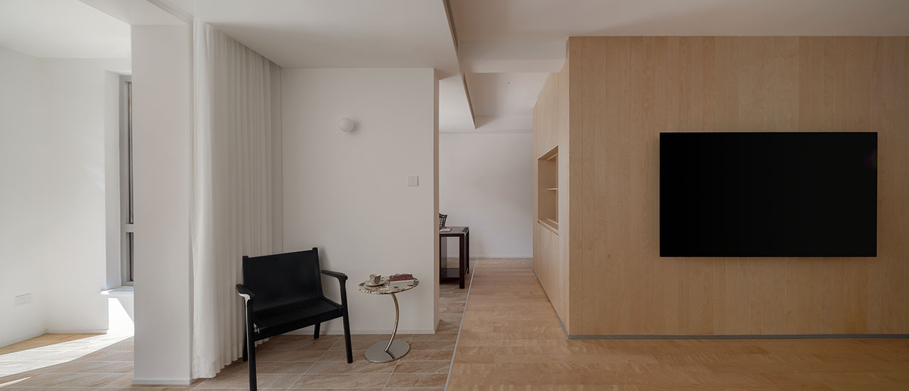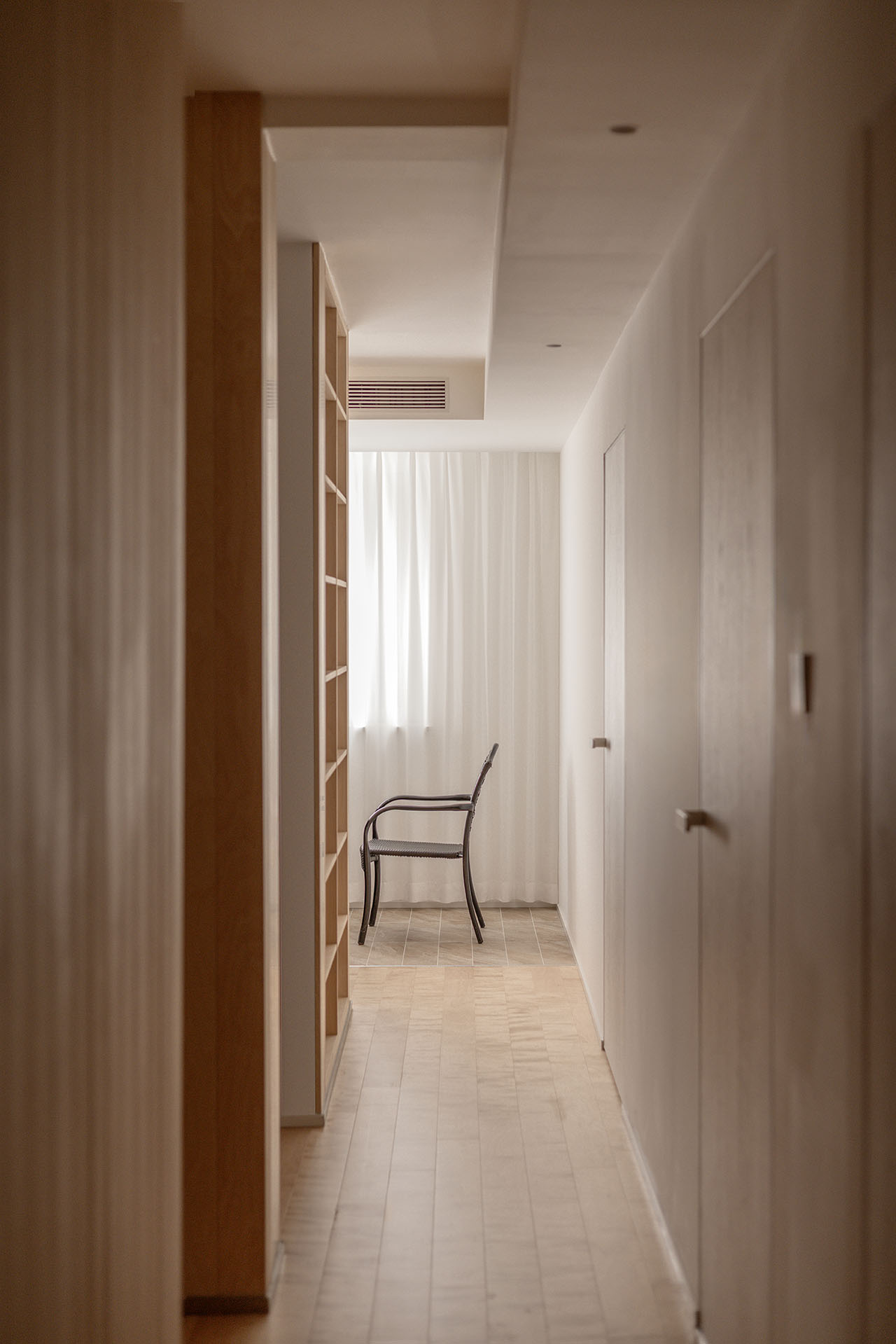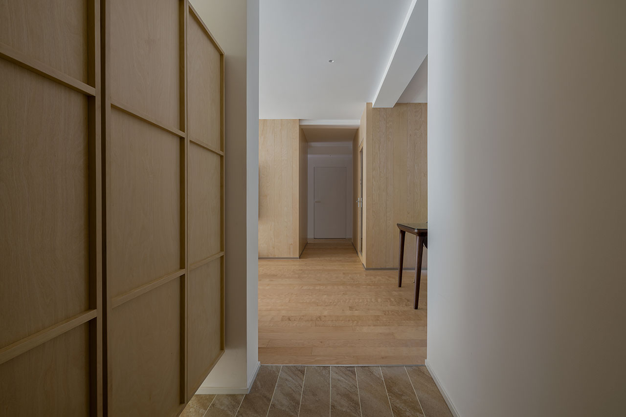 制造“边界错动”效果的铺装石材延伸进入小玄关、客厅、品茶空间以及卧室的一部分,在功能与心理层面上都带来了空间的扩展。同时,在同一空间内让木地板与石材并置共存,也为生活方式和空间使用方式提供了更多可能性。