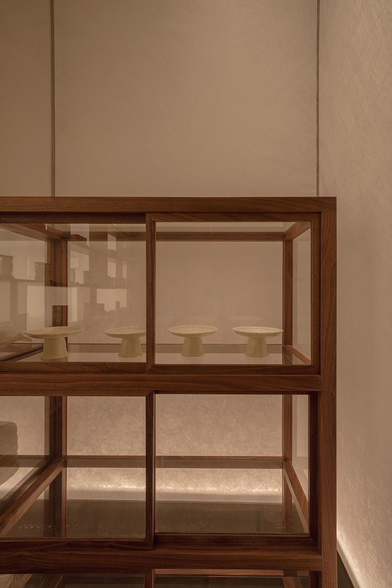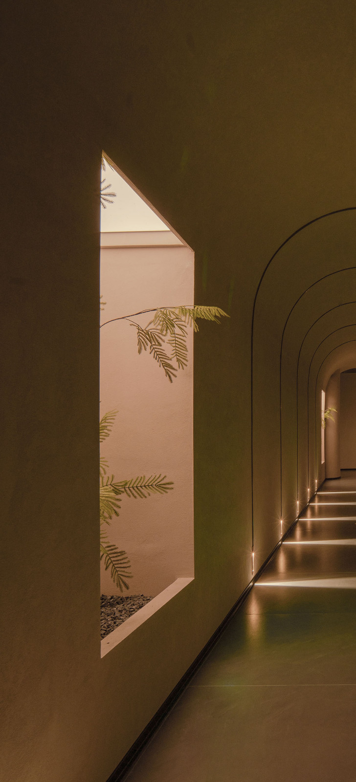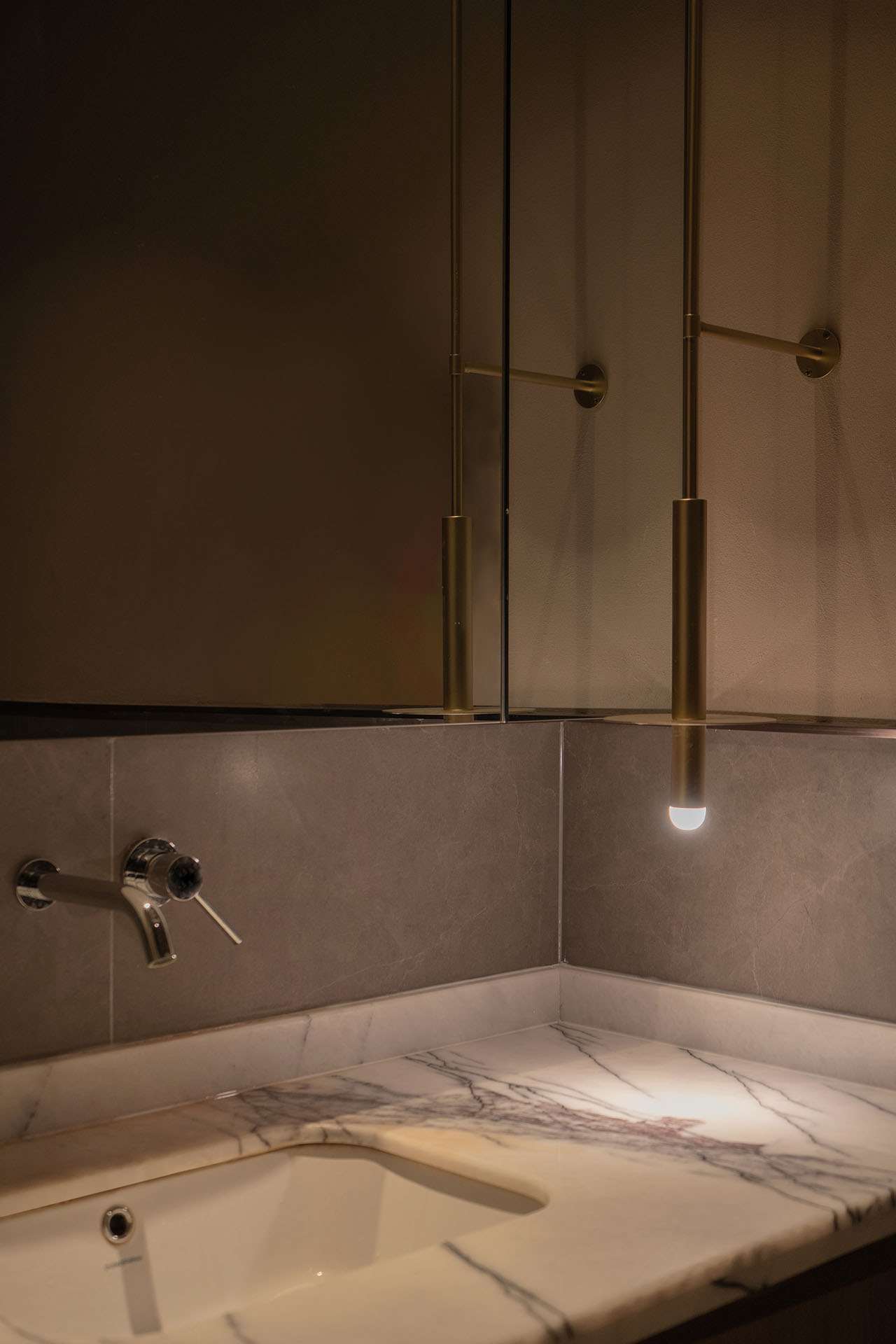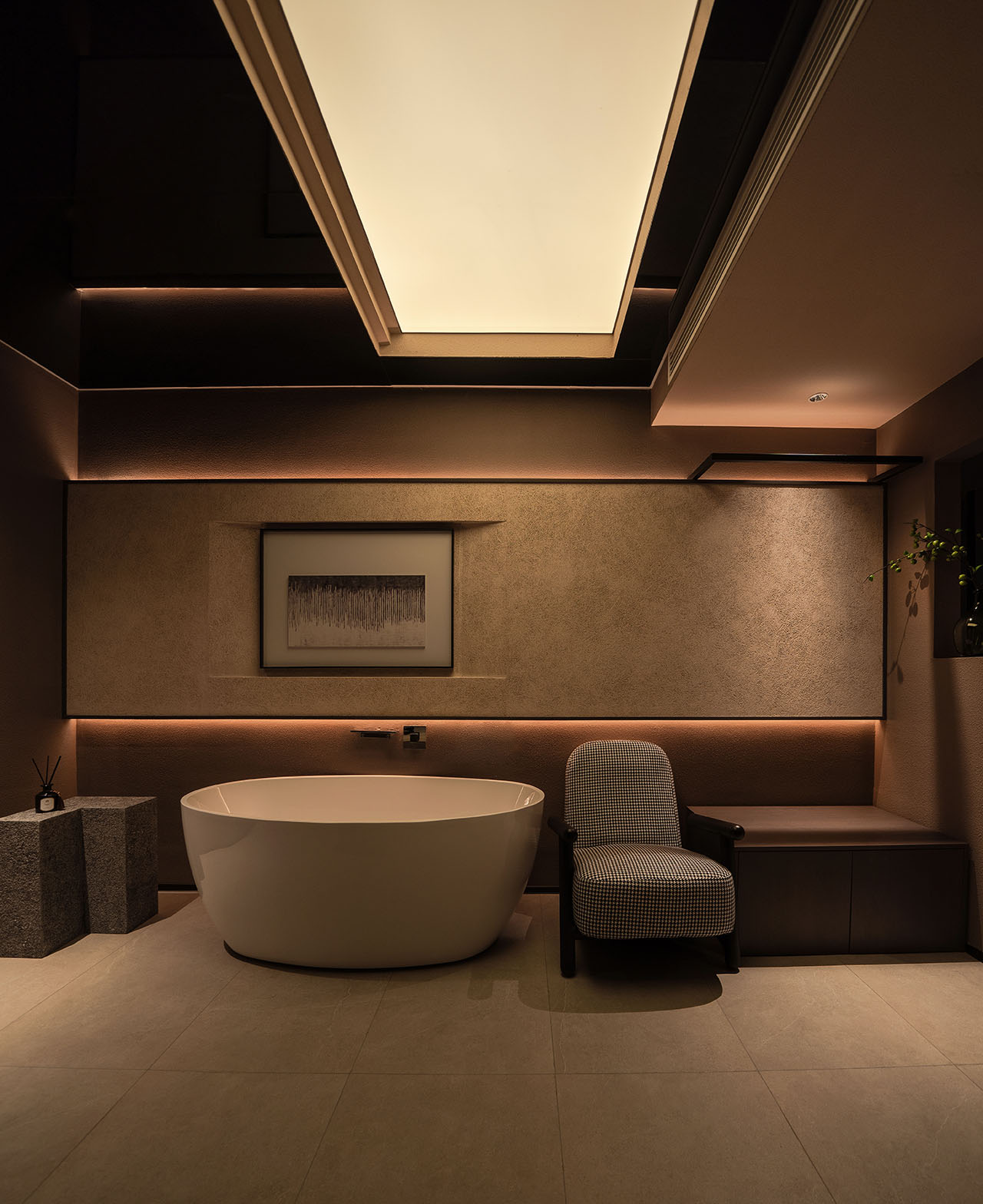 房间内反而摒弃了简单传统的做法转而寻求一种多层次、构筑感的表达,目的是构造光线与形式的流动性。光线经墙面、地面反射,温和包裹空间。一束精心设计的光只照亮一汪清水,波光粼粼间便有了灵动的呼吸。