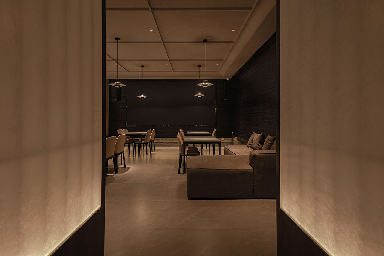 连续、狭长的黑色碳木板如展开的卷轴,仅以低矮枯石和别致插花点题,压低视线也收敛心神。步移景异,将喧嚣阻隔,转身进入休息区与茶室区域,空间舒展,心也随之释放。