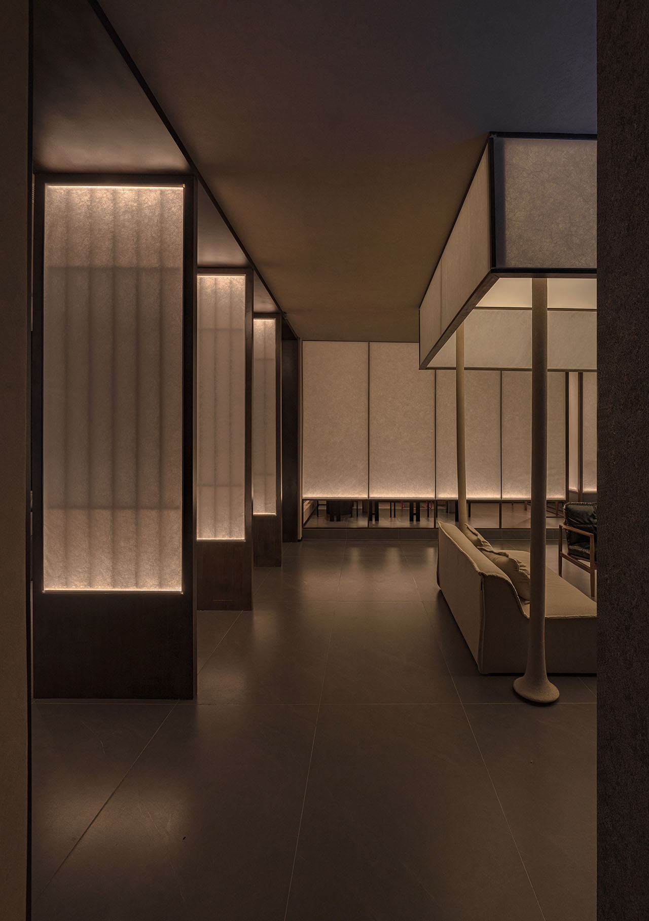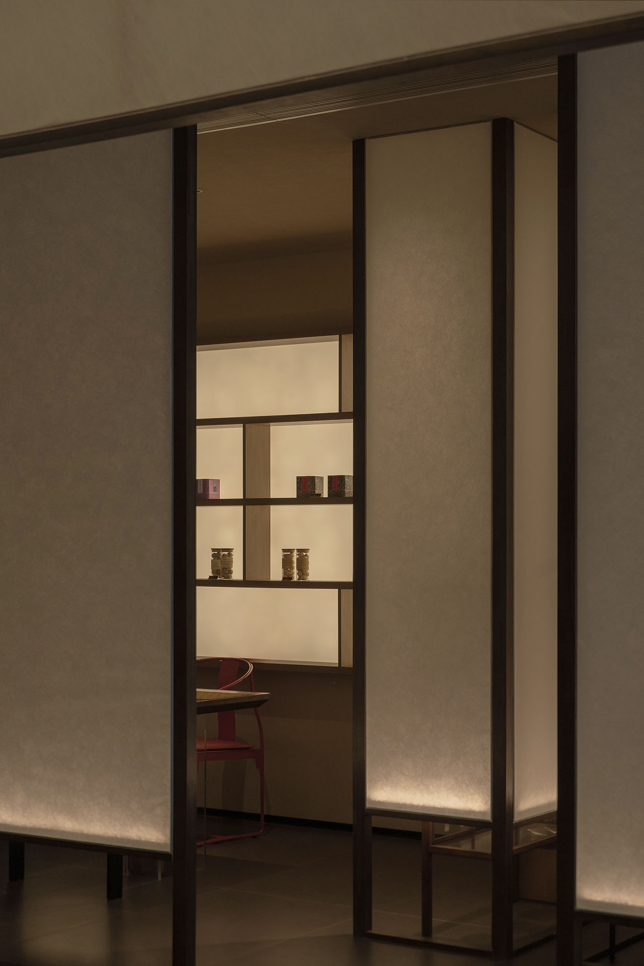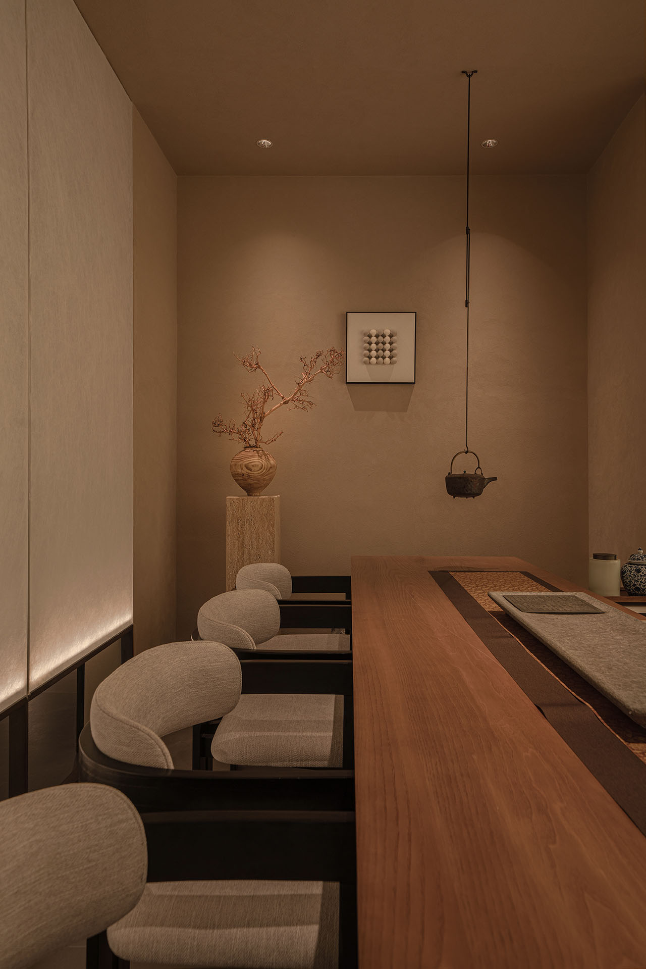 茶室摒弃生硬隔断,内透光的浅色屏风、朦胧的纸质隔断形成视觉的遮蔽,确保私密又不显逼仄。每间茶室设置小干景,气息自由流动,行步间如同翻阅一册雅致画页,脚步也随之轻盈。