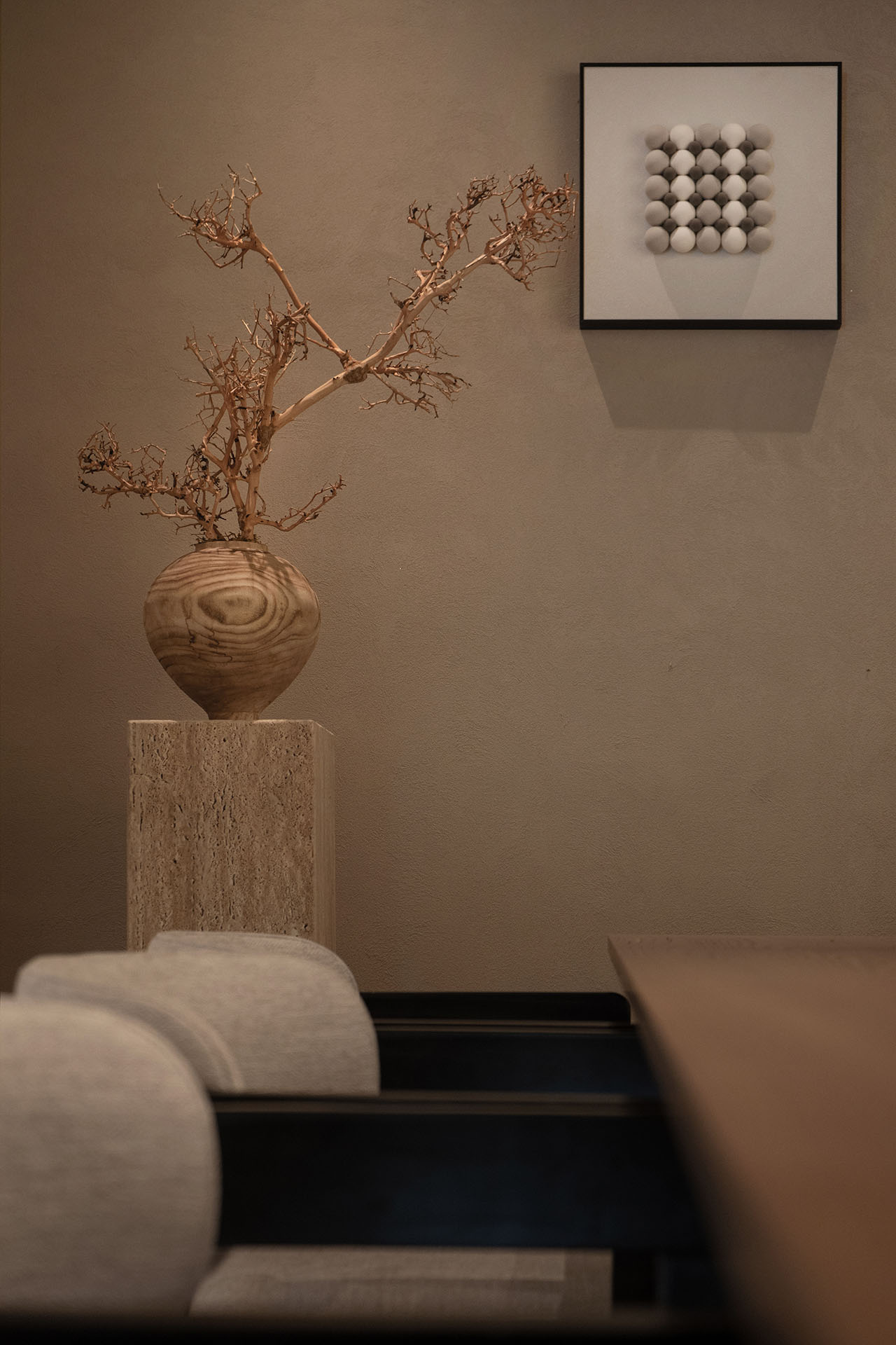 原石摆台、形态各异的原石景观石,以及姿态遒劲、饱含岁月痕迹的枯枝。它们并非繁复的装饰,而是东方美学精神的无声具现——石之沉稳亘古,木之枯荣轮回,在极简的空间容器中,以一种近乎禅意的姿态,诉说着时间的流逝、自然的伟力与生命的哲思,将空间的意境引向深远与空灵。