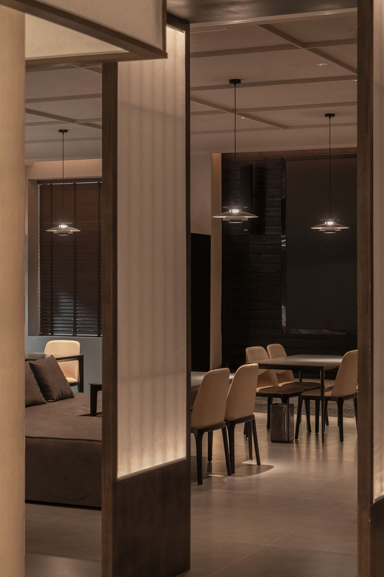 休息区简单设置沙发茶几,由四根圆柱撑起一方天地,墙面铺以碳木板和青苔,柔和的天光洒下,抚平等待的焦躁。穿过中轴门就是餐厅及后厨区。中轴门也采用与茶室隔断相同的形式,为空间增添了更多的连续材质与统一性,若隐若现的格栅为空间注入了经典的东方元素。餐厅内黑色的墙面与自然的涂料顶面,为空间内部注入了更加沉浸式的静谧感。