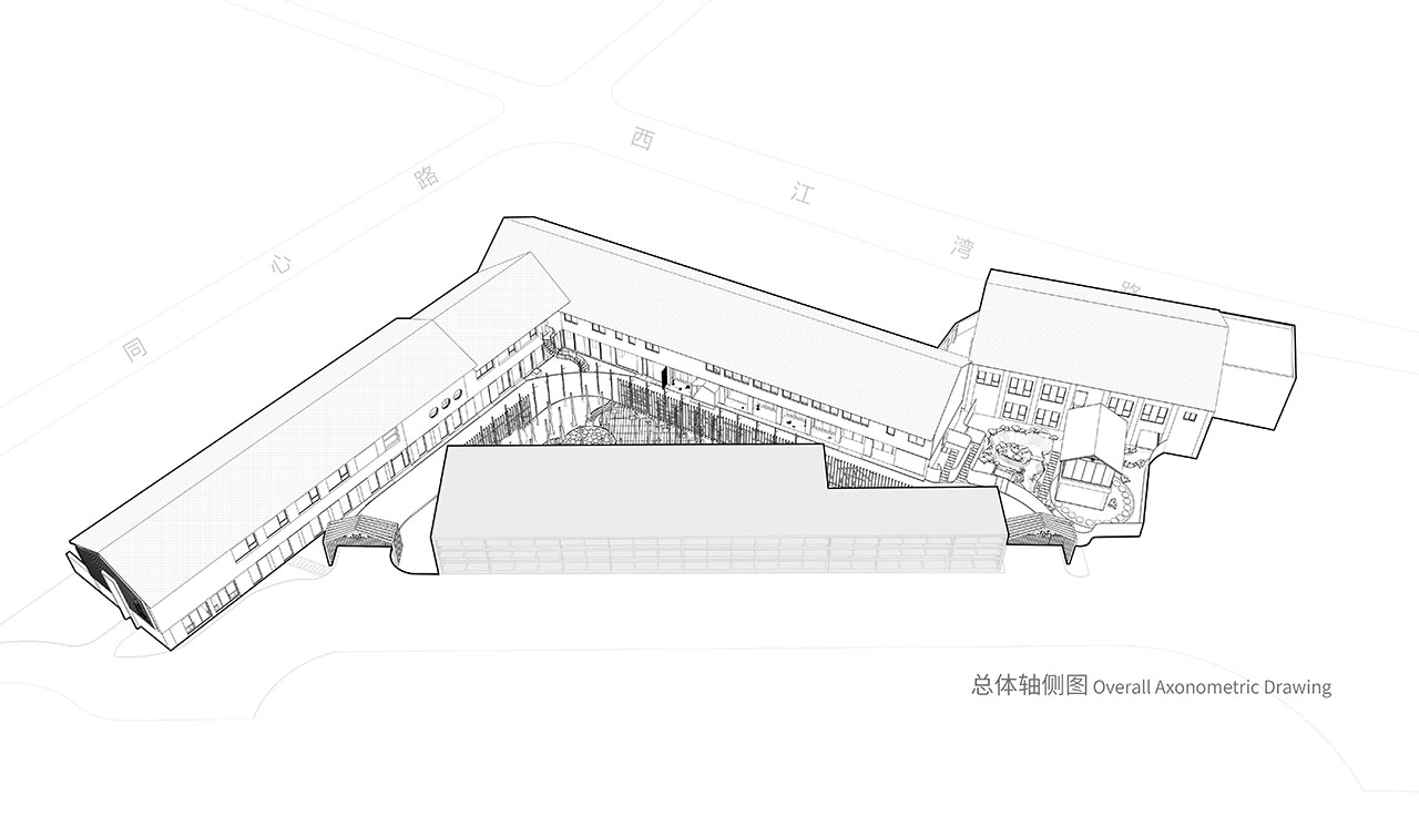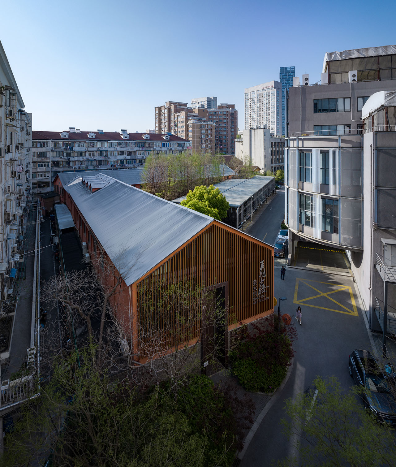 建筑建成时间不一,质量也各异,除了以绿化景观来作为统一维度外,针对每幢建筑的改造手段也各不相同。折尺型的3、4号楼,尽管建造时间最晚,但是相对的质量却最差,我们不仅重新组织了内部空间,而且更换了外立面材质和颜色,所有的门窗均被替换,破损的瓦屋面更新为铝镁锰屋面。木构屋架被保留下来,成为空间重要的时间纽带。建筑相比初始,呈现了截然不同的面貌。5、6号楼为两幢独立的建筑。5号楼由于质量太差,我们选择了原址重建,由砖混结构,改为钢木结构。6号楼则是大部分保留的基础上进行加固和翻修,尽管建造时间最早,但是结构和部件的状况和成色却是最好的。建筑的区别很大,但是有个重要的共同点,都采用了木结构的屋架,这也成为整个空间的重要特色。在不同的功能空间,木结构屋架都扮演了极其重要的角色,跟随空间角色的要求,采用不同的颜色和表面处理,构件清晰的标识出了建筑的历史传承。