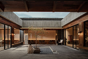 多边体顶部与东侧分别开有圆形洞口和拱形窗口,避免阳光直射,让光线从不同角度、不同方向进入,在室内形成光感的多层次。在多边体与玻璃盒子之间形成的天井,植入一棵百年老树,形成内外近景远景相呼应。