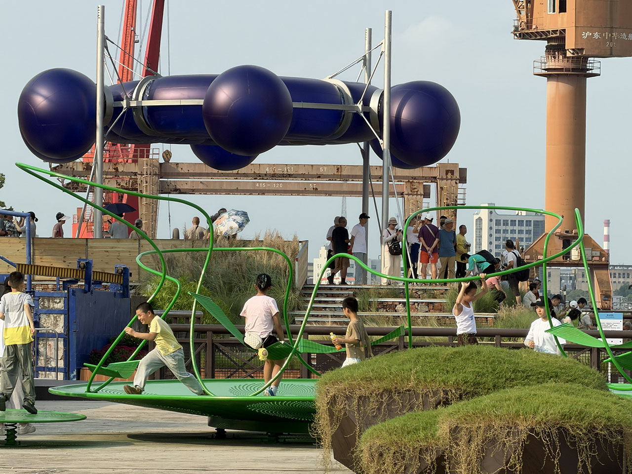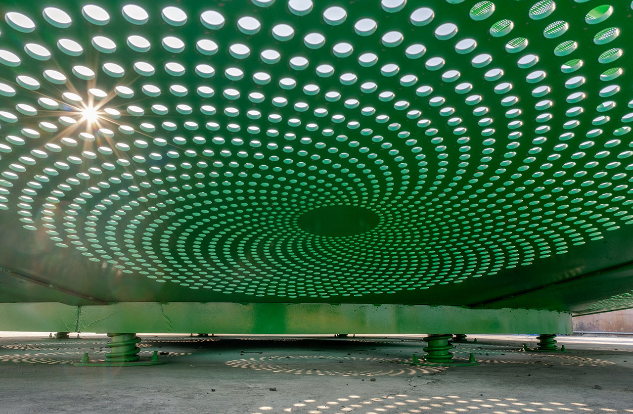 在2025年上海城市空间艺术季上,复兴岛船台公园的江畔,升起了一座动态的“绿色太阳”,我们将其命名为“太阳机器”。
