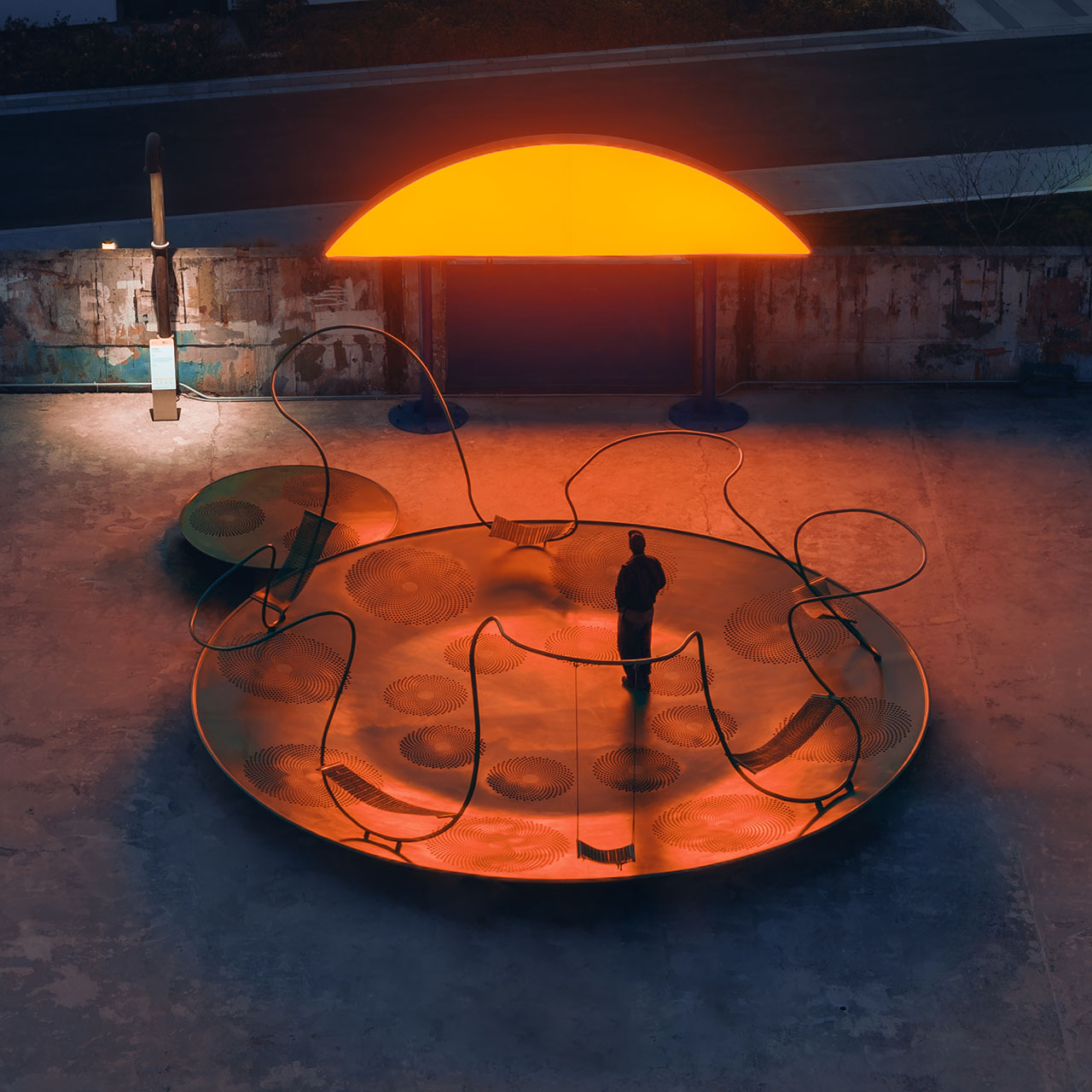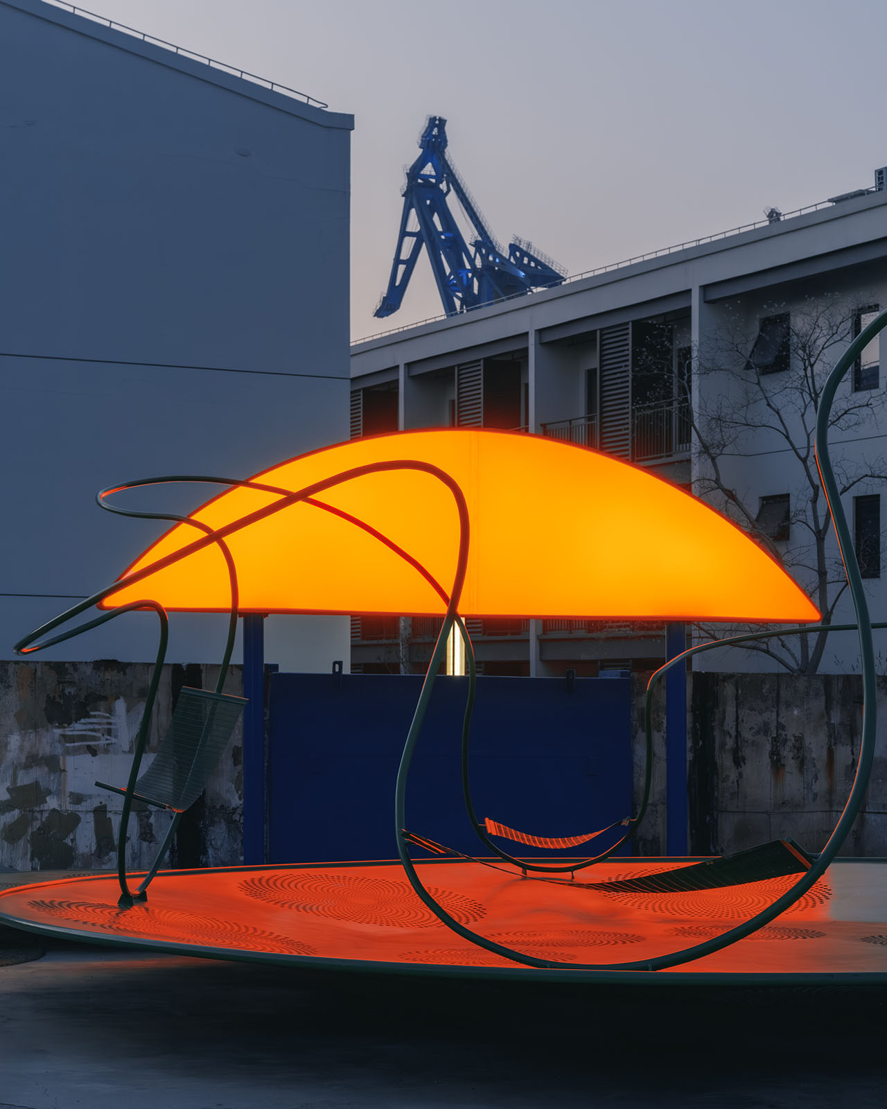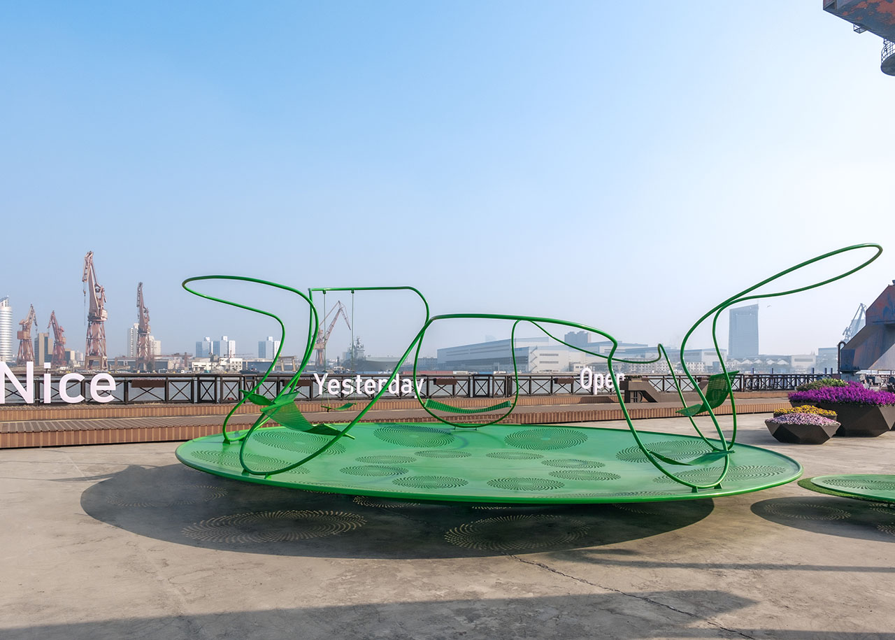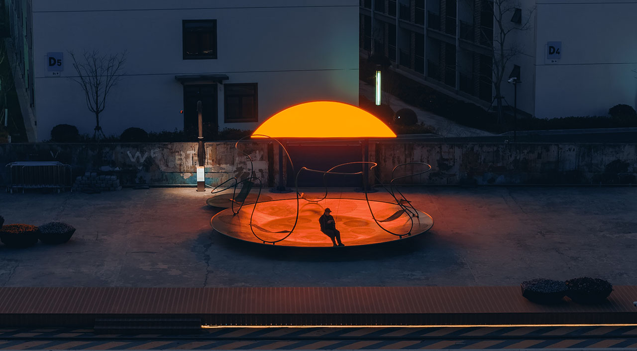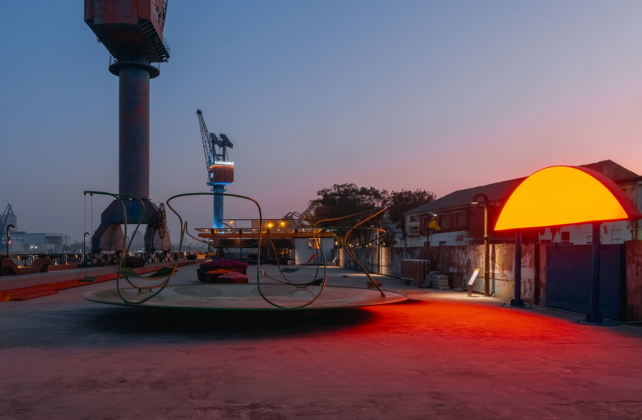 船台公园前身为中华造船厂,城市斗转星移,而这里似乎并未发生太多变化,因此,厂房、巨大塔吊、轨道便将一种浓厚的工业氛围锚定进具体场域。昔日的造船声响犹在耳畔,机器叮咚不停歇。这一次,童年记忆里街头公园的游乐设施被我们搬运至这样的场景之中,融合持续运转的机器与辐射能量的太阳两种符号意象,用内凹形的金属圆盘与半圆形橙红灯具,向外传递着可被直观感知的共鸣。