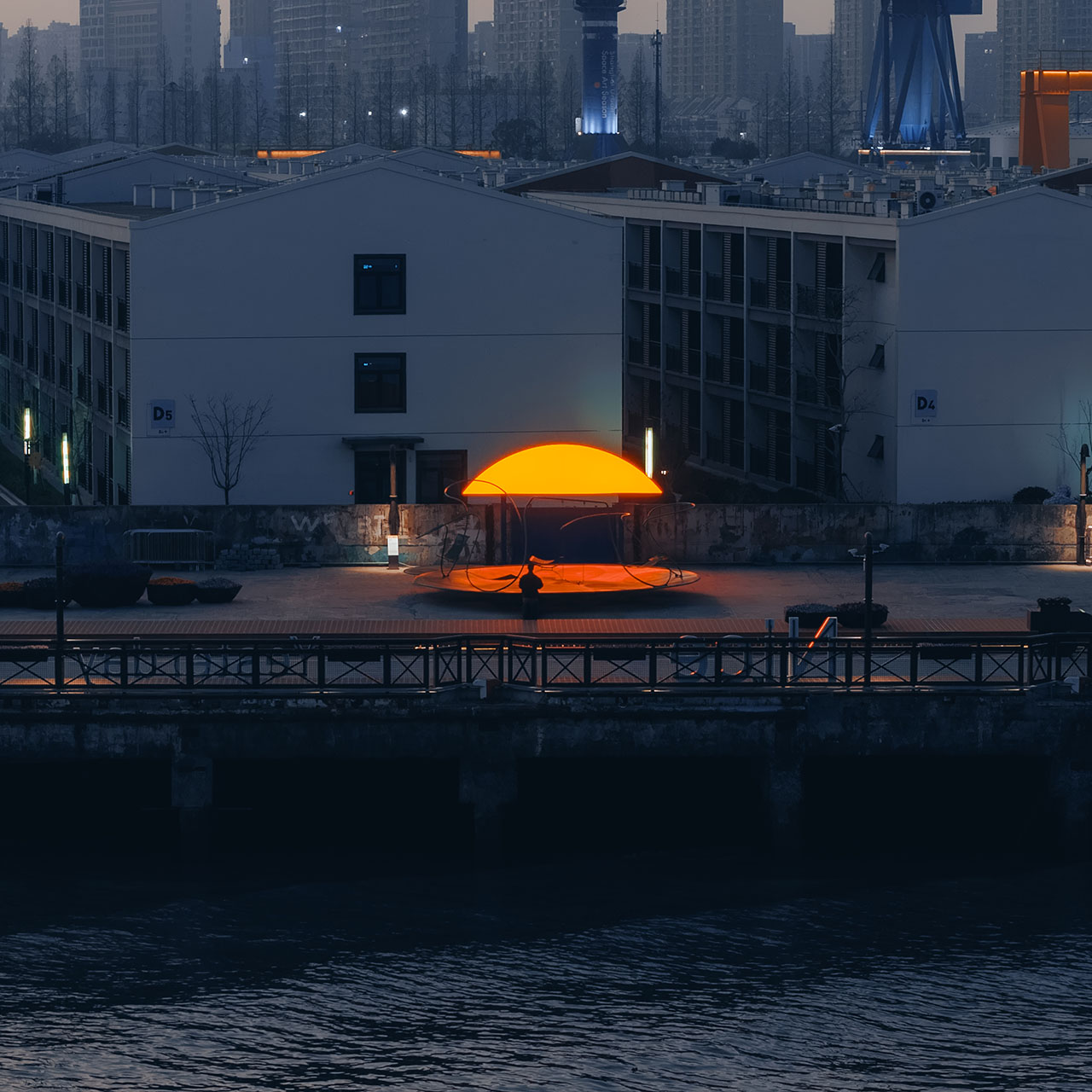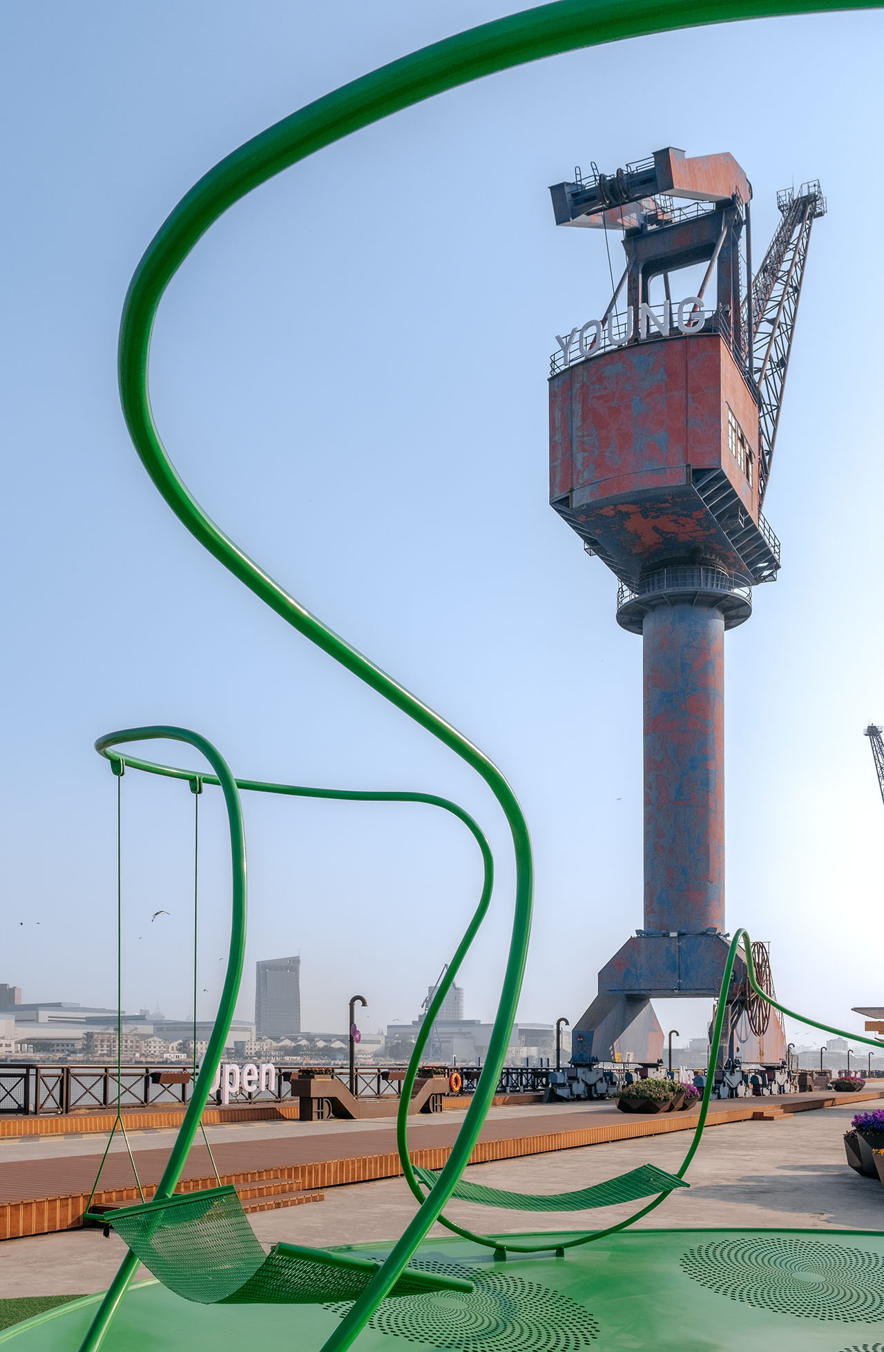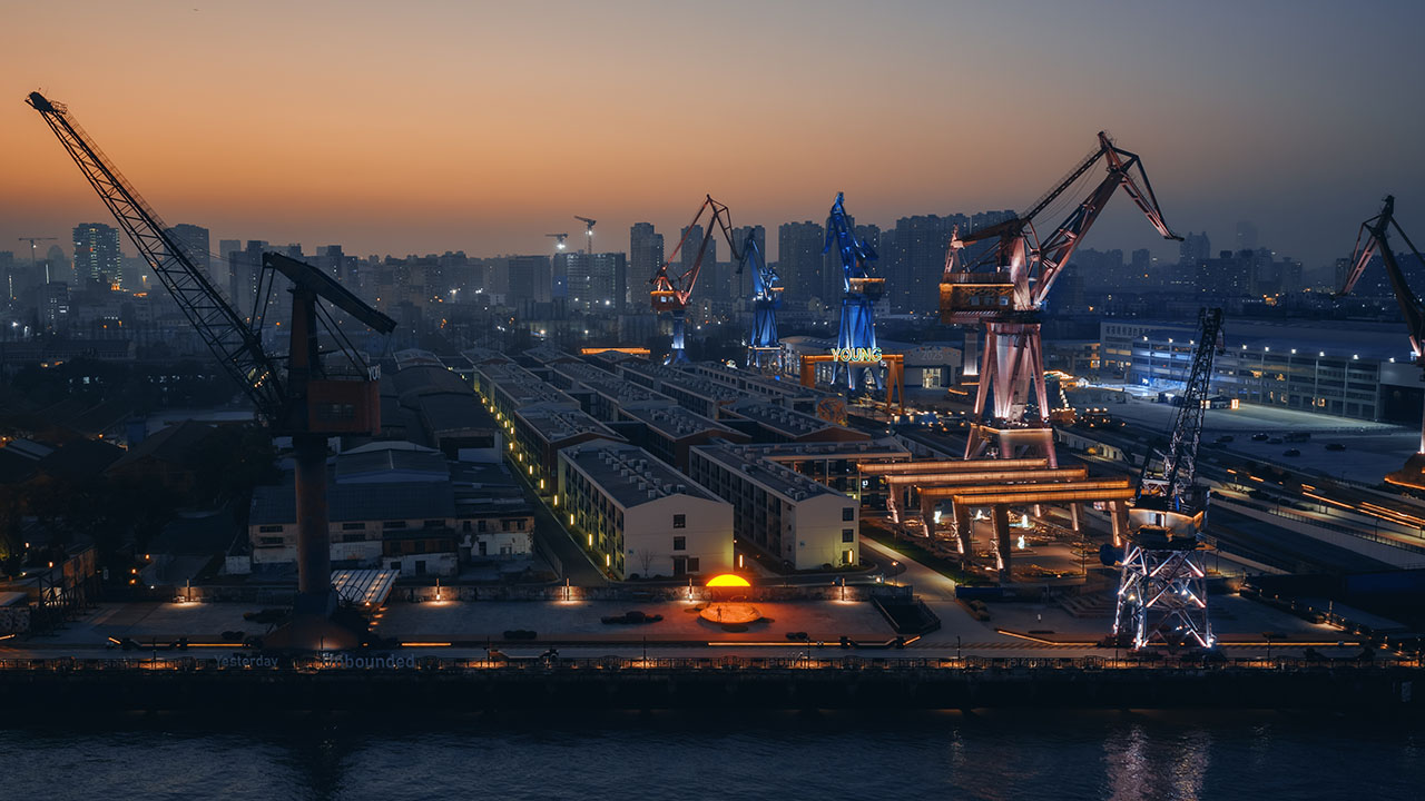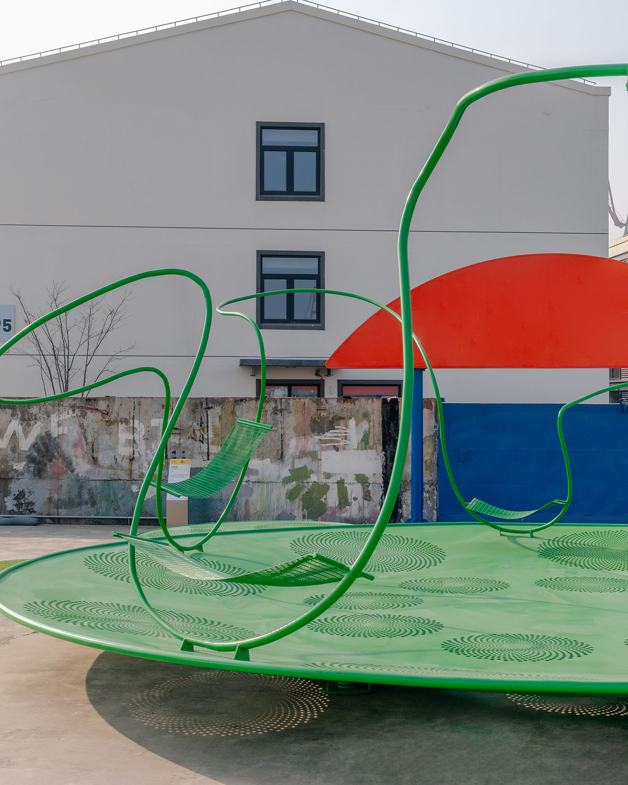 船台公园前身为中华造船厂,城市斗转星移,而这里似乎并未发生太多变化,因此,厂房、巨大塔吊、轨道便将一种浓厚的工业氛围锚定进具体场域。昔日的造船声响犹在耳畔,机器叮咚不停歇。这一次,童年记忆里街头公园的游乐设施被我们搬运至这样的场景之中,融合持续运转的机器与辐射能量的太阳两种符号意象,用内凹形的金属圆盘与半圆形橙红灯具,向外传递着可被直观感知的共鸣。