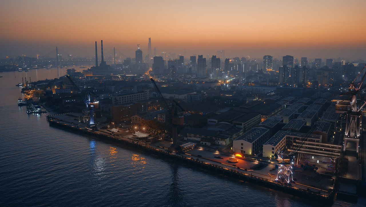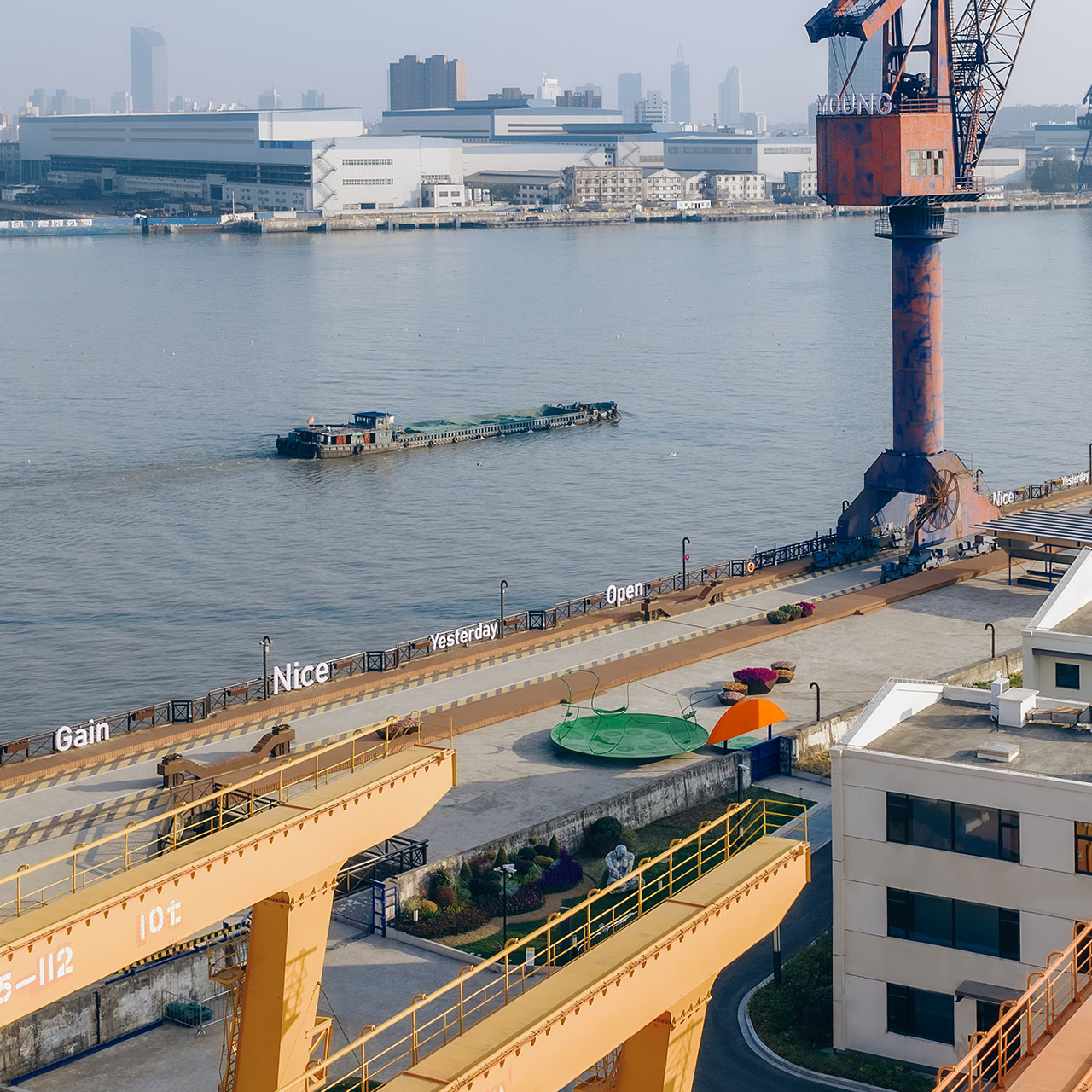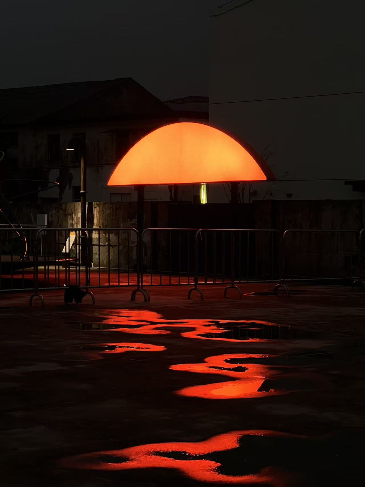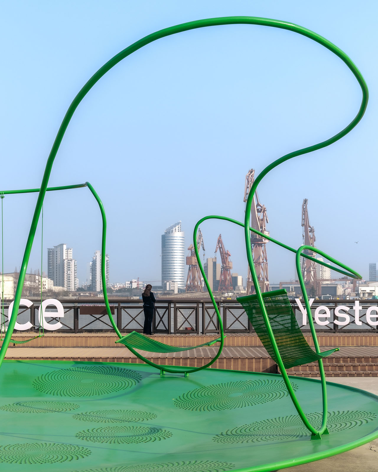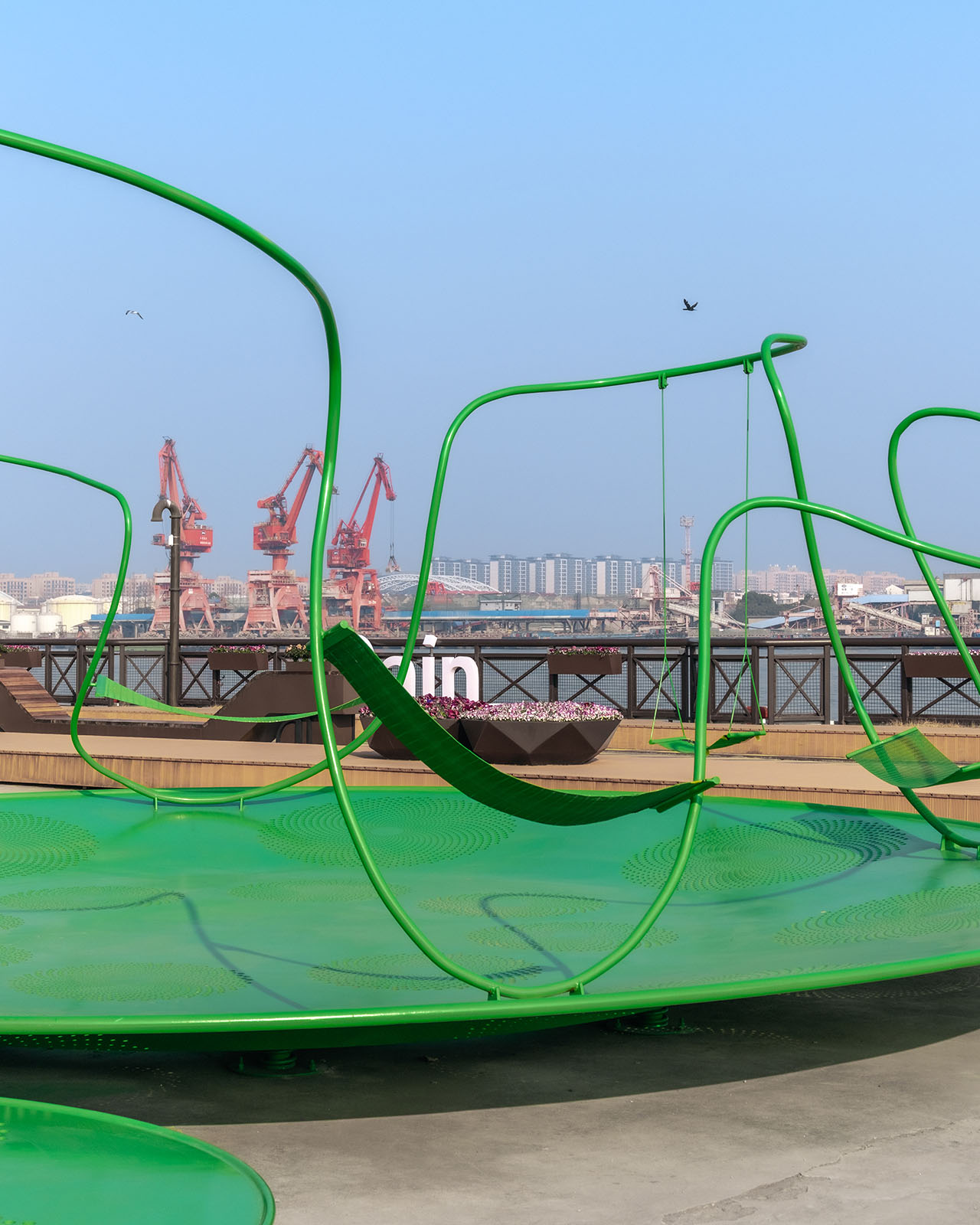 船台公园前身为中华造船厂,城市斗转星移,而这里似乎并未发生太多变化,因此,厂房、巨大塔吊、轨道便将一种浓厚的工业氛围锚定进具体场域。昔日的造船声响犹在耳畔,机器叮咚不停歇。这一次,童年记忆里街头公园的游乐设施被我们搬运至这样的场景之中,融合持续运转的机器与辐射能量的太阳两种符号意象,用内凹形的金属圆盘与半圆形橙红灯具,向外传递着可被直观感知的共鸣。