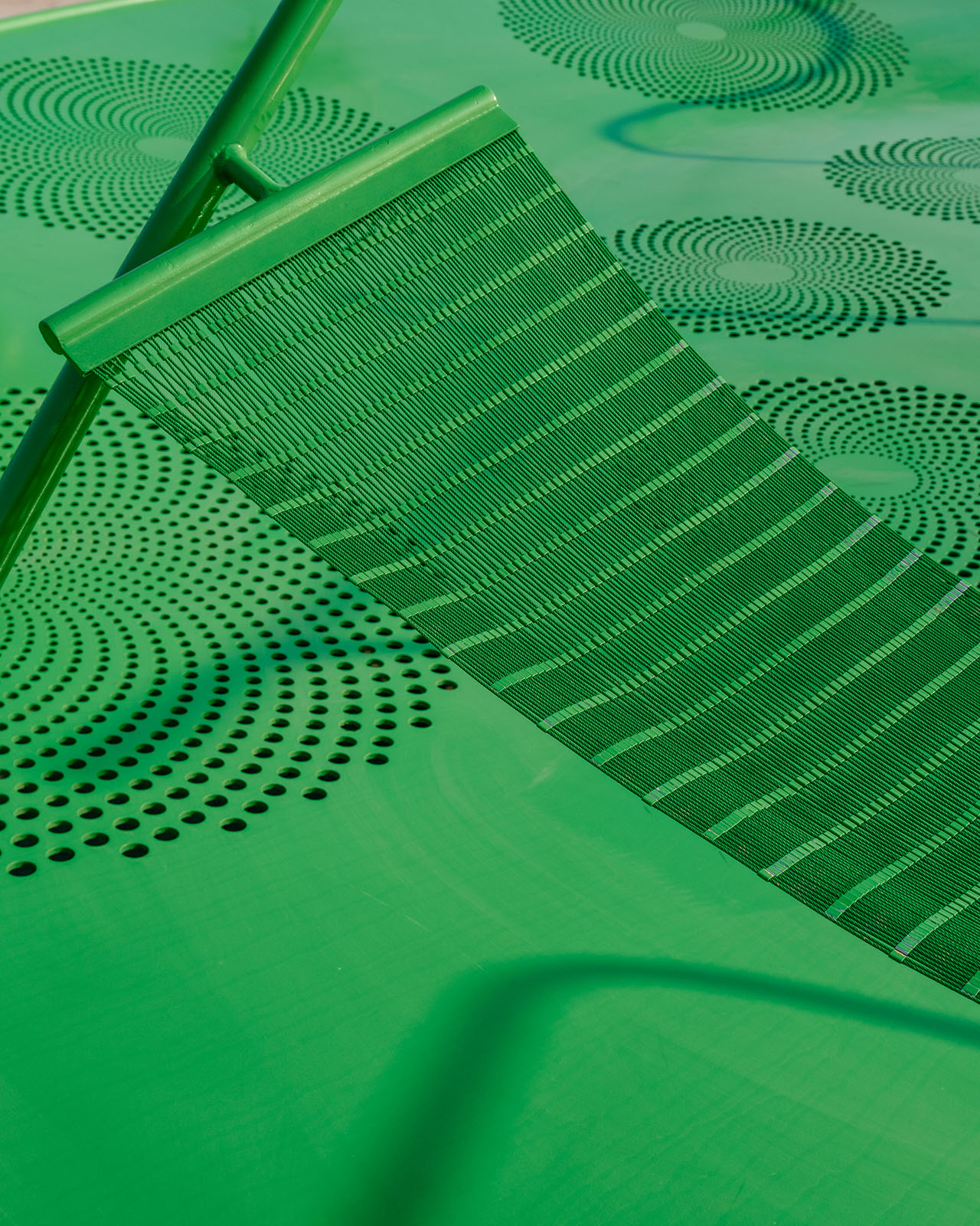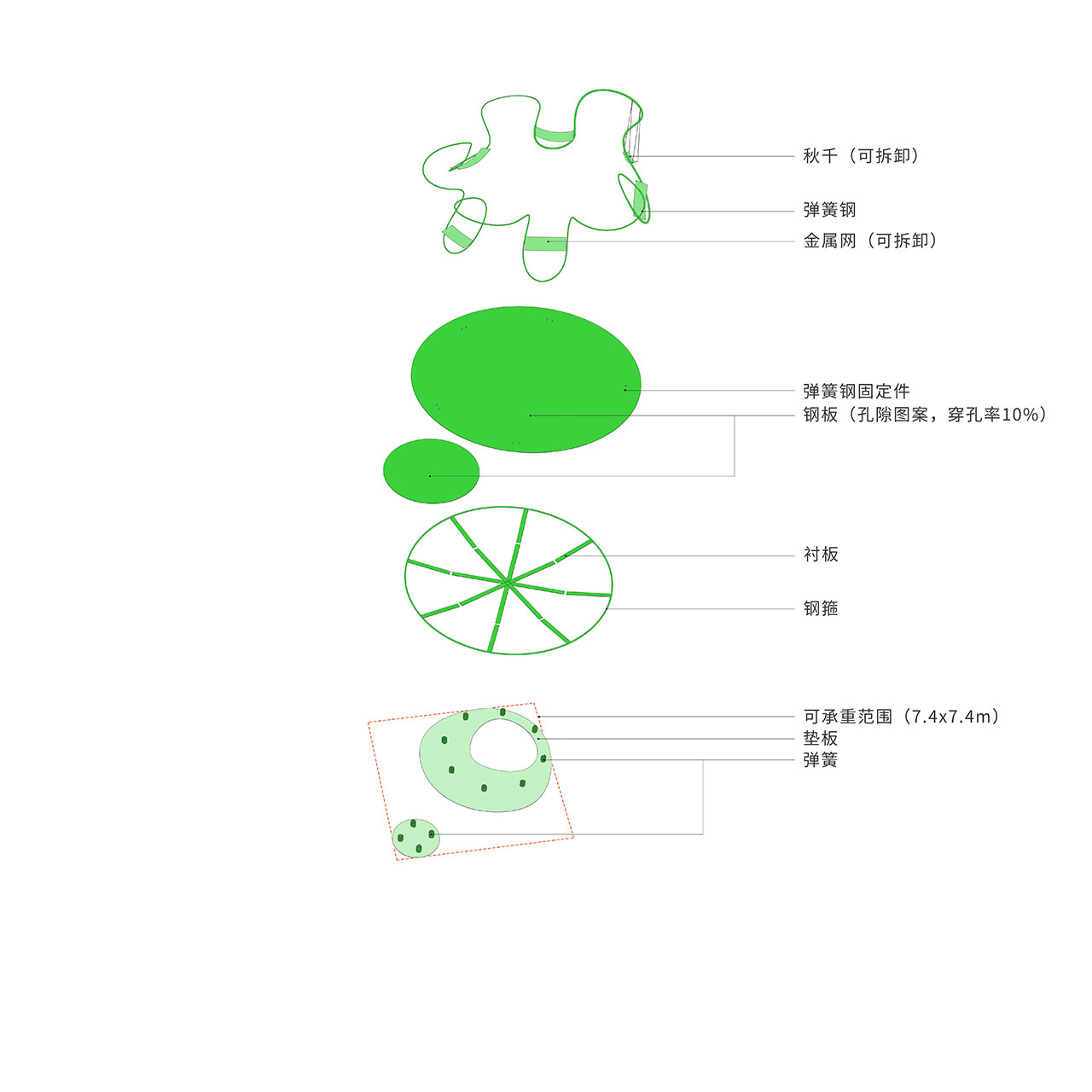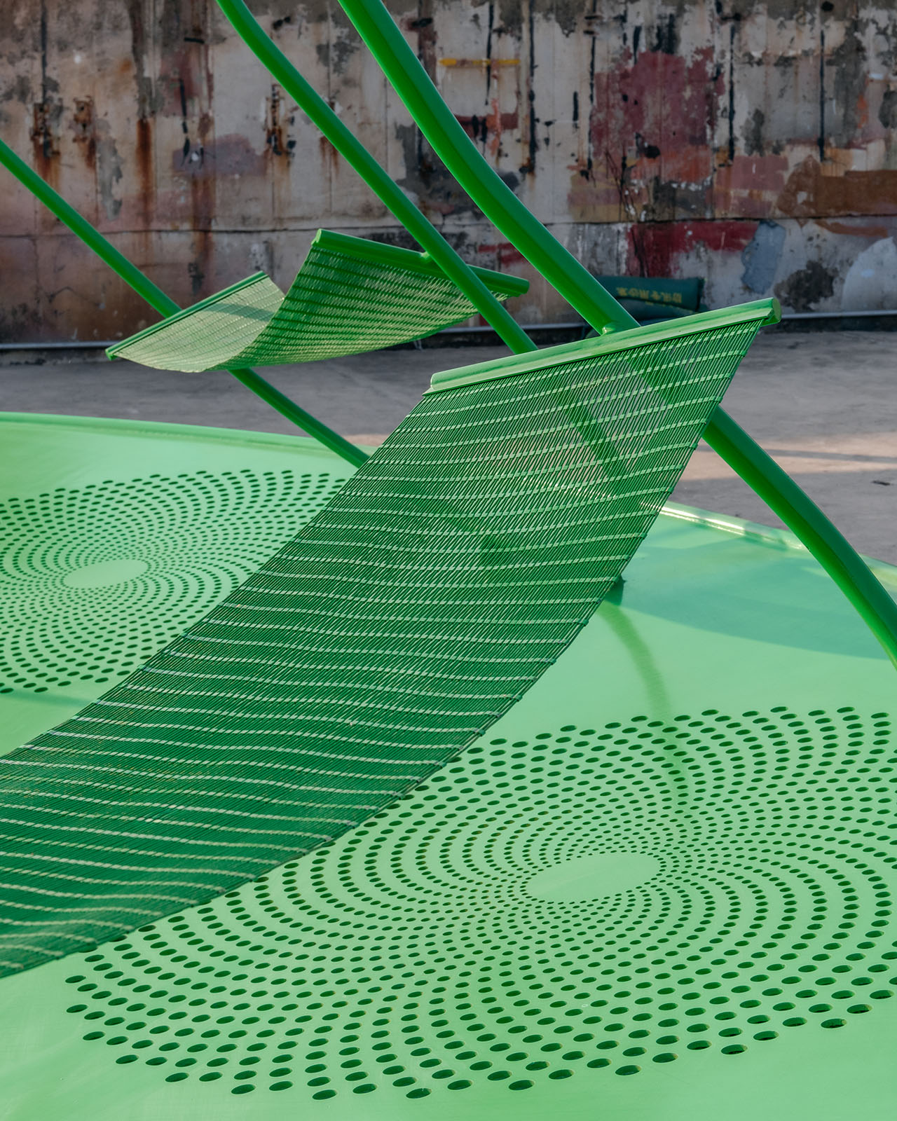 装置的核心互动平台近似正圆形,用直白的形式语言将装置与“太阳”这一自然符号联系起来。一对圆盘一大一小,一高一低,二者均被底座边缘的一圈弹簧支撑。底座之上,转译健身单杠符号的曲线栏杆悬挑发散,金属编织防护网和秋千错落着穿插其中,这台机器至此便已“组装”完成。机器处处充满“弹性”,随着蹦跳的人群摆动。夜幕降临,圆盘近旁的灯光散发出深红色光晕,笼罩着绿色机器及其周围空间,幽幽红光如落日似朝霞,持续散发着某种原始吸引力,用超自然空间氛围吸引游人本能地靠近。