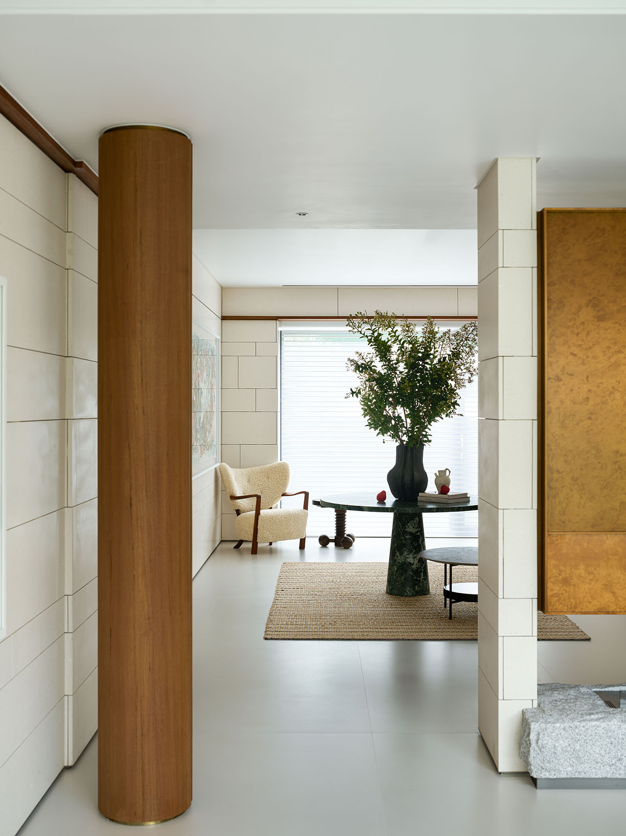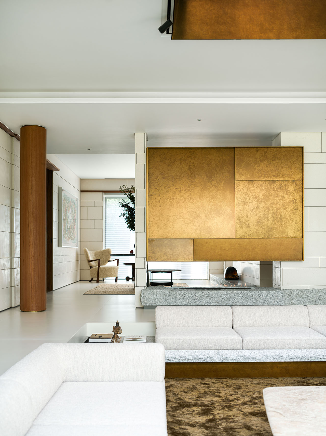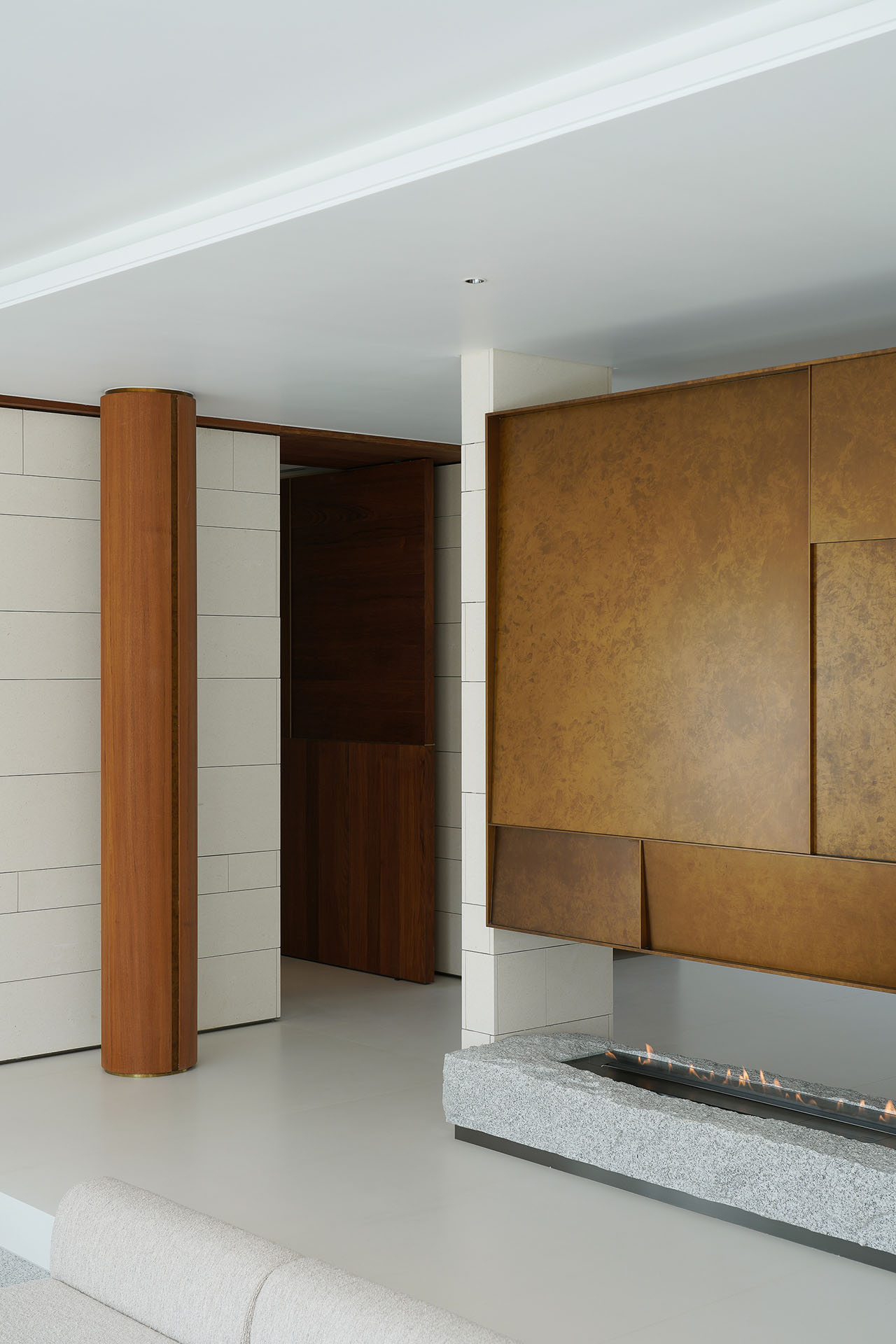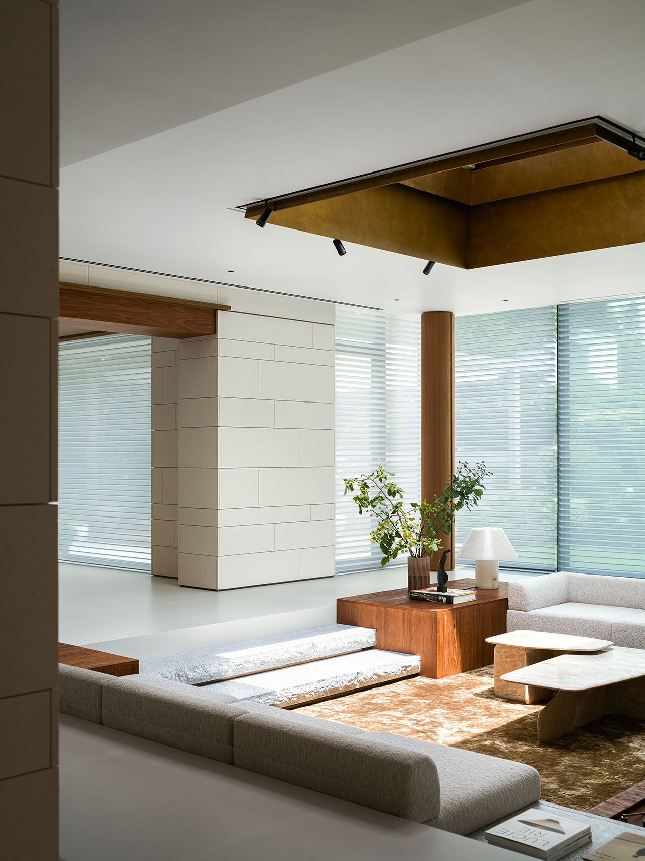 立于客厅四角的钢结构立柱并未被隐藏,反而用柚木饰面环包并嵌入精致的铜线,使之如同空间中的雕塑,既是结构的支撑,也是视觉的韵律。它们与上方天窗仿铜材质相呼应,这种“结构即装饰”的诚实表达,赋予空间一幅挺拔而优雅的骨相。