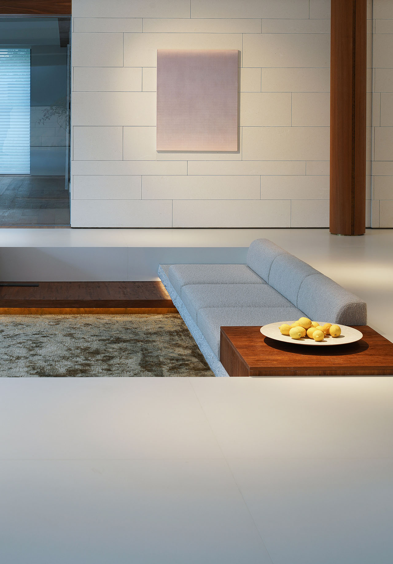 下沉的原始结构顺势改造成沙发的围合区域,天窗以阶梯式层叠,在开放的大空间中界定出一个充满安全感的围合区域。