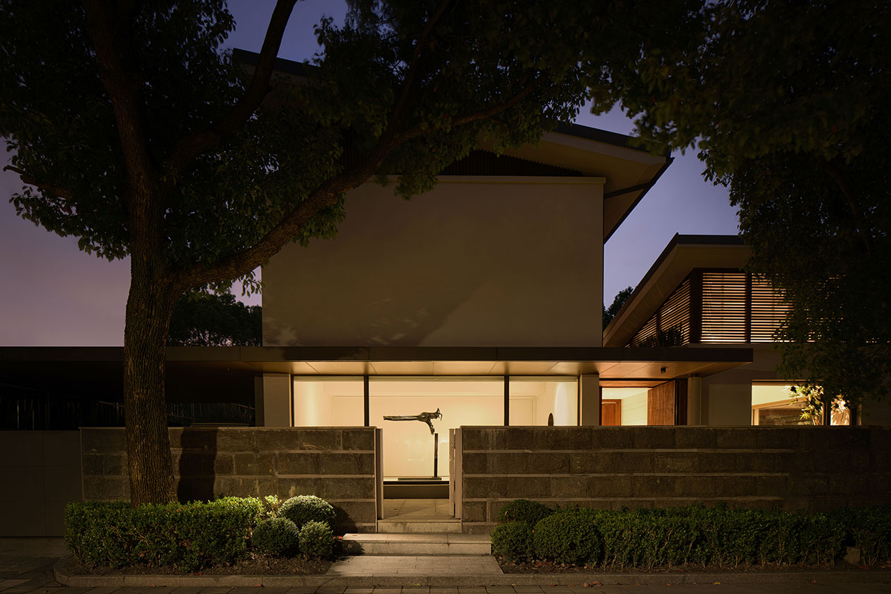这座隐于树丛下的居所并不被封闭为孤傲的城堡,而是以一种更谦逊、更开放的姿态与周遭对话:围墙压低,借景于外,湖畔的绿意与家的静谧产生微妙的渗透。