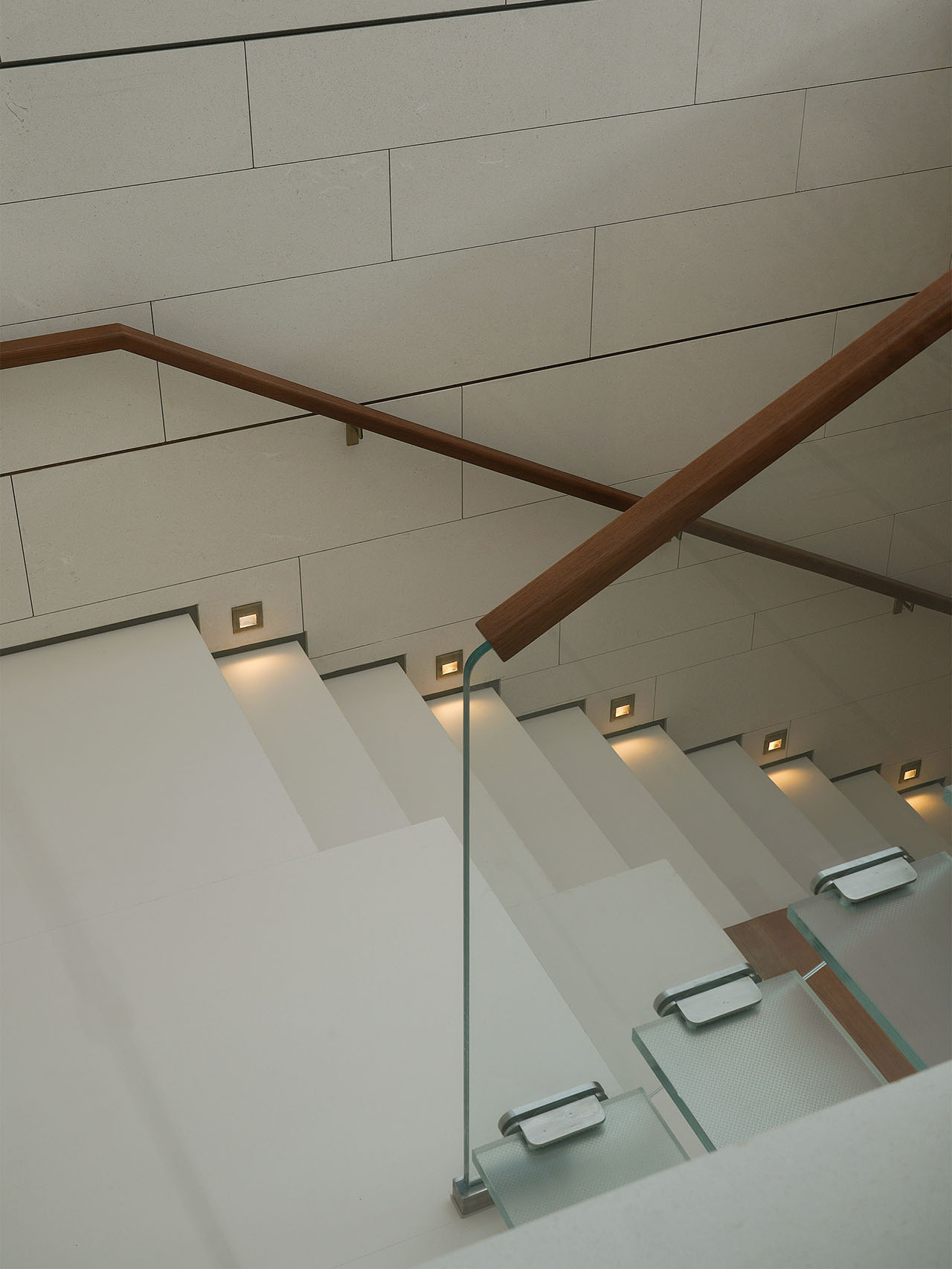 通向地下室的台阶,是一次大胆的“减法”。为了缓解地下空间的压抑感,第一段踏步以磨砂玻璃作为过渡,光线得以更充分地进入空间;第二段踏步结合座面放大活动空间,成为孩子们摆放爱好与全家观影的最佳席位。