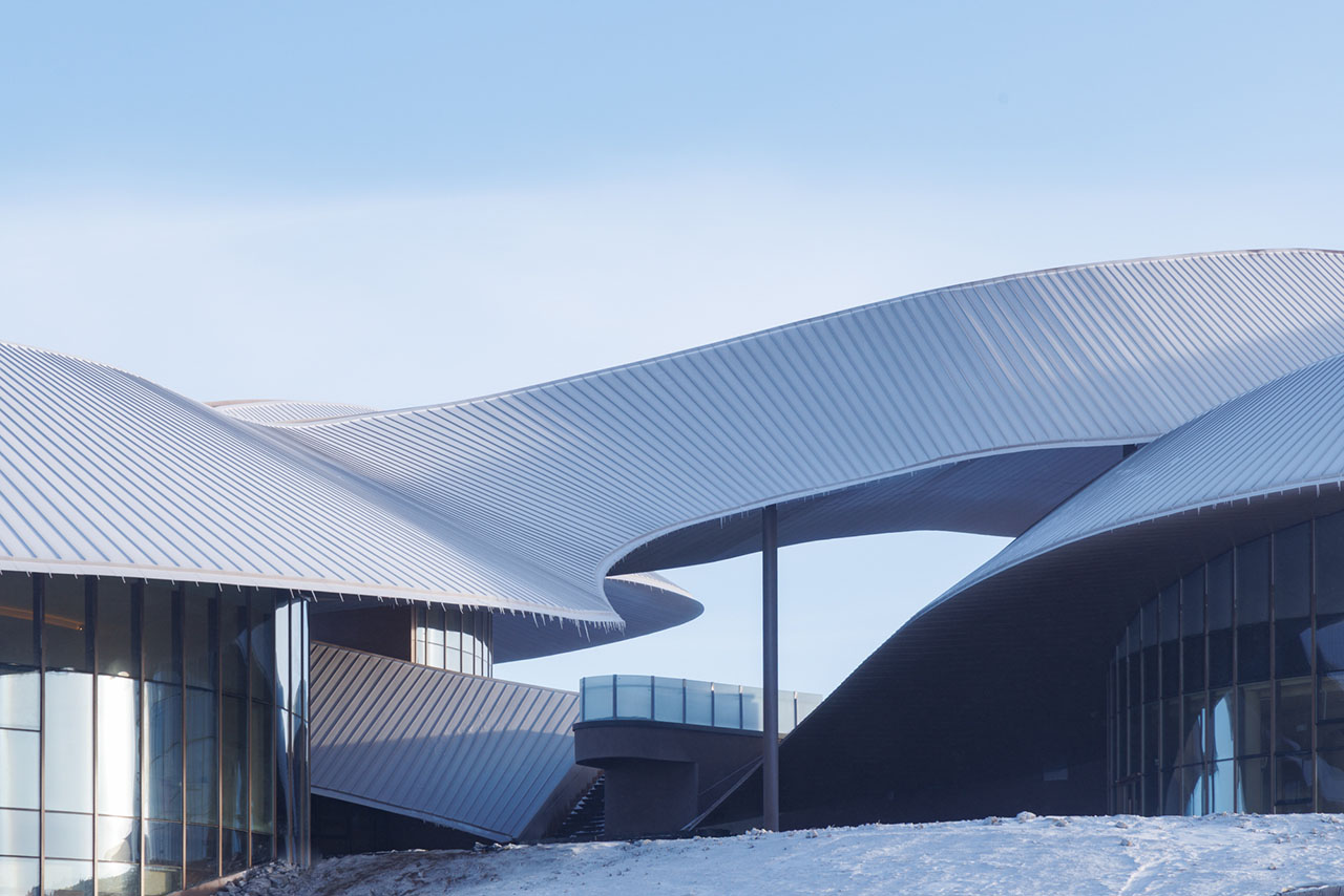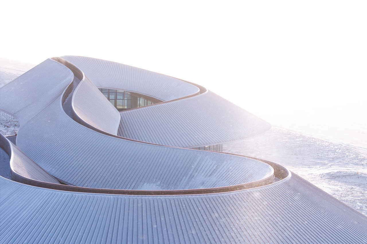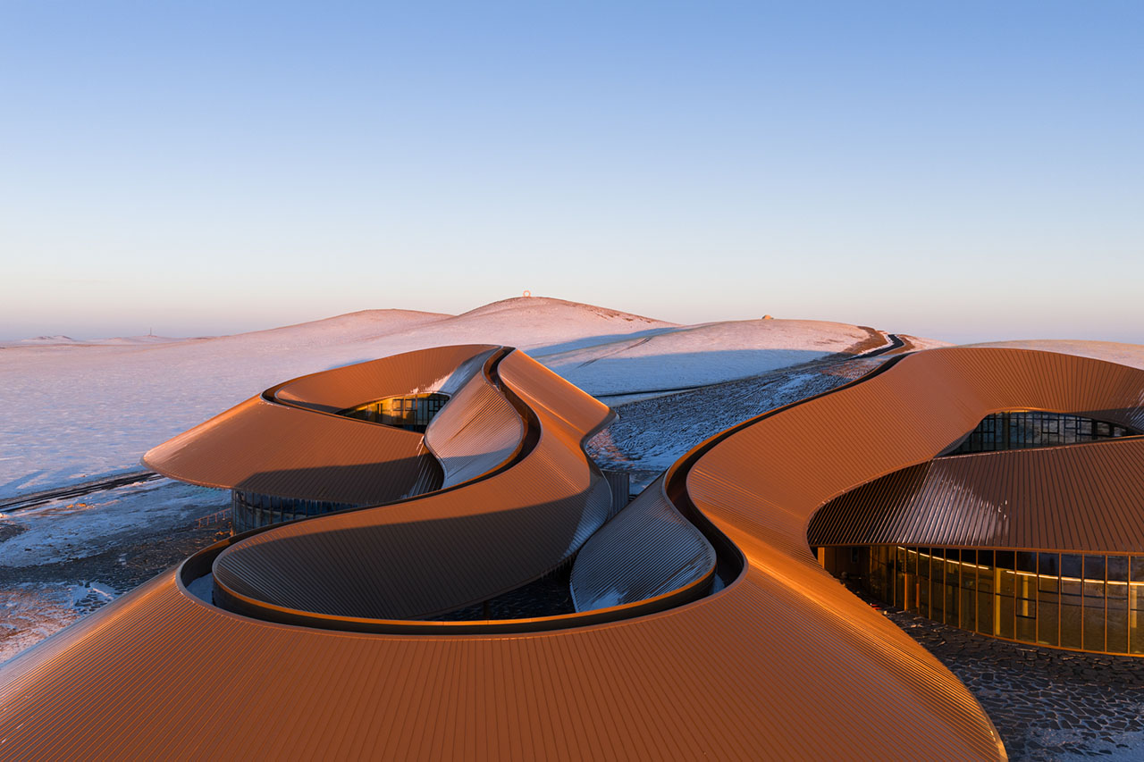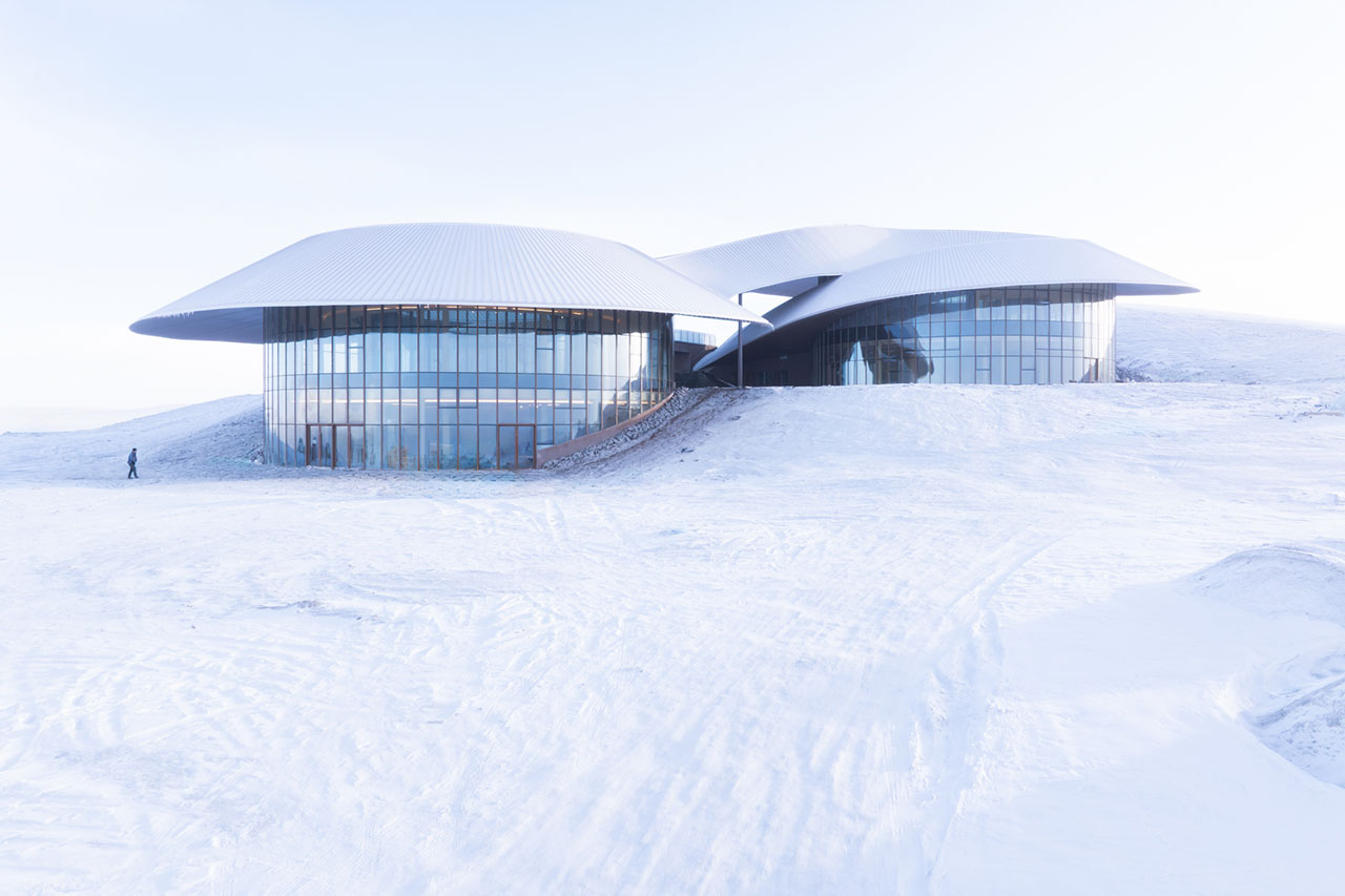 白银库伦属温带大陆气候,冬春之际常遇白毛风,为应对既有场地面对的气候问题,建筑通过弧形轮廓和立面在风雪肆虐盘旋之际降低风的剪力;出檐垂悬的屋面结构为室外中庭挡雪防风,为室内的人勾勒出周边的火山群脉景框,与反映环境的玻璃幕融入场地。