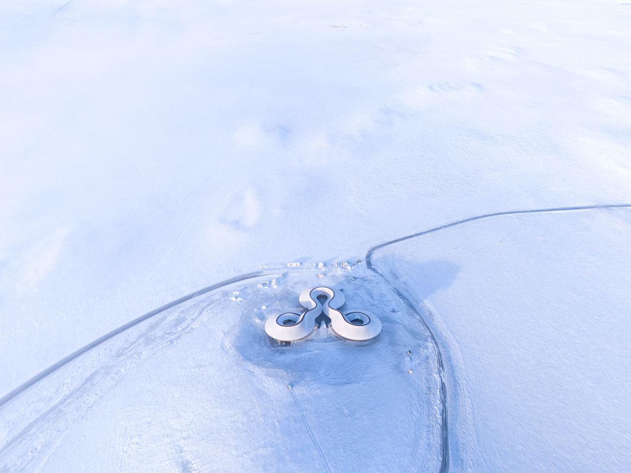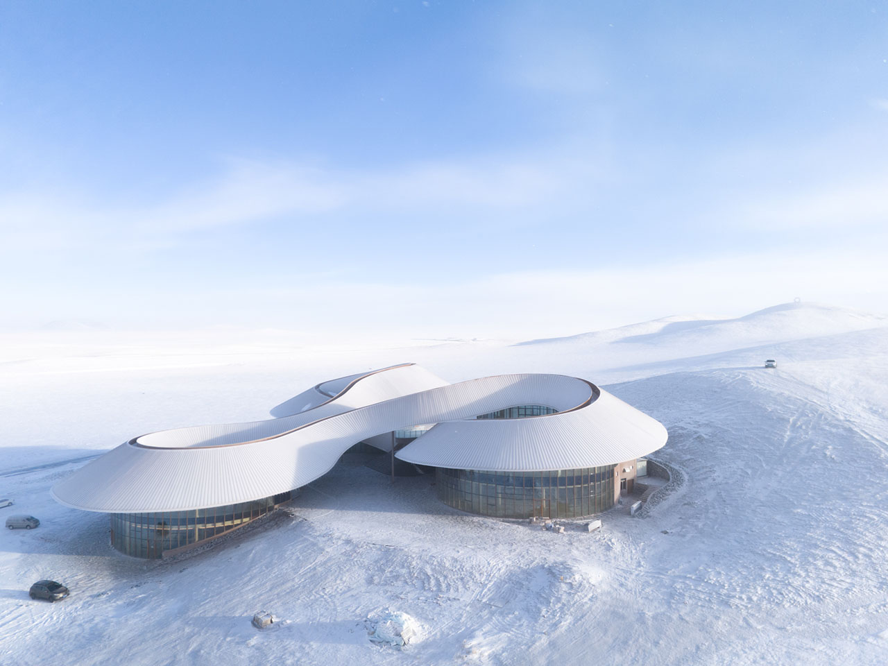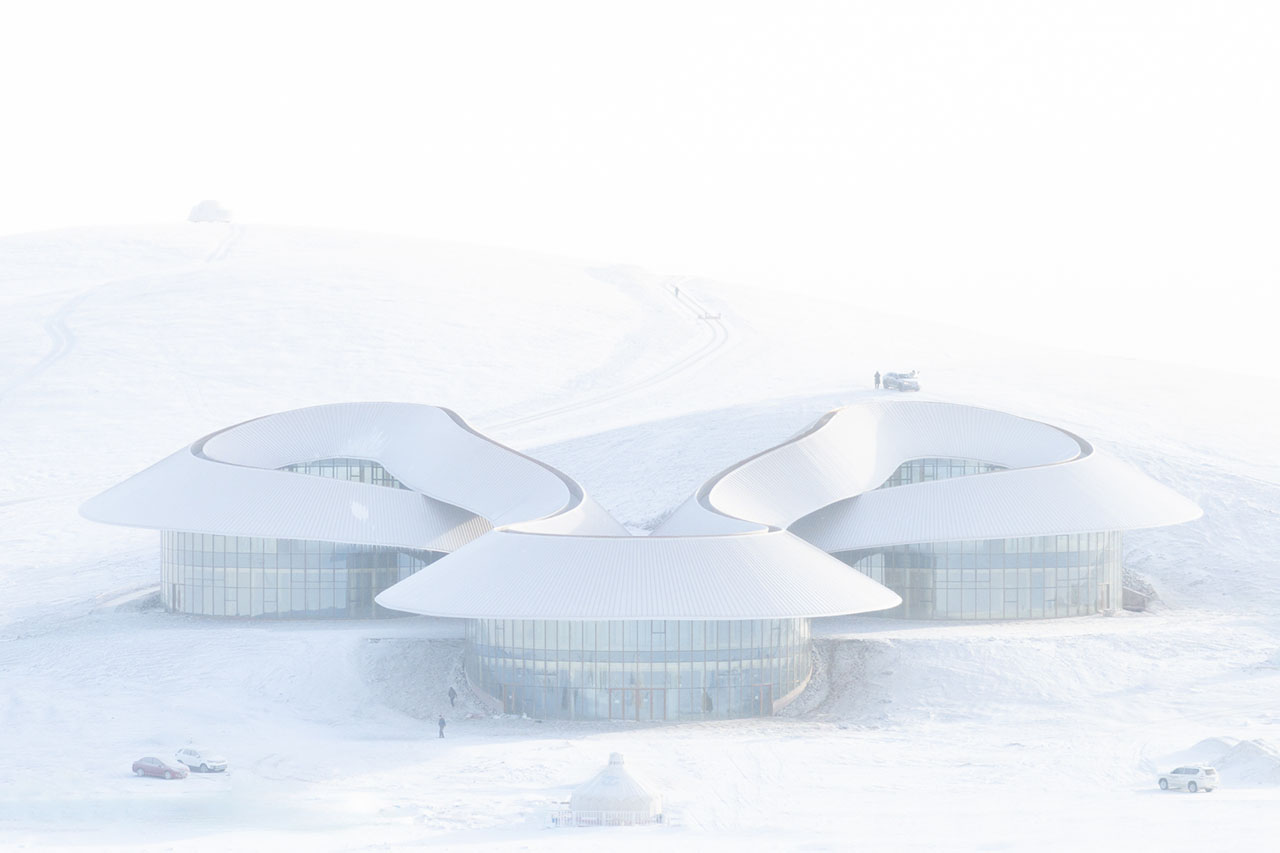 白银库伦属温带大陆气候,冬春之际常遇白毛风,为应对既有场地面对的气候问题,建筑通过弧形轮廓和立面在风雪肆虐盘旋之际降低风的剪力;出檐垂悬的屋面结构为室外中庭挡雪防风,为室内的人勾勒出周边的火山群脉景框,与反映环境的玻璃幕融入场地。