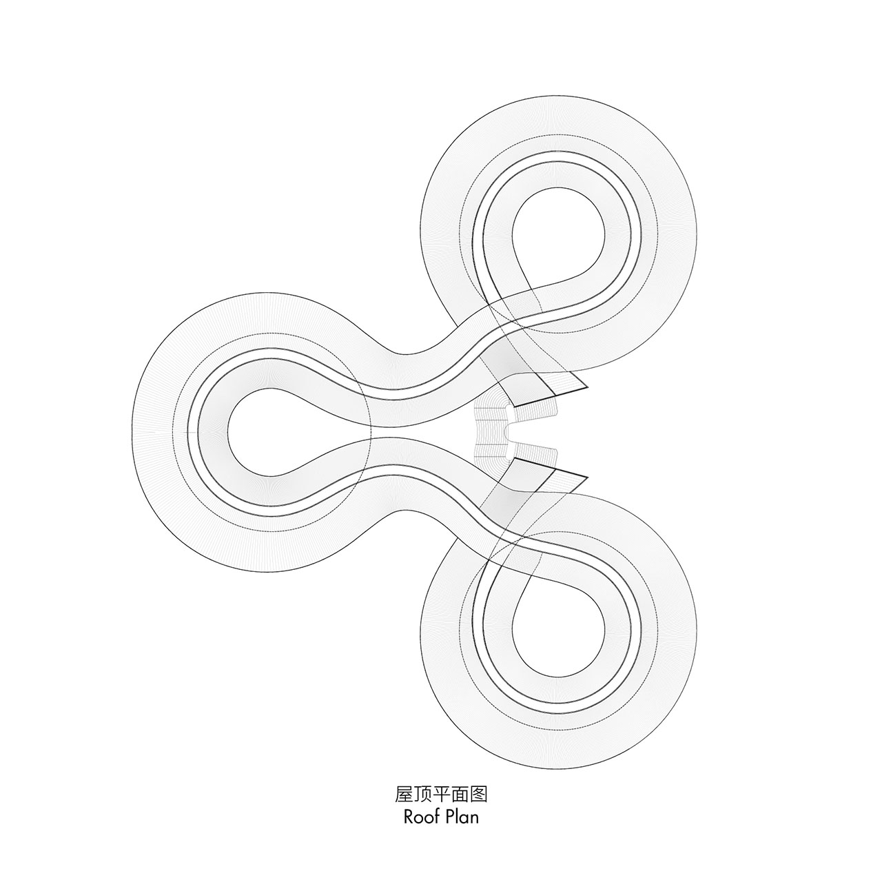 游客中心的核心概念基于建筑应如何与所在的火山锥共处,如何与周围草原火山群脉对话,如何创造人在火山环境中身心沉浸的体验。建筑师以“火山是主角”的宗旨推演建筑的构成。弧形流线的建筑屋面轮廓和三个基于地形标高错落布局的环形体量形成人对火山的第一印象——火山锥;一条循环立体漫游式廊道以螺旋的空间迷宫游径连接三个体量,在274m长的屋顶漫游廊道环游,外观火山群脉、草原、沙地、湖泊的辽阔图景,形成漫游天然火山环般的建筑体验。