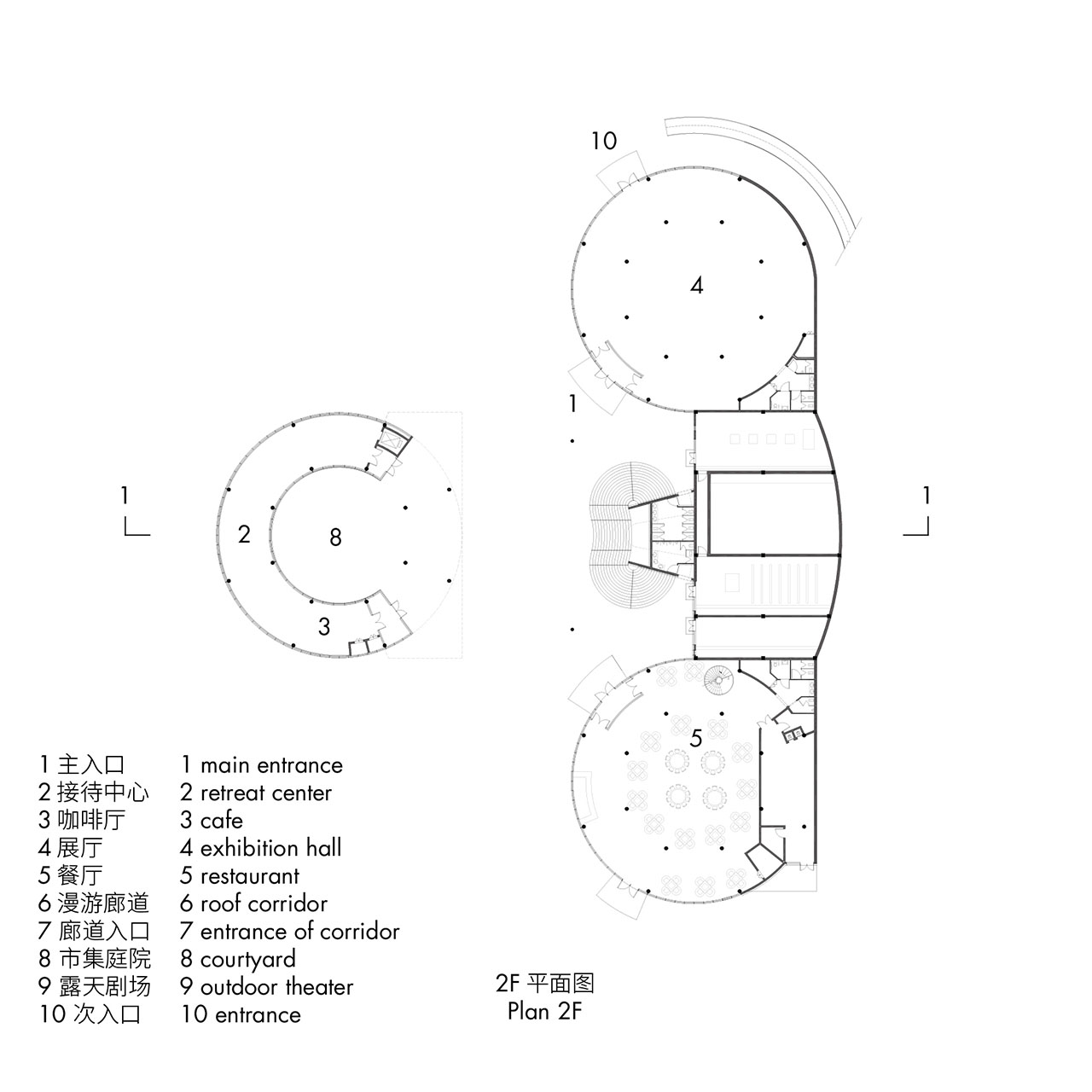 从屋顶廊道向内看,是火山的第三重印象——火山口,被锥形屋面庇护的功能位于其中,三个独立体块根据运营需求,室内分别承担游客接待、咖啡书屋,展览、办公,餐厅等功能,更具开放空间需求的文创市集位于游客中心建筑二层的环形中庭,室外露天剧场置于上层展览与餐厅建筑之间的广场,观众看台沿着东侧放坡阶式布局,眼前是建筑“火山环“的流线,远处是火山群脉和草原缓丘的舒展绵延。
